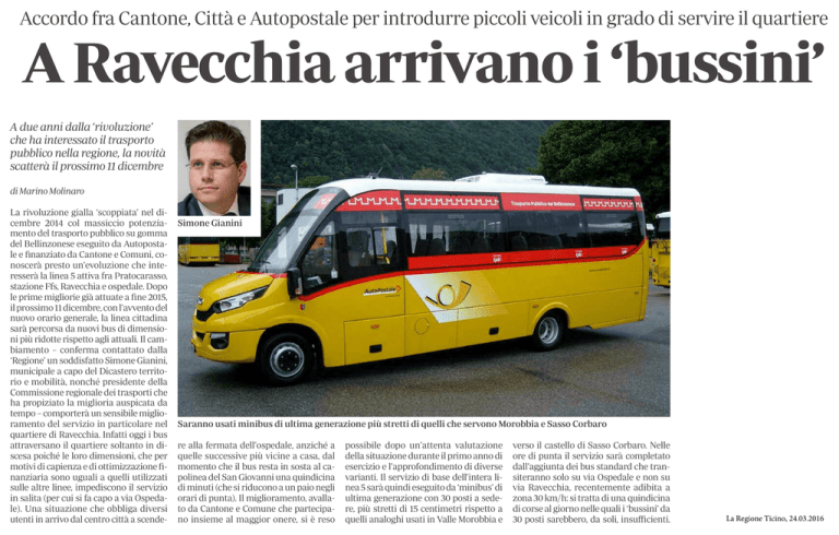 Accordo fra Cantone, Città e Autopostale per introdurre piccoli veicoli in grado di servire il quartiere A Ravecchia arrivano i ‘bussini’ A due anni dalla ‘rivoluzione’ che ha interessato il trasporto pubblico nella regione, la novità scatterà il prossimo 11 dicembre di Marino Molinaro La rivoluzione gialla ‘scoppiata’ nel dicembre 2014 col massiccio potenziamento del trasporto pubblico su gomma del Bellinzonese eseguito da Autopostale e finanziato da Cantone e Comuni, conoscerà presto un’evoluzione che interesserà la linea 5 attiva fra Pratocarasso, stazione Ffs, Ravecchia e ospedale. Dopo le prime migliorie già attuate a fine 2015, il prossimo 11 dicembre, con l’avvento del nuovo orario generale, la linea cittadina sarà percorsa da nuovi bus di dimensioni più ridotte rispetto agli attuali. Il cambiamento – conferma contattato dalla ‘Regione’ un soddisfatto Simone Gianini, municipale a capo del Dicastero territorio e mobilità, nonché presidente della Commissione regionale dei trasporti che ha propiziato la miglioria auspicata da tempo – comporterà un sensibile miglioramento del servizio in particolare nel quartiere di Ravecchia. Infatti oggi i bus attraversano il quartiere soltanto in discesa poiché le loro dimensioni, che per motivi di capienza e di ottimizzazione finanziaria sono uguali a quelli utilizzati sulle altre linee, impediscono il servizio in salita (per cui si fa capo a via Ospedale). Una situazione che obbliga diversi utenti in arrivo dal centro città a scende- Simone Gianini Saranno usati minibus di ultima generazione più stretti di quelli che servono Morobbia e Sasso Corbaro re alla fermata dell’ospedale, anziché a quelle successive più vicine a casa, dal momento che il bus resta in sosta al capolinea del San Giovanni una quindicina di minuti (che si riducono a un paio negli orari di punta). Il miglioramento, avallato da Cantone e Comune che partecipano insieme al maggior onere, si è reso possibile dopo un’attenta valutazione della situazione durante il primo anno di esercizio e l’approfondimento di diverse varianti. Il servizio di base dell’intera linea 5 sarà quindi eseguito da ‘minibus’ di ultima generazione con 30 posti a sedere, più stretti di 15 centimetri rispetto a quelli analoghi usati in Valle Morobbia e verso il castello di Sasso Corbaro. Nelle ore di punta il servizio sarà completato dall’aggiunta dei bus standard che transiteranno solo su via Ospedale e non su via Ravecchia, recentemente adibita a zona 30 km/h: si tratta di una quindicina di corse al giorno nelle quali i ‘bussini’ da 30 posti sarebbero, da soli, insufficienti. La Regione Ticino, 24.03.2016