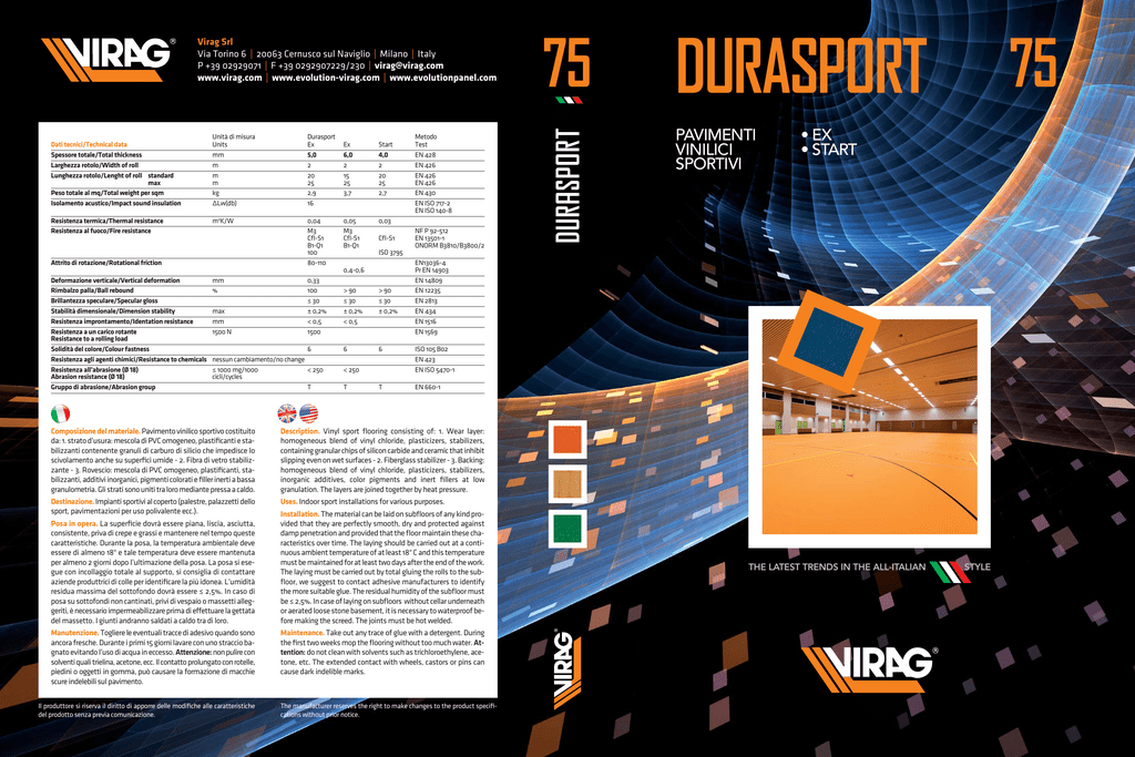 Virag Srl Via Torino 6 | 20063 Cernusco sul Naviglio | Milano | Italy P +39 02929071 | F +39 0292907229/230 | [email protected] www.virag.com | www.evolution-virag.com | www.evolutionpanel.com Dati tecnici/Technical data Spessore totale/Total thickness Larghezza rotolo/Width of roll Lunghezza rotolo/Lenght of roll standard max Peso totale al mq/Total weight per sqm Isolamento acustico/Impact sound insulation Resistenza termica/Thermal resistance Resistenza al fuoco/Fire resistance Unità di misura Units mm m m m kg ΔLw(db) Durasport Ex 5,0 2 20 25 2,9 16 m2K/W 0,04 M3 Cfl-S1 B1-Q1 100 80-110 Attrito di rotazione/Rotational friction Ex 6,0 2 15 25 3,7 Start 4,0 2 20 25 2,7 0,05 M3 Cfl-S1 B1-Q1 0,03 Cfl-S1 mm % max mm 1500 N 0,33 100 ≤ 30 ± 0,2% < 0,5 1500 6 nessun cambiamento/no change ≤ 1000 mg/1000 < 250 cicli/cycles T > 90 ≤ 30 ± 0,2% < 0,5 > 90 ≤ 30 ± 0,2% 6 6 ISO 105 B02 EN 423 EN ISO 5470-1 T EN 660-1 < 250 T Destinazione. Impianti sportivi al coperto (palestre, palazzetti dello sport, pavimentazioni per uso polivalente ecc.). Uses. Indoor sport installations for various purposes. Il produttore si riserva il diritto di apporre delle modifiche alle caratteristiche del prodotto senza previa comunicazione. • EX • START EN13036-4 Pr EN 14903 EN 14809 EN 12235 EN 2813 EN 434 EN 1516 EN 1569 Description. Vinyl sport flooring consisting of: 1. Wear layer: homogeneous blend of vinyl chloride, plasticizers, stabilizers, containing granular chips of silicon carbide and ceramic that inhibit slipping even on wet surfaces - 2. Fiberglass stabilizer - 3. Backing: homogeneous blend of vinyl chloride, plasticizers, stabilizers, inorganic additives, color pigments and inert fillers at low granulation. The layers are joined together by heat pressure. Manutenzione. Togliere le eventuali tracce di adesivo quando sono ancora fresche. Durante i primi 15 giorni lavare con uno straccio bagnato evitando l’uso di acqua in eccesso. Attenzione: non pulire con solventi quali trielina, acetone, ecc. Il contatto prolungato con rotelle, piedini o oggetti in gomma, può causare la formazione di macchie scure indelebili sul pavimento. PAVIMENTI VINILICI SPORTIVI 75 NF P 92-512 EN 13501-1 ONORM B3810/B3800/2 Composizione del materiale. Pavimento vinilico sportivo costituito da: 1. strato d’usura: mescola di PVC omogeneo, plastificanti e stabilizzanti contenente granuli di carburo di silicio che impedisce lo scivolamento anche su superfici umide - 2. Fibra di vetro stabilizzante - 3. Rovescio: mescola di PVC omogeneo, plastificanti, stabilizzanti, additivi inorganici, pigmenti colorati e filler inerti a bassa granulometria. Gli strati sono uniti tra loro mediante pressa a caldo. Posa in opera. La superficie dovrà essere piana, liscia, asciutta, consistente, priva di crepe e grassi e mantenere nel tempo queste caratteristiche. Durante la posa, la temperatura ambientale deve essere di almeno 18° e tale temperatura deve essere mantenuta per almeno 2 giorni dopo l’ultimazione della posa. La posa si esegue con incollaggio totale al supporto, si consiglia di contattare aziende produttrici di colle per identificare la più idonea. L’umidità residua massima del sottofondo dovrà essere ≤ 2,5%. In caso di posa su sottofondi non cantinati, privi di vespaio o massetti alleggeriti, è necessario impermeabilizzare prima di effettuare la gettata del massetto. I giunti andranno saldati a caldo tra di loro. DURASPORT ISO 3795 0,4-0,6 Deformazione verticale/Vertical deformation Rimbalzo palla/Ball rebound Brillantezza speculare/Specular gloss Stabilità dimensionale/Dimension stability Resistenza improntamento/Identation resistance Resistenza a un carico rotante Resistance to a rolling load Solidità del colore/Colour fastness Resistenza agli agenti chimici/Resistance to chemicals Resistenza all’abrasione (Ø 18) Abrasion resistance (Ø 18) Gruppo di abrasione/Abrasion group Metodo Test EN 428 EN 426 EN 426 EN 426 EN 430 EN ISO 717-2 EN ISO 140-8 75 Installation. The material can be laid on subfloors of any kind provided that they are perfectly smooth, dry and protected against damp penetration and provided that the floor maintain these characteristics over time. The laying should be carried out at a continuous ambient temperature of at least 18° C and this temperature must be maintained for at least two days after the end of the work. The laying must be carried out by total gluing the rolls to the subfloor, we suggest to contact adhesive manufacturers to identify the more suitable glue. The residual humidity of the subfloor must be ≤ 2,5%. In case of laying on subfloors without cellar underneath or aerated loose stone basement, it is necessary to waterproof before making the screed. The joints must be hot welded. Maintenance. Take out any trace of glue with a detergent. During the first two weeks mop the flooring without too much water. Attention: do not clean with solvents such as trichloroethylene, acetone, etc. The extended contact with wheels, castors or pins can cause dark indelible marks. The manufacturer reserves the right to make changes to the product specifications without prior notice. THE LATEST TRENDS IN THE ALL-ITALIAN STYLE DURASPORT EX REAZIONE AL FUOCO REACTION TO FIRE T 7 206 | ARANCIO 5,0 Spessore/Thickness 5,0/6,0 mm 20/15 m H 200 cm DESCRIZIONE TECNICA Spessore Formato rotoli altezza lunghezza Peso TECHNICAL DESCRIPTION Thichness Size rolls width length Weight cm m kg/mq 5,0 200 20 2,90 5,0 cm 200 m 20 kg/sqm 2,90 DURASPORT START REAZIONE AL FUOCO REACTION TO FIRE T 7 6,0 15 3,70 6,0 Spessore/Thickness 4,0 mm 20 m H 200 cm DESCRIZIONE TECNICA Formato rotoli altezza cm 200 lunghezza m 20 Peso kg/mq 2,70 TECHNICAL DESCRIPTION Size rolls width cm 200 length m 20 Weight kg/sqm 2,70 15 3,70 Durasport Ex Superficie in Pur Top layer with Pur Strato di rinforzo in fibra di vetro Glass fiber reinforcement Strato espanso 204 | AVIAZIONE 5,0 202 | VERDE 5,0 207 | GIALLO 6,0 206 | ARANCIO 6,