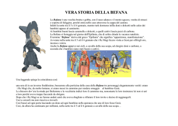 VERA STORIA DELLA BEFANA La Befana è una vecchia brutta e gobba, con il naso adunco e il mento aguzzo, vestita di stracci e coperta di fuliggine, perchè entra nelle case attraverso la cappa del camino. Infatti la notte tra il 5 e il 6 gennaio, mentre tutti dormono infila doni e dolcetti nelle calze dei bambini appese al caminetto. Ai bambini buoni lascia caramelle e dolcetti, a quelli cattivi lascia pezzi di carbone. La Befana si festeggia nel giorno dell'Epifania, che di solito chiude le vacanze natalizie. Il termine “Befana” deriva dal greco “Epifania” che significa “apparizione, manifestazione”. Avvenne nella notte tra il 5 ed il 6 gennaio che i Re Magi fecero visita a Gesù per offrirgli oro, incenso e mirra. Anche la Befana apparve nei cieli, a cavallo della sua scopa, ad elargire doni o carbone, a seconda che i bambini siano stati buoni o cattivi. Una leggenda spiega la coincidenza così: una sera di in un inverno freddissimo, bussarono alla porticina della casa della Befana tre personaggi elegantemente vestiti: erano i Re Magi che, da molto lontano, si erano messi in cammino per rendere omaggio al bambino Gesù. Le chiesero dov’era la strada per Betlemme e la vecchietta indicò loro il cammino ma, nonostante le loro insistenze lei non si unì a loro perché aveva troppe faccende da sbrigare. Dopo che i Re Magi se ne furono andati sentì che aveva sbagliato a rifiutare il loro invito e decise di raggiungerli. Uscì a cercarli ma non riusciva a trovarli. Così bussò ad ogni porta lasciando un dono ad ogni bambino nella speranza che uno di loro fosse Gesù. Così, da allora ha continuato per millenni, nella notte tra il 5 ed il 6 gennaio a cavallo della sua scopa…