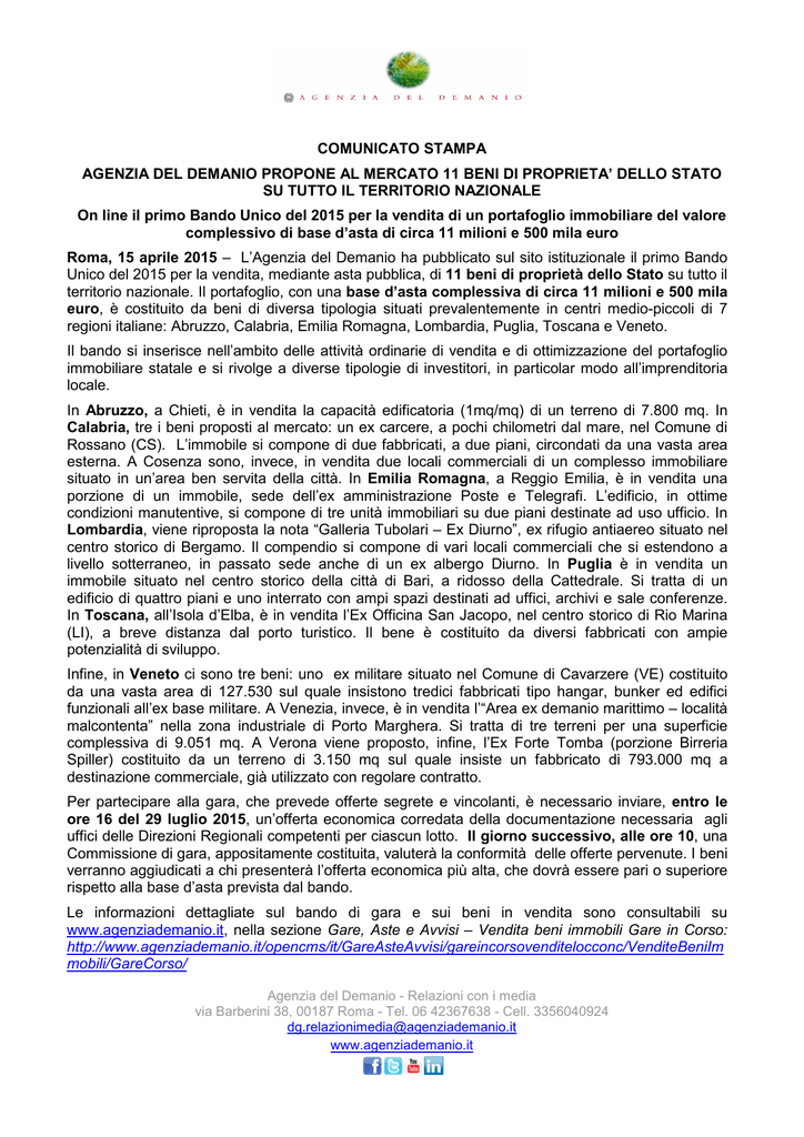 COMUNICATO STAMPA AGENZIA DEL DEMANIO PROPONE AL MERCATO 11 BENI DI PROPRIETA’ DELLO STATO SU TUTTO IL TERRITORIO NAZIONALE On line il primo Bando Unico del 2015 per la vendita di un portafoglio immobiliare del valore complessivo di base d’asta di circa 11 milioni e 500 mila euro Roma, 15 aprile 2015 – L’Agenzia del Demanio ha pubblicato sul sito istituzionale il primo Bando Unico del 2015 per la vendita, mediante asta pubblica, di 11 beni di proprietà dello Stato su tutto il territorio nazionale. Il portafoglio, con una base d’asta complessiva di circa 11 milioni e 500 mila euro, è costituito da beni di diversa tipologia situati prevalentemente in centri medio-piccoli di 7 regioni italiane: Abruzzo, Calabria, Emilia Romagna, Lombardia, Puglia, Toscana e Veneto. Il bando si inserisce nell’ambito delle attività ordinarie di vendita e di ottimizzazione del portafoglio immobiliare statale e si rivolge a diverse tipologie di investitori, in particolar modo all’imprenditoria locale. In Abruzzo, a Chieti, è in vendita la capacità edificatoria (1mq/mq) di un terreno di 7.800 mq. In Calabria, tre i beni proposti al mercato: un ex carcere, a pochi chilometri dal mare, nel Comune di Rossano (CS). L’immobile si compone di due fabbricati, a due piani, circondati da una vasta area esterna. A Cosenza sono, invece, in vendita due locali commerciali di un complesso immobiliare situato in un’area ben servita della città. In Emilia Romagna, a Reggio Emilia, è in vendita una porzione di un immobile, sede dell’ex amministrazione Poste e Telegrafi. L’edificio, in ottime condizioni manutentive, si compone di tre unità immobiliari su due piani destinate ad uso ufficio. In Lombardia, viene riproposta la nota “Galleria Tubolari – Ex Diurno”, ex rifugio antiaereo situato nel centro storico di Bergamo. Il compendio si compone di vari locali commerciali che si estendono a livello sotterraneo, in passato sede anche di un ex albergo Diurno. In Puglia è in vendita un immobile situato nel centro storico della città di Bari, a ridosso della Cattedrale. Si tratta di un edificio di quattro piani e uno interrato con ampi spazi destinati ad uffici, archivi e sale conferenze. In Toscana, all’Isola d’Elba, è in vendita l’Ex Officina San Jacopo, nel centro storico di Rio Marina (LI), a breve distanza dal porto turistico. Il bene è costituito da diversi fabbricati con ampie potenzialità di sviluppo. Infine, in Veneto ci sono tre beni: uno ex militare situato nel Comune di Cavarzere (VE) costituito da una vasta area di 127.530 sul quale insistono tredici fabbricati tipo hangar, bunker ed edifici funzionali all’ex base militare. A Venezia, invece, è in vendita l’“Area ex demanio marittimo – località malcontenta” nella zona industriale di Porto Marghera. Si tratta di tre terreni per una superficie complessiva di 9.051 mq. A Verona viene proposto, infine, l’Ex Forte Tomba (porzione Birreria Spiller) costituito da un terreno di 3.150 mq sul quale insiste un fabbricato di 793.000 mq a destinazione commerciale, già utilizzato con regolare contratto. Per partecipare alla gara, che prevede offerte segrete e vincolanti, è necessario inviare, entro le ore 16 del 29 luglio 2015, un’offerta economica corredata della documentazione necessaria agli uffici delle Direzioni Regionali competenti per ciascun lotto. Il giorno successivo, alle ore 10, una Commissione di gara, appositamente costituita, valuterà la conformità delle offerte pervenute. I beni verranno aggiudicati a chi presenterà l’offerta economica più alta, che dovrà essere pari o superiore rispetto alla base d’asta prevista dal bando. Le informazioni dettagliate sul bando di gara e sui beni in vendita sono consultabili su www.agenziademanio.it, nella sezione Gare, Aste e Avvisi – Vendita beni immobili Gare in Corso: http://www.agenziademanio.it/opencms/it/GareAsteAvvisi/gareincorsovenditelocconc/VenditeBeniIm mobili/GareCorso/ Agenzia del Demanio - Relazioni con i media via Barberini 38, 00187 Roma - Tel. 06 42367638 - Cell. 3356040924 [email protected] www.agenziademanio.it