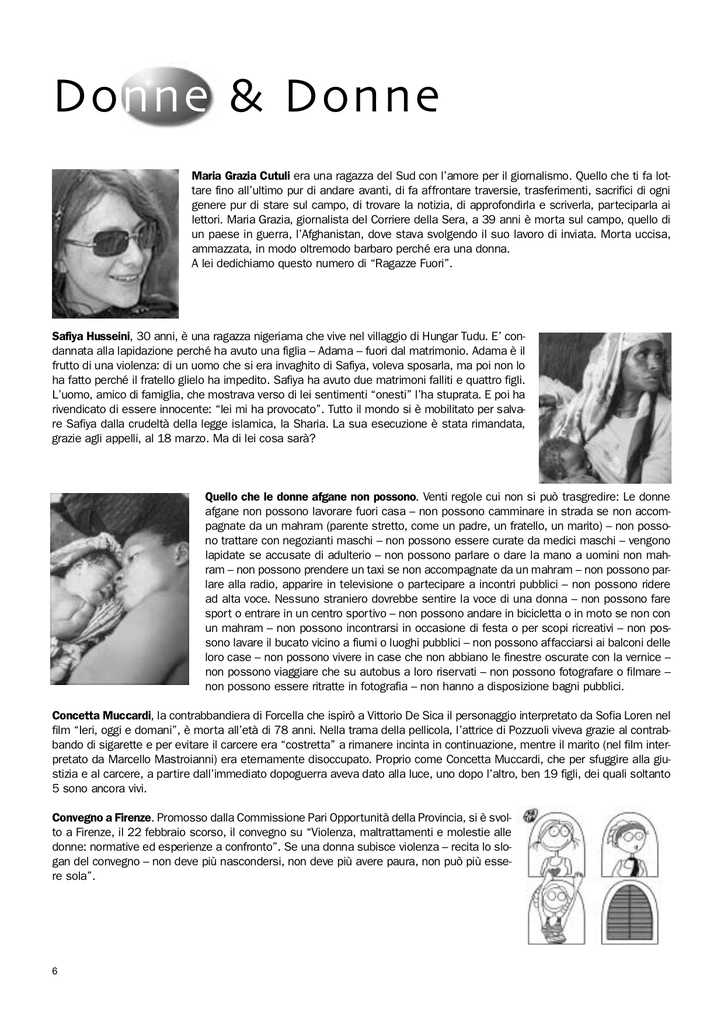 D onne & Donne Maria Grazia Cutuli era una ragazza del Sud con l’amore per il giornalismo. Quello che ti fa lottare fino all’ultimo pur di andare avanti, di fa affrontare traversie, trasferimenti, sacrifici di ogni genere pur di stare sul campo, di trovare la notizia, di approfondirla e scriverla, parteciparla ai lettori. Maria Grazia, giornalista del Corriere della Sera, a 39 anni è morta sul campo, quello di un paese in guerra, l’Afghanistan, dove stava svolgendo il suo lavoro di inviata. Morta uccisa, ammazzata, in modo oltremodo barbaro perché era una donna. A lei dedichiamo questo numero di “Ragazze Fuori”. Safiya Husseini, 30 anni, è una ragazza nigeriama che vive nel villaggio di Hungar Tudu. E’ condannata alla lapidazione perché ha avuto una figlia – Adama – fuori dal matrimonio. Adama è il frutto di una violenza: di un uomo che si era invaghito di Safiya, voleva sposarla, ma poi non lo ha fatto perché il fratello glielo ha impedito. Safiya ha avuto due matrimoni falliti e quattro figli. L’uomo, amico di famiglia, che mostrava verso di lei sentimenti “onesti” l’ha stuprata. E poi ha rivendicato di essere innocente: “lei mi ha provocato”. Tutto il mondo si è mobilitato per salvare Safiya dalla crudeltà della legge islamica, la Sharia. La sua esecuzione è stata rimandata, grazie agli appelli, al 18 marzo. Ma di lei cosa sarà? Quello che le donne afgane non possono. Venti regole cui non si può trasgredire: Le donne afgane non possono lavorare fuori casa – non possono camminare in strada se non accompagnate da un mahram (parente stretto, come un padre, un fratello, un marito) – non possono trattare con negozianti maschi – non possono essere curate da medici maschi – vengono lapidate se accusate di adulterio – non possono parlare o dare la mano a uomini non mahram – non possono prendere un taxi se non accompagnate da un mahram – non possono parlare alla radio, apparire in televisione o partecipare a incontri pubblici – non possono ridere ad alta voce. Nessuno straniero dovrebbe sentire la voce di una donna – non possono fare sport o entrare in un centro sportivo – non possono andare in bicicletta o in moto se non con un mahram – non possono incontrarsi in occasione di festa o per scopi ricreativi – non possono lavare il bucato vicino a fiumi o luoghi pubblici – non possono affacciarsi ai balconi delle loro case – non possono vivere in case che non abbiano le finestre oscurate con la vernice – non possono viaggiare che su autobus a loro riservati – non possono fotografare o filmare – non possono essere ritratte in fotografia – non hanno a disposizione bagni pubblici. Concetta Muccardi, la contrabbandiera di Forcella che ispirò a Vittorio De Sica il personaggio interpretato da Sofia Loren nel film “Ieri, oggi e domani”, è morta all’età di 78 anni. Nella trama della pellicola, l’attrice di Pozzuoli viveva grazie al contrabbando di sigarette e per evitare il carcere era “costretta” a rimanere incinta in continuazione, mentre il marito (nel film interpretato da Marcello Mastroianni) era eternamente disoccupato. Proprio come Concetta Muccardi, che per sfuggire alla giustizia e al carcere, a partire dall’immediato dopoguerra aveva dato alla luce, uno dopo l’altro, ben 19 figli, dei quali soltanto 5 sono ancora vivi. Convegno a Firenze. Promosso dalla Commissione Pari Opportunità della Provincia, si è svolto a Firenze, il 22 febbraio scorso, il convegno su “Violenza, maltrattamenti e molestie alle donne: normative ed esperienze a confronto”. Se una donna subisce violenza – recita lo slogan del convegno – non deve più nascondersi, non deve più avere paura, non può più essere sola”. 6 LÕULTIMA VOLTA CHE HO VISTO MIA MADRE, di Adriana Rossini In aprile del 2001 la Cassazione mi ha confermato 6 anni e 8 mesi e in maggio mi sono costituita, in quel periodo mia madre veniva operata di tumore iniziando un calvario che si è concluso solo in questi giorni. Anche io ho percorso un calvario in questo periodo. E’ sempre stato il mio problema fondamentale in tutto questo periodo di carcerazione riuscire ad essere vicino a mia madre, vederla, parlarle. In tutto il periodo che sono stata a Sollicciano, non sono mai riuscita ad avere un permesso per vederla, eppure non sono pericolosa, mi sono costituita e avevano tutte le cartelle cliniche che confermavano la gravità del caso. Mi aspettavo che in un caso come il mio fosse doveroso darmi il permesso per essere vicina a mia madre, ma niente la pietà umana non dimora a Sollicciano. Il primo settembre sono arrivata a Empoli e la comandante si è dimostrata attenta al mio problema. Il risultato è stato che dopo solo 15 giorni ho avuto il permesso, anche se solo di 3 ore, pe recarmi a La Spezia con una scorta in borghese per abbracciare mia madre. Era una cosa che desiderava da tanto e per me è stato come toccare il cielo con un dito. La scorta si è comportata benissimo, era in borghese, non sono stati entranti! Hanno cercato di non disturbare né in casa di mia sorella né i miei sentimenti durante il tragitto. Sono ancora grata a quei tre agenti, n ragazzo, una ragazza e l’autista che si sono comportati umanamente. La malattia di mia madre progrediva e, ormai entrata nello stato terminale, veniva ricoverata in ospedale. Ho ripresentato domanda e sono potuta ritornare a trovarla per l’ultima volta il primo ottobre, solo dieci giorni dopo la mia prima visita. Questa volta è stato un incubo. La scorta era composta da quattro agenti – due donne, l’autista e il caposcorta – che, nonostante nel permesso fosse specificato che dovevano essere in borghese, erano in divisa. Il viaggio di andata è stato veloce e senza intoppi, ma una volta in ospedale il caposcorta e l’autista ribadisco, in divisa, hanno iniziato a comportarsi come se fossero, in quanto polizia penitenziaria, i padroni dell’ospedale. Una volta identificata la stanza in cui