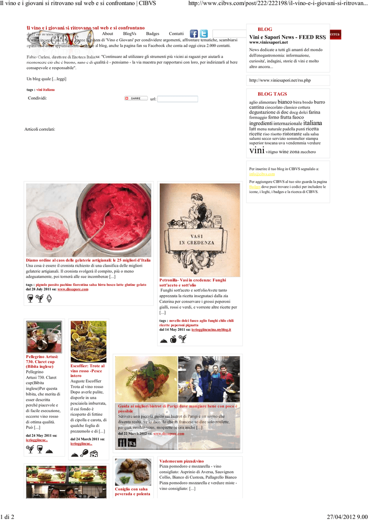 Il vino e i giovani si ritrovano sul web e si confrontano | CIBVS 1 di 2 http://www.cibvs.com/post/222/222198/il-vino-e-i-giovani-si-ritrovan... Il vino e i giovani si ritrovano sul web e si confrontano About BlogVs Badges Contatti Www.vinoegiovani.it/blog: riapre la piazza di 'Vino e Giovani' per condividere argomenti, affrontare tematiche, scambiarsi opinioni e darsi appuntamenti. Insieme al blog, anche la pagina fan su Facebook che conta ad oggi circa 2.000 contatti. BLOG Vini e Sapori News - FEED RSS www.viniesapori.net Fabio Carlesi, direttore di Enoteca Italiana: "Continuare ad utilizzare gli strumenti più vicini ai ragazzi per aiutarli a riconoscere ciò che è buono, sano e di qualità è - pensiamo - la via maestra per rapportarsi con loro, per indirizzarli al bere consapevole e responsabile". News dedicate a tutti gli amanti del mondo dell'enogastronomia: informazione, curiosita', indagini, storie di vini e molto altro ancora... Un blog quale [...leggi] http://www.viniesapori.net/rss.php tags : vini italiana BLOG TAGS Condividi: url: aglio alimentare bianco birra brodo burro cantina cioccolato classico cottura degustazione di doc docg dolci farina formaggio forno frutta fuoco ingredienti internazionale italiana latt menu naturale padella punti ricetta ricette riso risotto ristorante sala salsa Articoli correlati: salumi secco servizio sommelier stampa superior toscana uva vendemmia verdure vini vitigno wine zona zucchero Per inserire il tuo blog in CIBVS segnalalo a: [email protected] Per aggiungere CIBVS al tuo sito guarda la pagina Badges dove puoi trovare i codici per includere le icone, i loghi, i badges e la ricerca di CIBVS. Diamo ordine al caos delle gelaterie artigianali: le 25 migliori d’Italia Una cosa è essere il cronista richiesto di una classifica delle migliori gelaterie artigianali. Il cronista svolgerà il compito, più o meno adeguatamente, poi tornerà alle sue incombenze [...] tags : pignolo passito pachino fiorentina salsa birra bosco latte glutine gelato dal 28 July 2011 su: www.dissapore.com Petronilla- Vasi in credenza: Funghi sott'aceto e sott'olio Funghi sott'aceto e sott'olioAvete tanto apprezzata la ricetta insegnataci dalla zia Caterina per conservare i grossi peperoni gialli, rossi e verdi, e vorreste altre ricette per [...] tags : novello dolci fuoco aglio funghi chilo chili ricette peperoni pignatta dal 14 May 2011 su: ierioggiincucina.myblog.it Pellegrino Artusi: 730. Claret cup (Bibita inglese) Pellegrino Artusi 730. Claret cup(Bibita inglese)Per questa bibita, che merita di esser descritta perché piacevole e di facile esecuzione, occorre vino rosso di ottima qualità. Può [...] dal 24 May 2011 su: ierioggiincuc.. Escoffier: Trote al vino rosso -Pesce intero Auguste Escoffier Trota al vino rosso Dopo averle pulite, disporle in una pesciaiola imburrata, il cui fondo è ricoperto di fettine di cipolla e carota, di qualche foglia di prezzemolo e di [...] dal 24 March 2011 su: ierioggiincuc.. Coniglio con salsa peverada e polenta Vademecum pizza&vino Pizza pomodoro e mozzarella - vino consigliato: Asprinio di Aversa, Sauvignon Collio, Bianco di Custoza, Pallagrello Bianco Pizza pomodoro mozzarella e verdure miste vino consigliato: [...] 27/04/2012 9.00 Il vino e i giovani si ritrovano sul web e si confrontano | CIBVS 2 di 2 ILavini d’Italia 2011 dei preparazione di questo "Festival risotto è semplice e per la guidadi tutti. Per quattro Sapori" a Paupisi alla portata persone: 320 g dell’Espresso. Tutti 200 g(Bn) di riso vialone nano, di quartirolo, 1 i premiatidi vino rosso, mezza cipolla tritata, bicchiere dal 24 July 2010 su: dal 30 September 2010 su: www.intravino.. www.viniesapo.. I Vini100 Top d’Italia 2010 2010 | Wine Spectator firma la classifica più assurda del de L’Espresso, ecco Cinque Ora èletutto chiaro. Sono un idiota cresciuto a pane e “Atlante mondiale Bottiglie del vino”, uno di quelli che almeno una notte hanno sognato di avere Hugh Johnson come dal 2 October 2009 su: padre e Jancis [...] vino24.tv doc quartirolo dal 22 September 2009 su: unbuonbicchiere.myblog.it vini mica langhe bianco americana bordeaux borgogna dal 18 November 2010 su: www.intravino.com cipolla, aglio, sedano, carote, [...] stupire - baluardo del vino come [...] dal 10 October 2009 su: unbuonbicchie.. http://www.cibvs.com/post/222/222198/il-vino-e-i-giovani-si-ritrovan... dal 24 November 2010 su: www.dissapore.. dal 31 October 2009 su: unbuonbicchie.. enologico con l’elenco dei vini che si sono aggiudicati la Chiocciola, quelli che [...] dal 12 October 2010 su: www.intravino.. 27/04/2012 9.00