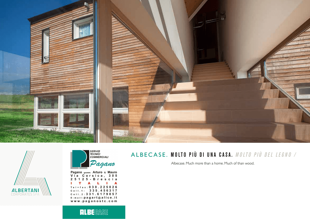 A L B E C A S E . M O LT O P I Ù D I U N A C A S A . M O LT O P I Ù D E L L E G N O / Albecase. Much more than a home. Much of than wood. A L B EC A S E. S TI L I D I V ITA / S C E LT E D I S T I L E Albecase. Life styles / Style choices Da idee che ridisegnano pezzi di città, ad abitazioni capaci di rimodulare stili di vita: con Albecase tutto è possibile. From ideas to redesign portions of cities to dwellings capable of reformulating lifestyles: with Albecase, anything is possible. ALBEC ASE. P R O G E T TI / La tecnologia e l’esperienza del legno lamellare al servizio di grandi interventi urbanistici. The technology and expertise of laminated timber at the service of large town planning actions. Trento. Urban requalification project / “Le Albere” Designer / RENZO PIANO Trento. Progetto di riqualificazione urbana / “Le A l b ere” P R O G E T TI STA / R E NZ O P I A N O Area built: 116,000 sq.m Development time: 180 days Manufacturing material: Xilam Area edificata: 116.000 mq Tempo di realizzazione: 180 giorni Elementi costruttivi: Xilam ALBEC ASE. I N C O NTR O / La casa nel parco Abitazione residenziale situata all’interno di un Parco naturale Tempo di realizzazione: 89 giorni Elementi costruttivi in Lignum K Residential housing within a natural park Development time: 89 days Manufacturing elements in Lignum K Da belle idee nascono affascinanti soluzioni. E il legno non è mai stato così versatile. Natura in mezzo alla natura. Più ecologico di così? ALBECASE. MEETING / The house in the park. Beautiful ideas generate fascinating solutions. And wood has never been so versatile. Nature in the middle of nature What could be more environment-friendly? ALBEC ASE. D I A LO G O / ALBEC ASE. O R G A N I C ITÀ / Edilizia residenziale Edifici multifunzionali Intenso dialogo tra personaggi eterogenei: legno, intonaco, cemento. Per una perfetta integrazione di tecnica ed estetica. Gli edifici multifunzionali trovano nuove forme attraverso cui esprimersi. Il legno lamellare riesce a soddisfare le esigenze progettuali più particolari. Albecase va oltre: crea un nuovo modo di progettare. ALBECASE. DIALOGUE / Residential housing Intensive dialogue between heterogeneous characters: wood, filler and concrete. For a perfect integration of technique and appearance ALBECASE. ORGANICITY / Multi-function buildings The multi-function buildings find new shapes to express themselves. Laminar timber manages to meet the most particular design requirements. Albecase moves beyond it: it creates a new way of designing. ALBEC ASE. A F F I D A B I LITÀ / Strutture pubbliche Sistemi costruttivi all’avanguardia e modularità consentono estrema libertà progettuale, per esprimere al meglio la propria idea di architettura e realizzare edifici sicuri e innovativi. ALBECASE. RELIABILITY / Public structures Avant-garde building systems and modularity allow for the greatest freedom in design, to express your idea of architecture at its best and develop safe innovative buildings. ALBEC ASE. M ATE R I C ITÀ / ALBEC ASE. E D I F I C I M U LTI P I A N O / Una casa che vive Unità abitative antisismiche Costruire in legno permette di esaltare le caratteristiche sensoriali di un materiale straordinario. Con il legno, molto più che con altri materiali, vista, tatto, olfatto sono direttamente coinvolti e catturati. È questa una delle ambizioni più grandi di Albecase: una casa che soddisfi il totale appagamento dei sensi. Costruire in legno è più sicuro. Elastico e resistente, il legno può subire forze di trazione e in parte di compressione; ha una minore rigidezza strutturale e una massa inferiore rispetto al cemento per cui il periodo delle scosse telluriche è ridotto. Per questo motivo le costruzioni in legno sono più sicure di quelle tradizionali in caso di sisma. ALBECASE. THE ART OF MATTER / A living house Building in wood allows extolling the sensitive features of an extraordinary material. Wood directly involves and captures sight, touch and smell far more than any other material. This is one of Albecase’s greatest ambitions: a house that fully pleases your senses. ALBECASE. MULTI-STOREY BUILDINGS / Antiseismic housing facilities Building in wood is safer. Elastic and resistant, wood can withstand traction and - to some extend compression -forces; its structural rigidity and mass are lower than cement; subsequently, the ground-shaking period is reduced. This is why the wooden buildings are safer than the conventional ones in case of earthquake. CASACLIMA CLASSE A realizzata interamente in legno Interno: legno impregnato finitura bianca CASACLIMA CLASS A fully developed in wood Interior: impregnated wood with white finish Area edificata: 116.000 mq Tempo di realizzazione: 78 giorni per ciascun condominio Area built: 116,000 sq.m Development time: 78 days for each apartment block ALBEC ASE. B E LLEZZ A / Villa privata Dialogo, equilibrio naturale degli elementi, che definiscono un’eleganza spontanea. Perfetta interazione tra elementi diversi, declinati in tonalità algida. ALBECASE. BEAUTY / Private villa Dialogue, natural balance of the elements, which define spontaneous elegance. Perfect interaction between different constituents, declined in icy cold shade. CasaClima classe A realizzata in materiali interamente naturali Cappotto in sughero Isolanti in pannelli di fibra di legno Riscaldamento a pompa di calore CasaClima class A developed in fully natural materials Cork greatcoat Insulation in wooden fiber panels Heating by heat pump ALBEC ASE. V E R S ATI LITÀ / ALBEC ASE. R I S PA R M I O / Non solo legno Edilizia biocompatibile Ogni desiderio è realizzabile. Con le competenze e la professionalità di Albecase qualsiasi esigenza viene soddisfatta. Finiture eterogenee, progetti particolari: affidatevi all’esperienza di chi fa case da oltre 40 anni. Abitare in un edificio che necessita di poca energia per la sua conduzione non è solo un vantaggio per l’ambiente ma lo è anche per chi