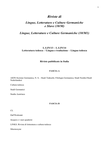 1 Riviste di Lingue, Letterature e Culture Germaniche e Slave (10/M) Lingue, Letterature e Culture Germaniche (10/M1) L-LIN/13 – L-LIN/14 Letteratura tedesca / Lingua e traduzione – Lingua tedesca Riviste pubblicate in Italia FASCIA A AION-Sezione Germanica, N. S. - Studi Tedeschi; Filologia Germanica; Studi Nordici/Studi Nederlandesi Cultura tedesca Studi Germanici Studia Austriaca FASCIA B CL DaFWerkstatt Jacques e i suoi quaderni LINKS. Rivista di letteratura e cultura tedesca Mnemosyne 2 Osservatorio critico della germanistica PROFORMA: Quaderni di Germanistica Studia Theodisca Testi e linguaggi Riviste on line BAIG. Bollettino dell'Associazione Italiana di Germanistica Riviste straniere di ambito germanistico (Qui di seguito si elencano, in ordine alfabetico, riviste straniere che ospitano contributi di letteratura, lingua, linguistica tedesca e didattica del tedesco come lingua straniera) Acta Germanica Arbitrium. Zeitschrift für Rezensionen zur germanistischen Literaturwissenschaft arcadia: Zeitschrift für allgemeine und vergleichende Literaturwissenschaft Archiv für das Studium der neueren Sprachen und Literaturen Aufklärung. Interdisziplinäre Halbjahresschrift zur Erforschung des 18. Jahrhunderts und seiner Wirkungsgeschichte Brücken. Germanistisches Jahrbuch Tschechien – Slowakei Colloquia Germanica Daphnis: Zeitschrift für Mittlere Deutsche Literatur Der deutsche Lehrer im Ausland Der Deutschunterricht Der Sprachdienst Deutsch als Fremdsprache. Zeitschrift zur Theorie und Praxis des Deutschunterrichts für Ausländer Deutsche Sprache Deutsche Vierteljahrsschrift für Literaturwissenschaft und Geistesgeschichte Études germaniques Euphorion: Zeitschrift für Literaturgeschichte Exilforschung. Ein internationales Jahrbuch Forum Schule Fremdsprache Deutsch Fremdsprachen Lehren und Lernen (FLuL) German Life and Letters German Quarterly German Studies Review Germanica Wratislaviensia Germanisch-Romanische Monatsschrift 3 Germanistik in der Schweiz. Germanistik: Internationales Referatenorgan mit bibliographischen Hinweisen Germanistische Mitteilungen: Zeitschrift für deutsche Sprache, Literatur, und Kultur GFL – German as a Foreign Language Goethe Yearbook Goethe-Blätter Goethe-Jahrbuch IDV-Magazin IDV-Rundbrief Info DAF Informationen zur Deutschdidaktik Internationales Archiv für Sozialgeschichte der deutschen Literatur. Jahrbuch der Deutschen Schillergesellschaft Jahrbuch für Internationale Germanistik Lebende Sprachen – Zeitschrift für fremde Sprachen in Wissenschaft und Praxis Lessing Yearbook LiLi: Zeitschrift für Literaturwissenschaft und Linguistik Literatur für Leser literaturkritik.de: Rezensionsforum für Literatur und für Kulturwissenschaft. Mitteilungen der Winckelmann-Gesellschaft Mitteilungen des Deutschen Germanistenverbandes Modern Austrian Literature Monatshefte für deutschsprachige Literatur und Kultur Muttersprache Neophilologus: An International Journal of Modern and Mediaeval Language and Literature Neue Rundschau New German Critique New German Review New German Studies Orbis Litterarum: International Review of Literary Studies Oxford German Studies Recherches Germaniques Revista de Filologia Alemana Schweizer Monatshefte Sinn und Form: Beiträge zur Literatur Sprache und Literatur Sprachkunst Sprachreport Sprechen Studia germanistica.Acta FacultatisPhilosophicaeUniversitatis Ostraviensis Text + Kritik: Zeitschrift für Literatur The Germanic Review Weimarer Beiträge. Zeitschrift für Literaturwissenschaft, Ästhetik und Kulturwissenschaften Wirkendes Wort. Deutsche Sprache und Literatur in Forschung und Lehre Zeitschrift der Germanisten Rumäniens Zeitschrift für deutsches Altertum und deutsche Literatur Zeitschrift für Dialektologie und Linguistik Zeitschrift für Fremdsprachenforschung Zeitschrift für Germanistik Zeitschrift für germanistische Linguistik Zielsprache Deutsch Riviste italiane di altri settori 4 (Qui di seguito si elencano, in ordine alfabetico, riviste italiane di altri settori che hanno ospitato contributi di colleghi del SSD L-LIN/14) Annali della Facoltà di Lingue e letterature straniere dell’Università di Sassari Annali di Sociologia Università di Trento Annali online dell’Università di Ferrara Ars interpretandi Athenet Atti e sipari Bolletino Roncioniano Brixner theologisches Forum Città rivista Comparatistica Comunicare Contatti Culture Daemon Didascalie Gregorianum Hermes Heteroglossia. Quaderni della Sezione Linguistica del Dipartimento di Studi su Mutamento Sociale, Istituzioni giuridiche e Comunicazione Humanitas Il Bianco e il nero Il confronto letterario Il Cristallo Il Monitore Il Nome nel testo Incontri inTRAlinea On line Translation Journal In Verbis Lingue Letterature Culture I quaderni del Cardello L’analisi linguistica e letteraria LEND. Lingua e nuova didattica Le reti di Dedalus Linea tempo Lingue e Linguaggi Linguistica e filologia List. Quaderni di studi linguistici L’ospite ingrato L’Ulisse Mediazioni Merope Meta Minerva Nuova secondaria Nuovi quaderni del CRIER Pagine Paragrafo Pedagogia più didattica Plurilinguismo Prospero Quaderni di lingue e letterature 5 Rassegna di pedagogia Rivista di Filosofia neoscolastica Rivista Internazionale di Tecnica della Traduzione (RITT) Rivista Italiana di Dialettologia Rassegna italiana di linguistica applicata Rivista di linguistica Scuola e didattica Scuola e lingue moderne Scuola e lavoro Studi comparatistici Studi e ricerche Studi italiani di linguistica teorica e applicata Studi linguistici e filologici Online Testo a fronte Traduttologia. Rivista di interpretazione e traduzione Tratti Versodove L-FIL-LET/15 Filologia Germanica Riviste pubblicate in Italia (Waiting) Filologia germanica – Germanic Philology Riviste italiane interdisciplinari all’interno della germanistica (cfr. le classificazioni dei settori L-LIN/13 e L-LIN/14) AION-Sezione Germanica, N. S. - Studi Tedeschi; Filologia Germanica; Studi Nordici/Studi Nederlandesi 
