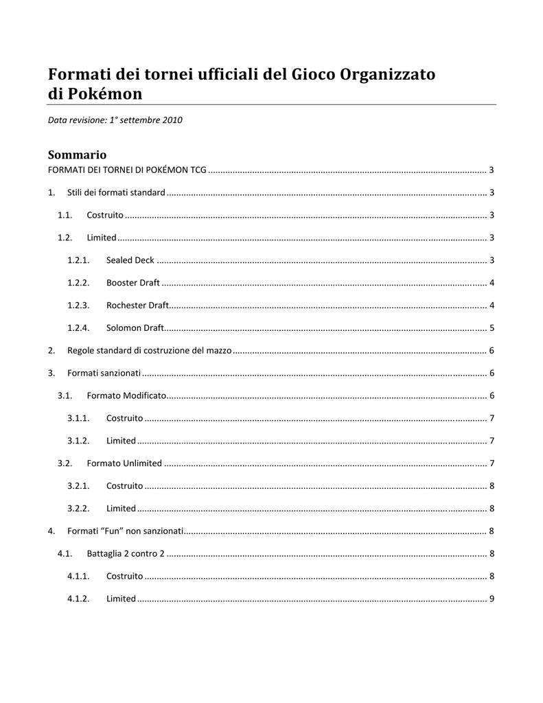 Formati dei tornei ufficiali del Gioco Organizzato di Pokémon Data revisione: 1° settembre 2010 Sommario FORMATI DEI TORNEI DI POKÉMON TCG .................................................................................................................. 3 1. Stili dei formati standard ................................................................................................................................... 3 1.1. Costruito .................................................................................................................................................... 3 1.2. Limited ....................................................................................................................................................... 3 1.2.1. Sealed Deck ....................................................................................................................................... 3 1.2.2. Booster Draft ..................................................................................................................................... 4 1.2.3. Rochester Draft.................................................................................................................................. 4 1.2.4. Solomon Draft.................................................................................................................................... 5 2. Regole standard di costruzione del mazzo........................................................................................................ 6 3. Formati sanzionati ............................................................................................................................................. 6 3.1. 3.1.1. Costruito ............................................................................................................................................ 7 3.1.2. Limited ............................................................................................................................................... 7 3.2. 4. Formato Modificato................................................................................................................................... 6 Formato Unlimited .................................................................................................................................... 7 3.2.1. Costruito ............................................................................................................................................ 8 3.2.2. Limited ............................................................................................................................................... 8 Formati “Fun” non sanzionati............................................................................................................................ 8 4.1. Battaglia 2 contro 2 ................................................................................................................................... 8 4.1.1. Costruito ............................................................................................................................................ 8 4.1.2. Limited ............................................................................................................................................... 9 2 4.2. 30 carte...................................................................................................................................................... 9 4.2.1. Costruito ............................................................................................................................................ 9 4.2.2. Limited ............................................................................................................................................... 9 4.3. Battaglia in squadra ................................................................................................................................... 9 4.3.1. Costruito .......................................................................................................................................... 11 4.3.2. Limited ............................................................................................................................................. 11 FORMATI DEI TORNEI DI VIDEOGIOCHI POKÉMON................................................................................................. 12 Appendice A. Aggiornamenti del documento ............................................................................................ 13 Formati dei tornei ufficiali del Gioco Organizzato di Pokémon Rev: 1° settembre 2010 3 FORMATI DEI TORNEI DI POKÉMON TCG Il Gioco Organizzato di Pokémon supporta una vasta gamma di formati di tornei per il gioco sanzionato del gioco di carte collezionabili Pokémon. Questo documento presenta ciascun formato approvato e le relative variazioni. I tornei che non utilizzano uno dei formati seguenti non possono essere sanzionati. 1. Stili dei formati standard Tutti i tornei sanzionati Pokémon TCG ricadono in una delle due categorie seguenti: Costruito o Limited. Questa sezione descrive le differenze tra le due categorie, oltre alle eventuali sottocategorie. 1.1. Costruito In un evento Costruito, i giocatori si presentano al torneo con un mazzo da 60 carte. Le carte utilizzate per costruire il mazzo provengono dalla collezione personale di ogni giocatore. I mazzi non possono contenere più di 4 copie della stessa carta, come indicato dal titolo italiano della stessa, con l'eccezione standard delle carte Energia base. Alcune carte possono presentare delle restrizioni aggiuntive di costruzione, che vengono trattate come eccezioni alla regola delle 4 copie. Gli incontri vengono giocati con 6 carte Premio. 1.2. Limited In un evento Limited, i giocatori costruiscono i propri mazzi usando solo carte fornite dall'Organizzatore del torneo durante l'evento. Il mazzo di ciascun giocatore deve contenere sempre esattamente 40 carte. I mazzi poss