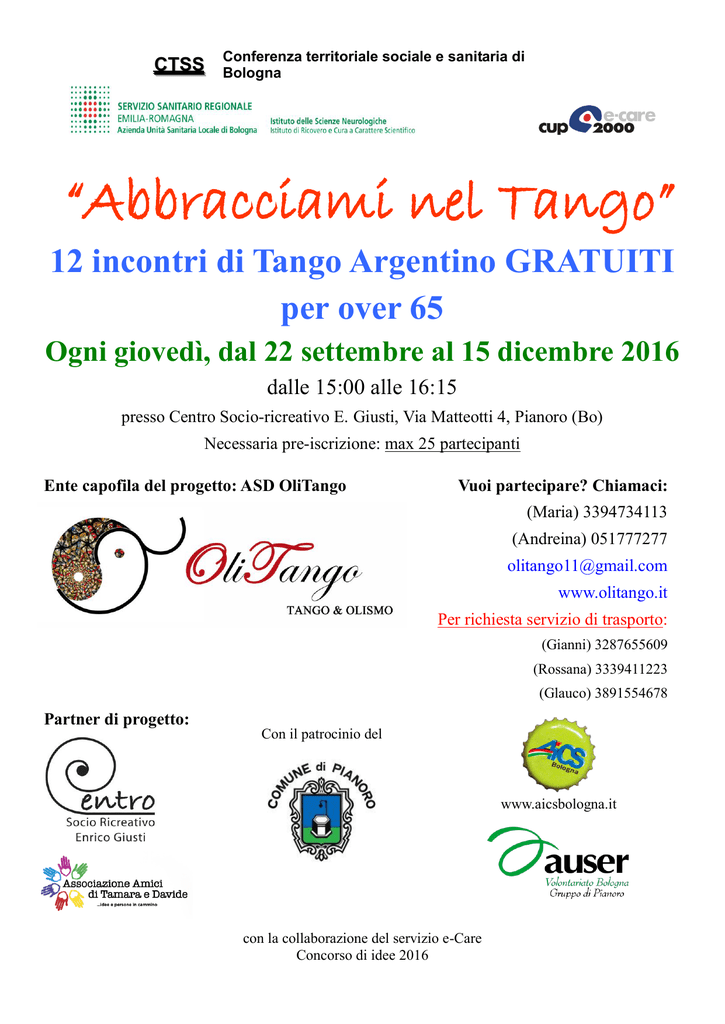 CTSS Conferenza territoriale sociale e sanitaria di Bologna “Abbracciami nel Tango” 12 incontri di Tango Argentino GRATUITI per over 65 Ogni giovedì, dal 22 settembre al 15 dicembre 2016 dalle 15:00 alle 16:15 presso Centro Socio-ricreativo E. Giusti, Via Matteotti 4, Pianoro (Bo) Necessaria pre-iscrizione: max 25 partecipanti Ente capofila del progetto: ASD OliTango Vuoi partecipare? Chiamaci: (Maria) 3394734113 (Andreina) 051777277 [email protected] www.olitango.it Per richiesta servizio di trasporto: (Gianni) 3287655609 (Rossana) 3339411223 (Glauco) 3891554678 Partner di progetto: Con il patrocinio del www.aicsbologna.it con la collaborazione del servizio e-Care Concorso di idee 2016