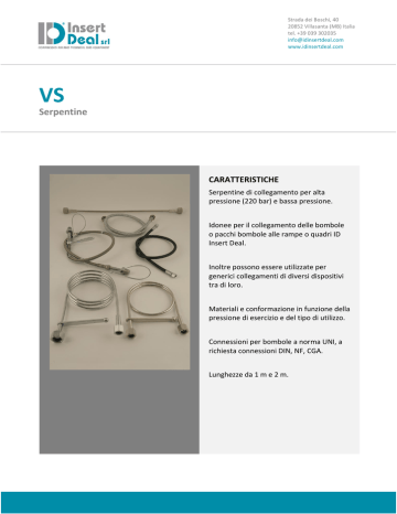 Strada dei Boschi, 40 20852 Villasanta (MB) Italia tel. +39 039 302035 [email protected] www.idinsertdeal.com VS Serpentine CARATTERISTICHE Serpentine di collegamento per alta pressione (220 bar) e bassa pressione. Idonee per il collegamento delle bombole o pacchi bombole alle rampe o quadri ID Insert Deal. Inoltre possono essere utilizzate per generici collegamenti di diversi dispositivi tra di loro. Materiali e conformazione in funzione della pressione di esercizio e del tipo di utilizzo. Connessioni per bombole a norma UNI, a richiesta connessioni DIN, NF, CGA. Lunghezze da 1 m e 2 m. DATI TECNICI Temperatura di esercizio: -20 °C ÷ +60 °C (nella versione standard) Grado di protezione: IP56 TIPOLOGIE Serpentina in rame cromato ø 8x4 (VS#A) Diametro esterno 8 mm / diametro interno 4 mm Pressione massima di esercizio 220 bar Connessioni da bombola a rampa o a quadro di decompressione Maniglia lato bombola Lunghezza 1 m peso ~0,75 kg Lunghezza 2 m peso ~1,2 kg Serpentina in rame cromato ø 10x5 (VS#B) Diametro esterno 10 mm / diametro interno 5 mm Pressione massima di esercizio 220 bar Connessioni da rampa a quadro di decompressione Maniglia lato bombola Lunghezza 0,5 m peso ~0,7 kg Lunghezza 1 m peso ~0,75 kg Lunghezza 2 m peso ~1,3 kg Serpentina in acciaio inossidabile AISI 316L (VS#M) Maniglia lato bombola in AISI 304 Diametro esterno 6 mm / diametro interno 4 mm Pressione massima di esercizio 220 bar Connessioni da bombola a rampa/quadro Lunghezza 1 m peso ~0,6 kg Lunghezza 2 m peso ~0,74 kg Copyright © ID Insert Deal S.r.l. - All rights reserved 2 TIPOLOGIE - Connessioni da bombola a rampa (VS#F) / quadro in ottone cromato o acciaio inossidabile AISI 316L a scelta Pressione massima di esercizio 220 bar (nella versione standard) Maniglia lato bombola Cavo di sicurezza Tubo interno in PTFE, treccia in AISI 304 Nella versione con connessioni in acciaio tutti gli elementi a contatto con il fluido sono in AISI 316L, PTFE e le guarnizioni in PA 6.6 Lunghezza 0,5 m peso ~1 kg Lunghezza 2 m peso ~2 kg Lunghezza 1 m peso ~0,75 kg Lunghezza 2 m peso ~1,3 kg Serpentina doppia treccia kevlar/AISI 304 (VS#E / VS#F) Diametro esterno ~13 mm / diametro interno minimo 4,2 mm Pressione massima di esercizio 220 bar (nella versione standard) Connessioni in ottone cromato per la versione VS#E Connessioni in acciaio inossidabile AISI 316L/AISI 304 per la versione VS#F Maniglia lato bombola Cavo di sicurezza Tubo interno in PTFE Treccia in acciaio inossidabile AISI 304 Nella versione con connessioni in acciaio tutti gli elementi a contatto con il fluido sono tabella versione in AISI 316L, PTFE e le guarnizioni in PA 6.6 Lunghezza 1 m peso ~1 kg Lunghezza 2 m peso ~2 kg Copyright © ID Insert Deal S.r.l. - All rights reserved 3 TIPOLOGIE Serpentina per propano C3H8 - GPL (VS#L) Diametro interno minimo 5,5 mm Pressione massima di esercizio 30 bar Connessioni 1P - UNI11144 W20 x 1/14” SX – F su entrambi i lati Treccia in acciaio, dadi in ottone Lunghezza 1 m peso ~0,4 kg Lunghezza 2 m peso ~1 kg Serpentina per C2H2 – acetilene (VS#H) Diametro interno minimo 3,5 mm Pressione massima di esercizio 15 bar Connessioni di ingresso: 7F - UNI11144 G 5/8 SX – M 7S - UNI11144 staffa Connessione rampa/quadro W20 x 1/4” SX DIN 477 Nr. 3 Connessione alla rampa o quadro: W20 x 1/4” SX Serpentina per NH3 – ammoniaca (VS#G) Diametro interno minimo 3,8 mm Pressione massima di esercizio 50 bar Connessioni 3 - UNI11144 W30 x 1/14” SX – F su entrambi i lati Maniglia lato bombola Cavo di sicurezza Tubo in PTFE con treccia in acciaio inossidabile Lunghezza 1 m peso ~1 kg Lunghezza 2 m peso ~1,3 kg Copyright © ID Insert Deal S.r.l. - All rights reserved 4 tabella versione Serpentine Flexible Connections Serpentine di collegamento per alta pressione (max. 220 bar operativi) High-pressure flexible connections (max. 220 bar) Collegamento da bombola a norme UNI a rampa/quadro, in tubo di rame cromato ø 8x4 mm, attacchi in ottone cromato, maniglia lato bombola Chrome plated connectors from cylinder (according to Italian UNI standard) to manifold or decompression unit Lunghezza 1 m / Lenght 1 m CYLINDER CONNECTION 2 - UNI 11144 1H - UNI 11144 5 - UNI 11144 8 - UNI 11144 6 - UNI 11144 9 - UNI 11144 MANIFOLD CONNECTION 2 - UNI 11144 1H - UNI 11144 2 - UNI 11144 2 - UNI 11144 2 - UNI 11144 2 - UNI 11144 Lunghezza 2 m / Lenght 2 m CYLINDER CONNECTION MANIFOLD CONNECTION CODE MEDIUM VS VS VS VS VS VS CO2 - O2 H2 - CH4 N2 He - Ar - A/CO2 Aria N2O CODE MEDIUM 2 - UNI 11144 2 - UNI 11144 VS CO2 - O2 1H - UNI 11144 1H - UNI 11144 VS H2 - CH4 5 - UNI 11144 2 - UNI 11144 VS N2 8 - UNI 11144 2 - UNI 11144 VS He - Ar - A/CO2 6 - UNI 11144 2 - UNI 11144 VS Aria 9 - UNI 11144 2 - UNI 11144 VS N2O Disponibile con medesime caratteristiche nella versione in acciaio inossidabile AISI 316, diametro tubo 6x4 mm / Same features made of AISI 316 stainless steel, hose diameter 6x4 mm Collegamento da rampa a quadro in tubo rame cromato ø 10x5 mm, attacchi in ottone cromato Chrome plated connections from manifold to decompression unit Lunghezza 0,5 m / Lenght 0,5 m CONNECTION IN/OUT CODE 2 - UNI 11144 1H - UNI 11144 VS VS Lunghezza 1 m / Lenght 1 m CONNECTION IN/OUT MEDIUM Gas inerti/comburenti-Non flamable gas Gas combustibili-Flamable gas CODE 2 - UNI 11144 1H - UNI 11144 VS VS Lunghezza 2 m / Lenght 2 m CONNECTION IN/OUT MEDIUM Gas inerti/comburenti-Non flamable gas Gas combustibili-Flamable gas CODE 2 - UNI 11144 1H - UNI 11144 VS VS MEDIUM Gas inerti/comburenti-Non flamable gas Gas combustibili-Flamable gas Collegamento da bombola a norme UNI a rampa / quadro in tubo flessibile rivestito da doppia treccia, inox + kevlar, attacchi in ottone cromato, maniglia lato bombola, cavetto di sicurezza Flexible connections from cylinder (according to Italian UNI standard) to manifold or decompression unit, double braid kevlar + AISI 304, inlet/outlet chrome plated brass connections Lunghezza 1 m / Lenght 1 m CYLINDER CONNECTION 2 - UNI 11144 1