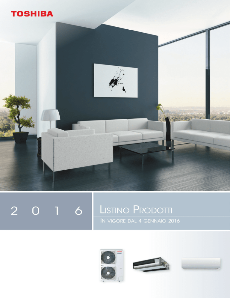 2 0 1 6 Listino Prodotti In vigore dal 4 gennaio 2016 2 Committed to people. Committed to the future. Questi sono i valori del gruppo Toshiba e il contributo che Toshiba vuole dare alla costruzione di una società migliore. Un impegno rinnovato ogni giorno per trasmettere il rispetto per le persone e la creazione di valore. Fin dalla fondazione di Toshiba nel lontano 1875, questi valori hanno ispirato ogni azione per concretizzare la responsabilità sociale in ogni attività del gruppo. L’obiettivo è di contribuire a creare una miglior qualità di vita e assicurare un continuo progresso della comunità mondiale. L’impegno a compiere passi decisi verso il futuro resta invariato e costante pur di fronte a molteplici sfide. 1) Commitment to People - Impegno verso le persone Il primario obiettivo aziendale è il cercare di soddisfare le esigenze di tutte le persone, sviluppando strategie a lungo termine e svolgendo in modo responsabile ogni attività. 2) Commitment to the Future - Impegno per il futuro La creazione di prodotti e servizi che migliorino la vita delle persone e che contribuiscano a sviluppare una società sana e fiorente avviene attraverso il continuo sviluppo di tecnologie innovative nei campi dell’Elettronica e dell’Energia. Fondamentale è, inoltre, una ricerca costante per nuovi approcci che aiutino a realizzare gli obiettivi della comunità mondiale e la ricerca di soluzioni per migliorare l’ambiente. 3 I quattro pilastri Toshiba per la protezione dell’ambiente Processi Il gruppo Toshiba ha sviluppato un Piano d’azione per l’ambiente come struttura portante del proprio “Obiettivo 2050” per diventare una delle società leader al mondo per il rispetto e la salvaguardia dell’ambiente. attraverso la comunicazione che tutte le attività di base dei dipendenti siano attivate per un Prodotti miglioramento continuo in senso con il più alto livello di prestazioni ambientale. Esso si basa su quattro pilastri principali che sono: lo sviluppo in senso ambientale dei Prodotti, per ottenere il minimo impatto ambientale per tutto il loro ciclo di vita; lo sviluppo delle Tecnologie per ridurre al minimo le emissioni di CO in atmosfera; lo sviluppo dei Processi produttivi per ridurre al minimo il loro impatto sull’ambiente; la Gestione societaria in senso ambientale sia L’introduzione sul mercato di prodotti concepiti e realizzati con queste caratteristiche contribuisce sempre più al miglioramento dell’ambiente in cui viviamo. In questo modo Toshiba, perseguendo il proprio obiettivo di diventare una delle società leader al mondo per il rispetto e la salvaguardia dell’ambiente, con i 2 produzione con attenzione all’ambiente Tecnologia a basso impatto di emissione di CO2 rispettose dell’ambiente Gestione miglioramento continuo di ogni attività rispettosa dell’ambiente propri quattro pilastri, contribuisce a sviluppare un mondo in cui le persone possono condurre stili di vita in armonia con il Pianeta. 4 Toshiba climatizzazione: la passione per l’innovazione nel rispetto della tradizione. È passato più di un secolo dalla sua nascita, ma Toshiba continua la strada tracciata dai suoi fondatori ed investe in tecnologia ed innovazione, nel profondo rispetto dell’ambiente. Nel 1999, infatti, Toshiba è ancora al vertice del settore in quanto primo produttore ad adottare per tutti i suoi prodotti i refrigeranti R-410A e R-407C, che non danneggiano la fascia d’ozono. Le origini di Toshiba Corporation risalgono al 1875 quando il signor Hisashige Tanaka, figura geniale del mondo della meccanica, nonché uno dei più grandi inventori giapponesi, e il signor Ichisuke Fujioka, mago dell’elettronica considerato il Thomas Edison del Giappone, diedero vita ad una piccola fabbrica a conduzione familiare a Ginza. Lo spirito innovativo di Toshiba continua con la ricerca volta al miglioramento dei suoi prodotti, raggiungendo importanti traguardi. La spiccata curiosità e la grande passione per la ricerca dei due fondatori dell’azienda hanno caratterizzato il marchio Toshiba sin dagli inizi per continuare a vivere, ancora oggi, nella filosofia aziendale. Il loro grande sogno era quello di sviluppare tecnologie che fossero realmente utili e a vantaggio di tutta la comunità. Oggi, a distanza di 140 anni da quel lontano 1875, possiamo tranquillamente affermare che quel sogno è diventato realtà. Toshiba è, infatti, leader mondiale nella tecnologia d’avanguardia e propone applicazioni e sistemi pensati per assicurare il massimo comfort del consumatore. Nel 1930 ha inizio la storia di Toshiba Air Conditioning, che entra nella climatizzazione con il primo compressore ermetico realizzato in Giappone destinato al settore della refrigerazione. Dopo i primi climatizzatori split per ambienti residenziali realizzati negli anni ’60, Toshiba è la prima azienda in assoluto ad introdurre i sistemi inverter (1980) e il compressore Twin Rotary (1988) grazie ai quali si consolida come azienda pionieristica e innovativa. Già negli anni ’80 Toshiba è in grado di offrire un’ampia gamma di prodotti, e nel corso degli anni successivi l’impegno costante nella ricerca e nello sviluppo di nuove tecnologie mirate al risparmio energetico ha fatto in modo che i climatizzatori Toshiba fossero sempre all’avanguardia, confermando l’azienda come leader nel settore della climatizzazione, del risparmio energetico e del rispetto per l’ambiente. Oggi i principali impianti di produzione dei sistemi di climatizzazione hanno sede in Giappone e in Tailandia. Il primo, Toshiba Fuji Works con sede a Fuji, è il centro dove vengono impiegate le tecnologie di climatizzazione più innovative e all’avanguardia mentre la sede tailandese è oggi il centro di produzione di una vasta gamma di prodotti per le Linee Residenziali e Light Commercial. I prodotti provenienti da quest’ultimo stabilimento sono oggi distribuiti in più di 50 paesi in tutto il mondo, compresa l’Italia. Indice 