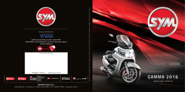 tariffe esclusive RC per tutti i Clienti SYM. Chiedi ORA al concessionario o vai al sito www.sym-italia.it nell’area dedicata For Lif e Concessionario autorizzato: [email protected] - www.sym-club.it 4 anni digaranzia 4 anni diassistenza stradale 3/4 anni di assistenza stradale e recupero gratuito del veicolo anche in caso di foratura SANYANG ITALIA S.R.L. Sede Operativa | Via Pavia, 25 | 20814 Varedo (MB) | Tel. +39 0362-55581 | www.sym-italia.it I dati tecnici e le caratteristiche, colori compresi, dei modelli a marchio SYM riportati nel presente catalogo sono soggetti a modifiche senza preavviso. Da oggi in collaborazione con: w w w. s y m - i t a l i a . i t Life Time. Life Needs. Life Styles. SUPER GARANZIA LA CONFERMA DI UNA SCELTA DI QUALITÁ LA GARANZIA 4 ANNI / 100.000 KM 4 anni digaranzia è valida per tutti gli scooter oltre 50cc della Gamma Sym 2016 ed è prestata direttamente e gratuitmente da Sanyang Italia srl, senza alcun intermediario assicurativo. La copertura integrale è strutturata analogamente alla garanzia prestata neiprimi due anni di vita dello scooter (Garanzia Legale). L’unico dovere del cliente sarà quello di rispettare la manutenzione programmata presso la rete dei Concessionari Ufficiali Sym. Limitazioni* e condizioni complete scaricabili dal sito www.sym-italia.it 4 anni diassistenza stradale IL PROGRAMMA EUROP ASSISTANCE garantisce assistenza stradale in caso di guasto meccanico, incidente, foratura pneumatico, per tutti i 4 anni di garanzia. In tutta Europa, 24 ore su 24, 7 giorni su 7, la certezza di poter contare su una centrale operativa sempre a disposizione. *La garanzia 4 anni /100.000 km, a seconda dell’ evento che si verifichi per primo, è valida esclusivamente in Italia per gli scooter oltre 50cc ad uso privato della gamma 2016 W4 commercializzati direttamente da Sanyang Italia srl, ad esclusione di X-pro. La manutenzione ordinaria, i materiali di consumo, parti di usura quali cinghie, rulli, ganasce, dischi e pastiglie freno, batterie ecc … sono esclusi. Le condizioni complete sono scaricabili dal sito www.sym-italia.it 400i ABS Motore e cilindrata: Potenza: Coppia massima: Raffreddamento: Distribuzione: Capacità serbatoio: Altezza sella: Peso a secco: Pneumatico anteriore: Pneumatico posteriore: Freno anteriore: Freno posteriore: Sospensione anteriore: Sospensione posteriore: WHITE 4 tempi monocilindrico - 399.3 cc 24.5 kw a 7500 giri 35.7 Nm/5500 giri Liquido Monoalbero, 4 valvole 15 L 750 mm 219 kg Tubeless 120/70-15 Tubeless 160/60-14 2 Dischi wave 275 mm Ø / ABS ABS disco 275 mm Ø Forcella telescopica doppia piastra 41 mm Ø Doppio ammortizzatore regolabile BLACK MAXSYM 400i ABS 4 anni digaranzia 4 anni diassistenza stradale 300i - 300i ABS Motore e cilindrata: Potenza: Coppia massima: Raffreddamento: Distribuzione: Capacità serbatoio: Altezza sella: Peso a secco: Pneumatico anteriore: Pneumatico posteriore: Freno anteriore: Freno posteriore: Sospensione anteriore: Sospensione posteriore: WHITE 4 tempi monocilindrico - 278.3 cc 21.3 kw a 8000 giri 27.4 Nm/6500 giri Liquido Monoalbero, 4 valvole 12 L 760 mm 184 kg Tubeless 120/70-14 Tubeless 140/60-13 Disco wave 200 mm Ø / ABS Combinata CBS o ABS disco wave 240 mm Ø Forcella telescopica Doppio ammortizzatore regolabile BLACK LIGHT GRAY MATT MATT JOYMAX 300i - 300i ABS 4 anni digaranzia 4 anni diassistenza stradale 300i CBS Motore e cilindrata: Potenza: Coppia massima: Raffreddamento: Distribuzione: Capacità serbatoio: Altezza sella: Peso a secco: Pneumatico anteriore: Pneumatico posteriore: Freno anteriore: Freno posteriore: Sospensione anteriore: Sospensione posteriore: WHITE BLACK 4 tempi monocilindrico - 278.3 cc 21.3 kw a 8000 giri 27.5 Nm/6500 giri Liquido Monoalbero, 4 valvole 10 L 800 mm 187 kg Tubeless 110/70-16 Tubeless 140/70-16 Disco 260 mm Ø Combinata CBS disco 260 mm Ø Forcella telescopica Doppio ammortizzatore regolabile BLACK MATT CITYCOM S 300i CBS 4 anni digaranzia 4 anni diassistenza stradale Motore e cilindrata: Potenza: Coppia massima: Raffreddamento: Distribuzione: Capacità serbatoio: Altezza sella: Peso a secco: Pneumatico anteriore: Pneumatico posteriore: Freno anteriore: Freno posteriore: Sospensione anteriore: Sospensione posteriore: WHITE 125 200i 4 tempi monocilindrico - 124.6 cc 9.24 kw a 8500 giri 9.9 Nm/6000 giri Liquido Monoalbero, 4 valvole 7.6 L 760 mm 153 kg Tubeless 110/90-13 Tubeless 130/70-12 Disco 273 mm Ø Disco 200 mm Ø Forcella telescopica Doppio ammortizzatore regolabile 4 tempi monocilindrico - 171.2 cc 11.03 kw a 8000 giri 13.24 Nm/6500 giri Liquido Monoalbero, 4 valvole 7.6 L 760 mm 153 kg Tubeless 110/90-13 Tubeless 130/70-12 Disco 273 mm Ø Disco 200 mm Ø Forcella telescopica Doppio ammortizzatore regolabile BLACK DARK GRAY MATT SOLO 200 JOYRIDE EVO 125 - 200i 4 anni digaranzia 4 anni diassistenza stradale Motore e cilindrata: Potenza: Coppia massima: Raffreddamento: Distribuzione: Capacità serbatoio: Altezza sella: Peso a secco: Pneumatico anteriore: Pneumatico posteriore: Freno anteriore: Freno posteriore: Sospensione anteriore: Sospensione posteriore: WHITE BLACK 125 CBS 200i 4 tempi monocilindrico - 124.5 cc 9.5 kw a 8500 giri 11.8 Nm/6500 giri Liquido Monoalbero, 4 valvole 8 L 790 mm 139 kg Tubeless 100/80-16 Tubeless 120/80-16 Disco wave 226 mm Ø Combinata CBS disco 200 mm Ø Forcella telescopica Doppio ammortizzatore 4 tempi monocilindrico - 171.2 cc 11.4 kw a 8000 giri 15 Nm/7000 giri Liquido Monoalbero, 4 valvole 8 L 790 mm 139 kg Tubeless 100/80-16 Tubeless 120/80-16 Disco wave 226 mm Ø Disco 200 mm Ø Forcella telescopica Doppio ammortizzatore Motore e cilindrata: Potenza: Coppia massima: Raffreddamento: Distribuzione: Capacità serbatoio: Altezza sella: Peso a secco: Pneumatico anteriore: Pneumatico posteriore: Freno anteriore: Freno posteriore: Sospensione anteriore: Sospensione posteriore: DARK GRAY 125 151 4 tempi monocilindrico - 49,4 cc 2.3 kw a 7500 giri 3.1 Nm/7500 giri Aria Monoalbero, 2 valvole 5.5 L