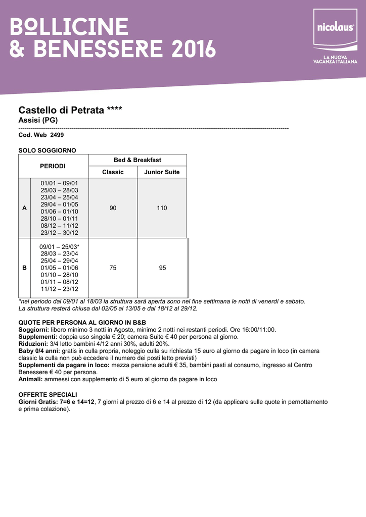 Castello di Petrata **** Assisi (PG) -----------------------------------------------------------------------------------------------------------------------------------Cod. Web 2499 SOLO SOGGIORNO PERIODI Bed & Breakfast Classic Junior Suite A 01/01 – 09/01 25/03 – 28/03 23/04 – 25/04 29/04 – 01/05 01/06 – 01/10 28/10 – 01/11 08/12 – 11/12 23/12 – 30/12 90 110 B 09/01 – 25/03* 28/03 – 23/04 25/04 – 29/04 01/05 – 01/06 01/10 – 28/10 01/11 – 08/12 11/12 – 23/12 75 95 *nel periodo dal 09/01 al 18/03 la struttura sarà aperta sono nel fine settimana le notti di venerdì e sabato. La struttura resterà chiusa dal 02/05 al 13/05 e dal 18/12 al 29/12. QUOTE PER PERSONA AL GIORNO IN B&B Soggiorni: libero minimo 3 notti in Agosto, minimo 2 notti nei restanti periodi. Ore 16:00/11:00. Supplementi: doppia uso singola € 20; camera Suite € 40 per persona al giorno. Riduzioni: 3/4 letto bambini 4/12 anni 30%, adulti 20%. Baby 0/4 anni: gratis in culla propria, noleggio culla su richiesta 15 euro al giorno da pagare in loco (in camera classic la culla non può eccedere il numero dei posti letto previsti) Supplementi da pagare in loco: mezza pensione adulti € 35, bambini pasti al consumo, ingresso al Centro Benessere € 40 per persona. Animali: ammessi con supplemento di 5 euro al giorno da pagare in loco OFFERTE SPECIALI Giorni Gratis: 7=6 e 14=12, 7 giorni al prezzo di 6 e 14 al prezzo di 12 (da applicare sulle quote in pernottamento e prima colazione).
