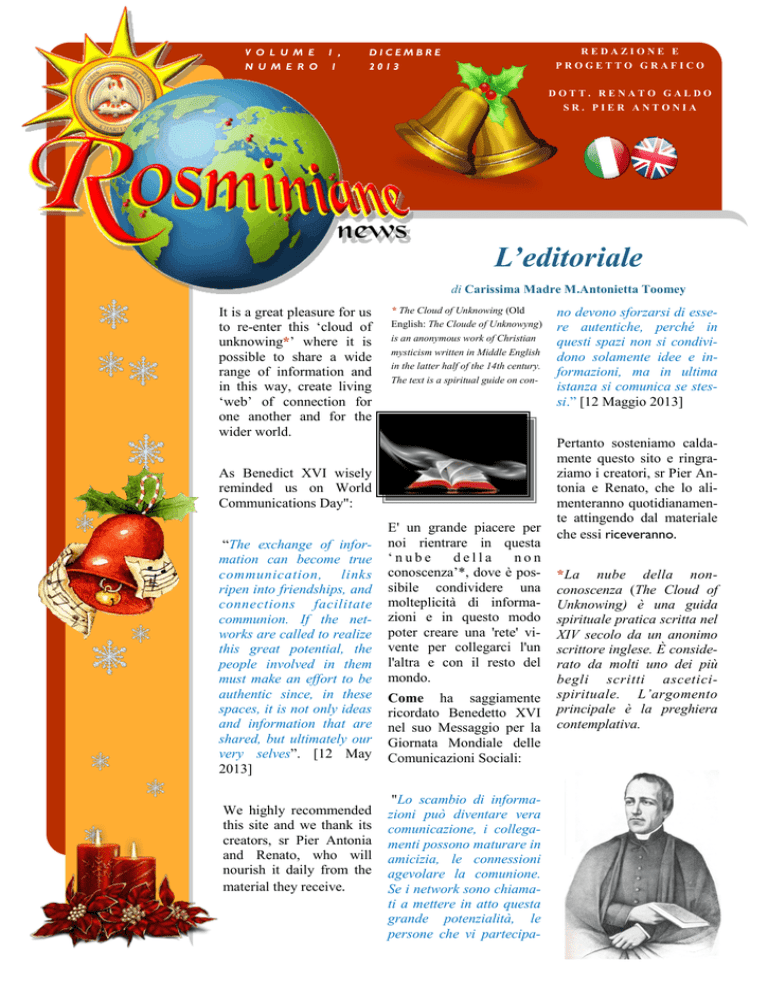V O L U M E 1 , N U M E R O 1 REDAZIONE E PROGETTO GRAFICO DICEMBRE 2013 DOTT. RENATO GALDO SR. PIER ANTONIA L’editoriale di Carissima Madre M.Antonietta Toomey It is a great pleasure for us to re-enter this ‘cloud of unknowing*’ where it is possible to share a wide range of information and in this way, create living ‘web’ of connection for one another and for the wider world. * The Cloud of Unknowing (Old English: The Cloude of Unknowyng) is an anonymous work of Christian mysticism written in Middle English in the latter half of the 14th century. The text is a spiritual guide on con- As Benedict XVI wisely reminded us on World Communications Day": “The exchange of information can become true communication, links ripen into friendships, and connections facilitate communion. If the networks are called to realize this great potential, the people involved in them must make an effort to be authentic since, in these spaces, it is not only ideas and information that are shared, but ultimately our very selves”. [12 May 2013] We highly recommended this site and we thank its creators, sr Pier Antonia and Renato, who will nourish it daily from the material they receive. E' un grande piacere per noi rientrare in questa ‘nube della non conoscenza’*, dove è possibile condividere una molteplicità di informazioni e in questo modo poter creare una 'rete' vivente per collegarci l'un l'altra e con il resto del mondo. Come ha saggiamente ricordato Benedetto XVI nel suo Messaggio per la Giornata Mondiale delle Comunicazioni Sociali: "Lo scambio di informazioni può diventare vera comunicazione, i collegamenti possono maturare in amicizia, le connessioni agevolare la comunione. Se i network sono chiamati a mettere in atto questa grande potenzialità, le persone che vi partecipa- no devono sforzarsi di essere autentiche, perché in questi spazi non si condividono solamente idee e informazioni, ma in ultima istanza si comunica se stessi.” [12 Maggio 2013] Pertanto sosteniamo caldamente questo sito e ringraziamo i creatori, sr Pier Antonia e Renato, che lo alimenteranno quotidianamente attingendo dal materiale che essi riceveranno. *La nube della nonconoscenza (The Cloud of Unknowing) è una guida spirituale pratica scritta nel XIV secolo da un anonimo scrittore inglese. È considerato da molti uno dei più begli scritti asceticispirituale. L’argomento principale è la preghiera contemplativa. PAGINA 2 Indice Pag 1 Editoriale Pag 3 A Borgomanero casa madre in festa Compleanno di Sr. Maria Francesca Pag 4 Ancora in festa per il primo incontro comunitario Consacrate a Gesù crocifisso Pag 5 Sulle Ande, evangelizzazione porta a porta Pag 6 Advent at the convent in Loughborough Pag 7 Noi della scuola dell’infanzia di Roma Natale Pag 8 Rosmini Children Centre , Tanzania Pag 9 Opera Pia Curti, Borgomanero Bioglio: scuole intitolate a due storiche maestre Pag 10 Chiavari, Casa rosmini un cantiere Pag 11 Doniamo un Natale Pag 12 Ottobre missionario Pag 13 Thank you from Kerala An Offer Pag 14 Reliquia di Santa Teresina a Maracaibo Intra : missione merenda … Pag 15 Melissa : Madonna dell’udienza A febbraio 2014 sono 39 anni … Pag 16 Speciale Scienza e Tecnologia Pag 18 Per ridere un po’ ... ROSMINIANE NEWS VOLUME 1, NUMERO da destra : la Carissima Madre, Sr. Maria Francesca, Sr. Grazia 1 PAGINA 3 A Borgomanero la casa madre in festa Il 12 settembre eravamo in preghiera di Vespro quando la Carissima M. Antonietta Toomey giunse con Madre Vicaria in sala di comunità. Così fu la Madre stessa ad accogliere noi che avanzavamo pian piano, tra l’imbarazzato e il felice. Carissima Madre, non si addice il benvenuto, come si fa solitamente con un ospite. Preferiamo dirti: <Bentornata alla Casa Madre. Bentornata in famiglia! Oggi noi, tue figlie maggiori, siamo nella gioia e come non esserlo dopo tanta attesa di te che vieni da lontano. Freniamo la curiosità e per prima cosa vogliamo dirti di noi, tue figlie maggiori, in missione di testi- di Sr. Grazia Repossi monianza. Sappiamo bene, Madre, che la testimonianza evangelica, appoggia sui due elementi portanti, della <contemplazione> e dell’<unità perché il mondo creda>. relle impegnate nelle periferie del mondo, entrando in Casa Madre, respirassero pace riposante, il profumo delle migliori tradizioni delle Suore della Provvidenza Rosminiane. E sappiamo anche di essere facilitate in questo compito, perché noi siamo solo indirettamente toccate dalle asperità del mondo, che fanno sovente ostacolo. Trovassero ancora vivo il carisma antiveggente del nostro Beato Padre Fondatore, ne subissero il fascino e ne ripartissero incoraggiate. Come vorremmo darti prova, Madre, che noi, tue figlie di lungo corso, viviamo davvero di contemplazione e carità. Ecco, Madre, questo è il nostro anelito più vero. Vorremmo poterti dire, Madre, che non è il tempo passato a occupare i nostri pensieri, ma, piuttosto, la consapevolezza di essere chiamate da Gesù, oggi, alla pienezza della contemplazione e all’unità delle menti e dei cuori. Vorremmo poterti dire, Madre, che questa sfida ci mantiene vigorose e che la Casa Madre, con la sua chiesa e il suo chiostro, è per noi un continuo, discreto richiamo alla coerenza. La Madre esaltando la bellezza del paesaggio dell’Italia, attraversata in macchina da Roma per giungere a noi, ci fece una breve presentazione personale con humor: <Io provengo dal Sud dell’Irlanda, da un ambiente semplice, al punto che voi non avete davanti ai vostri occhi, la Regina d’Inghilterra….> Il ghiaccio era veramente rotto, così che il mazzo di fiori offerto e l’abbraccio che ne seguì per ciascuna, poté assumere il tono di calda promessa. Come sarebbe bello che le so- … la festa continua con il compleanno di Sr. Maria Francesca ... L’abbiamo voluto celebrare a modo nostro, servendoci del bel logo di Suor Ilaria e di una melodia nota, per arricchire il nostro testo augurale. Ne è risultato - peccato che non possiate 