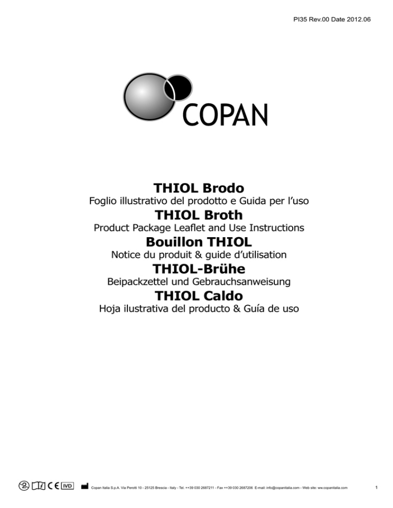 PI35 Rev.00 Date 2012.06 Thiol Brodo Foglio illustrativo del prodotto e Guida per l’uso THIOL Broth Product Package Leaflet and Use Instructions Bouillon THIOL Notice du produit & guide d’utilisation THIOL-Brühe Beipackzettel und Gebrauchsanweisung THIOL Caldo Hoja ilustrativa del producto & Guía de uso Copan Italia S.p.A. Via Perotti 10 - 25125 Brescia - Italy - Tel. ++39 030 2687211 - Fax ++39 030 2687206 E-mail: [email protected] - Web site: ww.copanitalia.com 1 Thiol Brodo- Foglio illustrativo del prodotto e Guida per l'uso ITALIANO PI35 REV 00; 2012.06 USo PREViSTo il Thiol Brodo è un terreno di crescita universale che favorisce la crescita di microrganismi anaerobi che può essere utilizzato in microbiologia clinica come mezzo di arricchimento per i campioni clinici. Il THIOL Brodo può essere usato con sistemi automatici per la coltura e la semina su piastra (Copan WASP incluso). RiASSUNTo Il THIOL Brodo è costituito da una soluzione di destrosio, peptone e L-cystina e estratto di lievito che forniscono i fattori di crescita essenziali per la replicazione batterica. Gli ioni essenziali sono forniti dal sodio cloruro. Sodio tioglicollato ed Lcystina agiscono come agenti riducenti che contribuiscono a prevenire l’accumulo di perossidi ed a mantenere un basso potenziale redox supportando l’anaerobiosi. Il THIOL Brodo è disponibile con un volume da 4 ml in provette con tappo a vite da 12x80. REAGENTi Componenti del brodo Thiol Brodo (per litro): Nome dei componenti L-cystina Sodio cloruro Glucosio Estratto di lievito Digerito pancreatico di caseina Sodio tioglicollato Acqua distillata g/litro 0.5 2.5 5.5 5.0 15.0 0.5 1000mL iMMAGAZZiNAGGio Questo prodotto è pronto per l’uso e non sono necessarie ulteriori operazioni di preparazione. Il lotto imballato nella confezione originale può essere conservato a 5—25ºC fino al momento dell’uso o fino alla data di scadenza. Non surriscaldare. Non incubare o congelare prima dell’uso. Un immagazzinaggio inappropriato può causare una perdita di efficacia. Non usare dopo la data di scadenza, che è stata stampata chiaramente sull'esterno della scatola. DETERioRAMENTo DEl PRoDoTTo Non usare il Thiol Brodo se: (1) il prodotto mostra segni visibili di danni o di contaminazione; (2) ci sono indizi di perdite; (3) è stata superata la data di scadenza; (4) ci sono altri segni di deterioramento. MATERiAli FoRNiTi Codice Descrizione del prodotto Dimensioni della confezione Adatto per l’automazione 087CU.A 5 provette in polipropilene da 12X80 con tappo a vite e forma interna conica contenenti 4ml di THIOL Brodo imbustate in condizioni di atmosfera modificata. 15 unità per confezione interna. 10x15 unità per scatolone. SI MATERiAli RiChiESTi MA NoN FoRNiTi Materiali adeguati per la coltura e l’isolamento di batteri; riferirsi ai manuali di riferimento del laboratorio ed ai protocolli raccomandati per le tecniche di coltura e identificazione. iSTRUZioNi PER l’USo-PREliEVo DEl CAMPioNE CliNiCo Una raccolta adeguata dei campioni dal paziente è un fattore estremamente critico per l’isolamento e l’identificazione di successo degli organismi infettivi. Per una guida specifica riguardante i procedimenti di raccolta dei campioni, consultare i manuali di riferimento pubblicati. Il sistema Copan ESwab può essere utilizzato come sistema di prelievo e preservazione; riferirsi a Copan per indicazioni riguardo al più appropriato codice e riferirsi al PI del prodotto per le istruzioni per l’uso. iSTRUZioNi PER l’USo – PRoCEDURA iN lABoRAToRio OPERAZIONI MANUALI 1. Aprire la busta in plastica ed estrarre le provette di THIOL Brodo. 2. Svitare il tappo dalla provetta di THIOL Brodo. 3. Inoculare il campione nella provetta aperta: • Per campioni liquidi, utilizzare un’ansa o una micro pipetta per trasferire il campione nella provetta. • Per campioni in Eswab, dopo omogenizzazione della provetta per 10sec con vortex, svitare il tappo e trasferire il tampone dall’ ESwab alla provetta di THIOL Brodo utilizzando delle pinzette sterili. Alternativamente, mediante utilizzo di una micropipetta, trasferire almeno 30µL di terreno Amies inoculato direttamente nel THIOL Brodo. Tappare nuovamente la provetta di ESwab. 4. Tappare nuovamente la provetta di THIOL Brodo e omogenizzare per 5-10 secondi a 2000/2500 rpm per mezzo di un vortex. 5. Incubare le provette di THIOL Brodo inoculate a 35 ± 2 °C. 6. Esaminare la provetta di THIOL Brodo dopo 18-24 ore. Una torbidità nella provetta è indicativa di crescita microbica. 7. Procedere alla semina su idoneo terreno in piastra. La semina su piastra può essere eseguita direttamente utilizzando il tampone o mediante la semina di un’aliquota di campione prelevata con adatto strumento di prelievo (micropipetta, ansa ecc.) e successiva distribuzione su piastra. Seminare almeno 1 ul di campione. 8. Incubare le piastre per 18-24 ore a 35 ± 2 °C in opportune condizioni di anaerobiosi o secondo la procedura standard di laboratorio. 9. Al termine dell’incubazione procedere alla lettura delle piastre. OPERAZIONI CON SISTEMA AUTOMATICO (WASP) il Thiol Brodo è prodotto in formato adatto per essere processato mediante sistemi automatici di semina (WASP). Mediante la WASP è possibile inoculare direttamente nel Thiol Brodo, i campioni clinici raccolti con sistema ESwab; la conferma dell’avvenuta crescita nel Thiol Brodo può altresì essere eseguita mediante sistema WASP. INOCULO DEL BRODO CON WASP 1. Processare il campione raccolto in ESwab attraverso uno specifico protocollo per inoculo dei brodi utilizzando l’ansa da 30µL. Referirsi al Manuale d’uso della WASP per ulteriori informazioni. 2. Esaminare la provetta di THIOL Brodo dopo 18-24 ore. Una torbidità nella provetta è indicativa di crescita microbica. SEMINA SU PIASTRA DEL BRODO ARRICCHITO CON WASP 1. Processare il campione arricchito in THIOL Brodo mediante opportuno protocollo di semina su idoneo terreno in piastra utilizzando