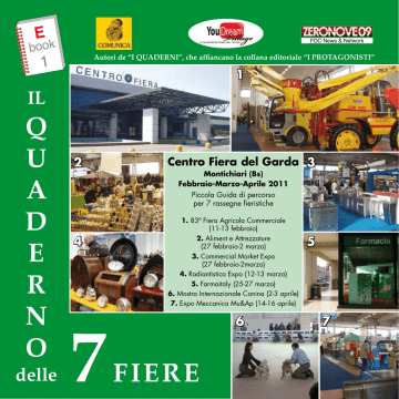 E book FDC News & Network 1 Autori de “I QUADERNI”, che affiancano la collana editoriale “I PROTAGONISTI” 1 IL Q U A D E R N O delle 2 4 7 Centro Fiera del Garda 3 Montichiari (Bs) Febbraio-Marzo-Aprile 2011 Piccola Guida di percorso per 7 rassegne fieristiche 1. 83ª Fiera Agricola Commerciale (11-13 febbraio) 2. Aliment e Attrezzature (27 febbraio-2 marzo) 3. Commercial Market Expo (27 febbraio-2marzo) 4. Radiantistica Expo (12-13 marzo) 5. Farmaitaly (25-27 marzo) 6. Mostra Internazionale Canina (2-3 aprile) 7. Expo Meccanica Mu&Ap (14-16 aprile) 6 FIERE 5 7 E book 1 IL QUADERNO delle 7 FIERE 2 Hai un’azienda agricola? + + + UGUALE Via A. Vespucci, 27 - 25024 Leno (BS) Tel. 030/906438 - Fax 030/9038241 - [email protected] - www.bmcgomme.net LA VIA PIÙ BREVE E book 1 IL QUADERNO delle 7 FIERE 3 LA CITTÀ DEI TALENTI IN 10 NAZIONI La scopriamo anche con questi Quaderni. Dopo il successo del primo libro della collana “I Protagonisti”. Con la presentazione pubblica del libro “I PROTAGONISTI DI MONTICHIARI”, avvenuta il 10 dicembre 2010, (Giornata Mondiale Onu dei Diritti Umani) nella sala Mario Pedini della Biblioteca Conte Treccani degli Alfieri di Montichiari, si è aggiunto un mattone importante alla costruzione della rete internazionale denominata CITTÀ DEI TALENTI. Si è trattato infatti dell’inizio della collana editoriale I PROTAGONISTI (editore Comunica sas di Orzinuovi) che è pubblicata anche sul sito www.youdream.info. Una serie di edizioni che metteranno in risalto esempi palpabili di TALENTI umani messi a disposizione della Comunità. Talenti nei campi più svariati dell’esistenza umana: educazione, scienza, religione, artigianato, industria, aeronautica, archeologia, volontariato, arte, poesia, marketing, social network e molto altro. Talenti che sono apparsi chiari durante i 22 Convegni svolti da ZERONOVE NETWORK tra il 2007 ed il 2009 in tre regioni del Nord Italia (Lombardia, Veneto ed Emilia) e che sono stati resi noti con il cofanetto “UN SOGNO CHE VIVE” contenente la Guida YDV, 180 fotografie ed oltre tre ore di filmati. Talenti che stanno dando vita in almeno 10 Paesi del Mondo ai “Centri per lo Sviluppo dei Talenti” (Centri YDV), che poi diverranno “Villaggi dei Sogni e dei Talenti” (YouDreamVillage) e quindi la grande rete, virtuale e fisica, della CITTA’ DEI TALENTI, il cui Manifesto verrà concluso e stilato con il terzo volume della Trilogia “IL CODICE AQUAROSE”, previsto entro il 2012. A tutto questo si aggiungono ora questi “QUADERNI” il cui primo numero è dedicato alle sette manifestazioni fieristiche programmate tra febbraio ed aprile 2011 nei padiglioni del Centro Fiera del Garda. Altri Quaderni sono in programmazione dedicati ad eventi interessanti (sagre, inaugurazioni, musei, turismo, sport, cultura, associazioni, volontariato, animali, natura, colline, fiumi etc.). Il mio ringraziamento principale è dedicato a Paolo Lombardi, titolare della Comunica sas editrice del mensile Paese Mio, che ha creduto in questo progetto e che ne sta valorizzando i contenuti con la sua determinazione, passione ed onestà intellettuale. Mario Cherubini Giornalista e scrittore-CP19 25018 Montichiari (Bs) Coordinatore di Zeronove Network e Città dei Talenti www.youdream.info [email protected] “I talenti dell’uomo sono come le perle contenute nell’ostrica, nascosta in fondo al mare. Occorre sforzarsi ed organizzarsi per trovarle e valorizzarle nella loro bellezza” Il libro: “I Protagonisti di Montichiari” E book 1 IL QUADERNO delle 7 FIERE 4 QUADERNI SU CARTA STAMPATA, MA ANCHE ONLINE E SU MAXI SCHERMO Il Maxischermo posizionato davanti al Centro Fiera e rivolto sulla provinciale Brescia-Mantova. Le manifestazioni fieristiche del Centro Fiera del Garda, di cui parliamo in questo primo Ebook della serie “I QUADERNI” sono sette: 83° Fiera Agricola Commerciale (11-13 febbraio) Aliment e Attrezzature (27 febbraio-2 marzo) Commercial Market Expo (27 febbraio-2 marzo) Radiantistica Expo (12-13 marzo) Farmaitaly (25-27 marzo) Mostra Internazionale Canina (2-3 aprile) Expo Meccanica Mu&Ap (14-16 aprile) Quindi questo primo Quaderno copre uno spazio distributivo che inizia l’11 febbraio e termina il 16 aprile, oltre due mesi, durante i quali i contenuti saranno presenti anche nelle pagine del mensile Paese Mio (12.000 copie mensili solo a Montichiari), nel sito online dello stesso giornale e della Città dei Talenti (www.youdream.info), collegata anche al canale di YouTube e Facebook. Si apre pertanto una rete di collegamento tra i link dei nostri portali e quelli dei clienti che posseggono un sito internet. Un target di mercato molto ampio, che comprende gli espositori in fiera, i visitatori ed i residenti, aziende e famiglie. Ci troviamo davanti ad un Network importante, sottolineato anche dall’utilizzo del Maxi Schermo che si trova davanti al Centro Fiera le cui immagini non sfuggono alle migliaia di automobilisti che ogni giorno transitano sulla via Brescia che collega il capoluogo bresciano alla provincia di Mantova. IL QUADERNO DI PAESE MIO Supplemento di Paese Mio-febbraio 2011 Reg. Trib. Bs n.9-3/6/1997 Direttore Editoriale: Paolo Lombardi Direttore Responsabile: Wilda Nervi Direttore della Comunicazione: Mario Cherubini Editrice: Comunica sas di Paolo Lombardi & C. Corso Cavour 42- 25034 Orzinuovi (Bs) Tel. 030-9941863 Fax: 030-9444122 [email protected] Stampa: Ciessegrafica-Montichiari Si ringrazia la gentile collaborazione di: -La Città dei Talenti -Zeronove Network di FDC - Centro Fiera di Montichiari E book 1 IL QUADERNO delle 7 FIERE 5 IL CENTRO FIERA DEL GARDA UNA CITTADELLA CON DIECI PADIGLIONI SU UN’AREA DI 248.000 MQ dimensioni, il secondo quartiere fieristico della Lombardia. La società di gestione Centro Fiera S.p.A. è partecipata dal Comune di Montichiari e dalla Provincia di Brescia. Il suo capitale Sociale è di 516.000 euro, di cui 80% per Amministrazione Comunale di Montichiari e 20% Ammi