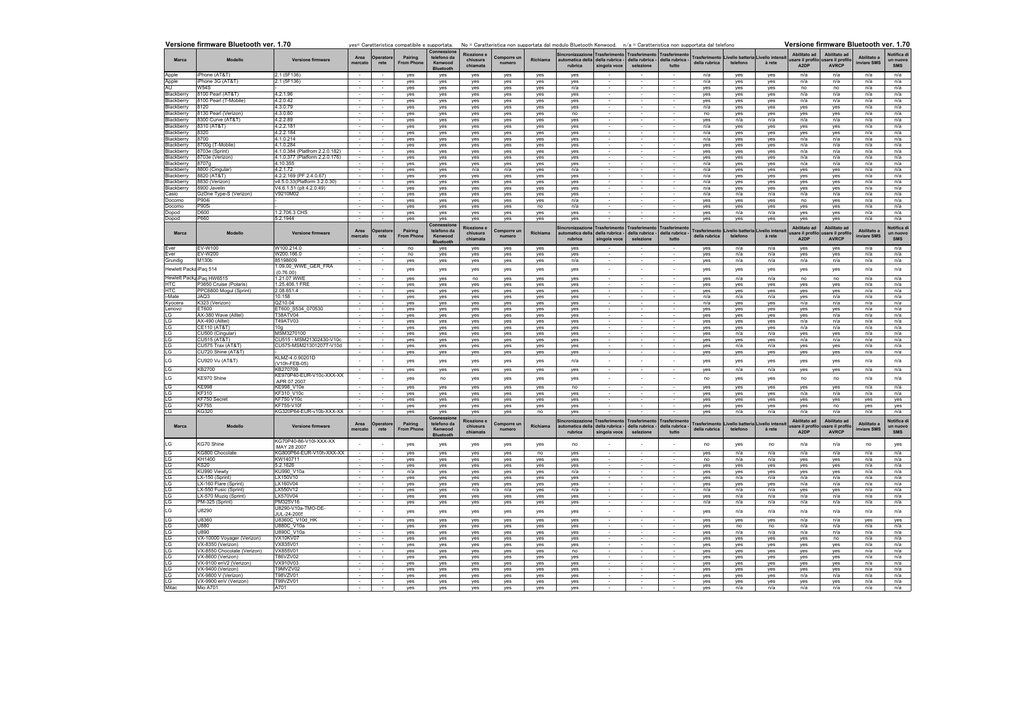 Versione firmware Bluetooth ver. 1.70 Marca Apple Apple AU Blackberry Blackberry Blackberry Blackberry Blackberry Blackberry Blackberry Blackberry Blackberry Blackberry Blackberry Blackberry Blackberry Blackberry Blackberry Blackberry Casio Docomo Docomo Dopod Dopod Modello iPhone (AT&T) iPhone 3G (AT&T) W54S 8100 Pearl (AT&T) 8100 Pearl (T-Mobile) 8120 8130 Pearl (Verizon) 8300 Curve (AT&T) 8310 (AT&T) 8320 8700 8700g (T-Mobile) 8703e (Sprint) 8703e (Verizon) 8707g 8800 (Cingular) 8820 (AT&T) 8830 (Verizon) 8900 Javelin GzOne Type-S (Verizon) P904i P905i D600 P660 Marca Ever Ever Grundig Modello EV-W100 EV-W200 M130b Hewlett PackaiPaq 514 Hewlett PackaiPaq HW6515 HTC P3650 Cruise (Polaris) HTC PPC6800 Mogul (Sprint) i-Mate JAQ3 Kyocera K323 (Verizon) Lenovo ET600 LG AX-380 Wave (Alltel) LG AX-490 (Alltel) LG CE110 (AT&T) LG CU500 (Cingular) LG CU515 (AT&T) LG CU575 Trax (AT&T) LG CU720 Shine (AT&T) LG CU920 Vu (AT&T) LG KB2700 LG KE970 Shine LG LG LG LG LG KE998 KF310 KF750 Secret KF755 KG320 Marca Modello LG KG70 Shine LG LG LG LG LG LG LG LG LG KG800 Chocolate KH1400 KS20 KU990 Viewty LX-150 (Sprint) LX-160 Flare (Sprint) LX-550 Fusic (Sprint) LX-570 Muziq (Sprint) PM-325 (Sprint) LG U8290 LG LG LG LG LG LG LG LG LG LG LG Mitac U8360 U880 U890 VX-10000 Voyager (Verizon) VX-8350 (Verizon) VX-8550 Chocolate (Verizon) VX-8600 (Verizon) VX-9100 enV2 (Verizon) VX-9400 (Verizon) VX-9800 V (Verizon) VX-9900 enV (Verizon) Mio A701 yes= Caratteristica compatibile e supportata. Versione firmware 2.1 (5F136) 2.1 (5F136) 4.2.1.96 4.2.0.42 4.3.0.79 4.3.0.60 4.2.2.89 4.2.2.181 4.2.2.184 4.1.0.214 4.1.0.284 4.1.0.384 (Platfrom 2.2.0.182) 4.1.0.377 (Platform 2.2.0.176) 4.10.355 4.2.1.72 4.2.2.169 (PF 2.4.0.67) v4.5.0.33(Platform 3.2.0.30) V4.6.1.51 (plt 4.2.0.49) V9210M02 1.2.706.3 CHS 5.2.1944 Versione firmware W100.214.0 W200.166.0 85198609 1.09.00_WWE_GER_FRA (0.76.00) 1.21.07 WWE 1.25.406.1 FRE 2.08.651.4 10.158 QZ10.04 ET600_S534_070530 T38ATV04 T49ATV03 10g MSM3270100 CU515 - MSM21302430-V10c CU575-MSM21301207T-V10d KLMZ-4.0.90201D (V10h-FEB-05) KB270709 KE970P40-EUR-V10c-XXX-XX APR 07 2007 KE998_V10e KF310_V10c KF750 V10c KF755-V10f KG320P64-EUR-v10b-XXX-XX Versione firmware KG70P40-86-V10l-XXX-XX MAY 28 2007 KG800P64-EUR-V10h-XXX-XX KW140711 5.2.1626 KU990_V10a LX150V10 LX160V04 LX550V12 LX570V04 PM325V16 U8290-V10a-TMO-DEJUL-24-2005 U8360C_V10d_HK U880C_V10a U890C_V10a VX10KV07 VX835V01 VX855V01 T86VZV02 VX910V03 T9MVZV02 T98VZV01 T99VZV01 A701 Area Operatore mercato rete - - Area Operatore mercato rete - - No = Caratteristica non supportata dal modulo Bluetooth Kenwood. Pairing From Phone Connessione telefono da Kenwood Bluetooth Ricezione e chiusura chiamata Comporre un numero Richiama yes yes yes yes yes yes yes yes yes yes yes yes yes yes yes yes yes yes yes yes yes yes yes yes yes yes yes yes yes yes yes yes yes yes yes yes yes yes yes yes yes yes yes yes yes yes yes yes yes yes yes yes yes yes yes yes yes yes yes yes yes yes yes n/a yes yes yes yes yes yes yes yes yes yes yes yes yes yes yes yes yes yes yes yes yes yes yes n/a yes yes yes yes yes yes yes yes yes yes yes yes yes yes yes yes yes yes yes yes yes yes yes yes yes yes yes yes yes no yes yes Pairing From Phone Connessione telefono da Kenwood Bluetooth Ricezione e chiusura chiamata Comporre un numero Richiama no no yes yes yes yes yes yes yes yes yes yes yes yes yes Versione firmware Bluetooth ver. 1.70 n/a = Caratteristica non supportata dal telefono Sincronizzazione Trasferimento Trasferimento Trasferimento Abilitato ad Abilitato ad Trasferimento Livello batteria Livello intensit automatica della della rubrica - della rubrica - della rubrica usare il profilo usare il profilo della rubrica telefono à rete rubrica singola voce selezione tutto A2DP AVRCP yes yes n/a yes yes yes no yes yes yes yes yes yes yes yes n/a yes yes yes yes n/a n/a yes yes - - - n/a n/a yes yes yes n/a no yes n/a n/a n/a yes yes yes n/a n/a n/a n/a n/a n/a yes yes yes yes yes yes yes yes yes yes yes n/a yes yes yes yes yes yes yes yes yes yes yes n/a yes yes n/a yes yes yes yes yes yes yes yes n/a yes yes yes yes yes yes yes yes yes yes yes n/a yes yes n/a yes n/a n/a no n/a n/a yes yes n/a yes yes n/a n/a n/a n/a n/a yes yes yes yes n/a no yes yes yes n/a n/a no n/a n/a yes yes n/a yes yes n/a n/a n/a n/a n/a yes yes yes yes n/a yes yes yes yes Sincronizzazione Trasferimento Trasferimento Trasferimento Abilitato ad Abilitato ad Trasferimento Livello batteria Livello intensit automatica della della rubrica - della rubrica - della rubrica usare il profilo usare il profilo della rubrica telefono à rete rubrica singola voce selezione tutto A2DP AVRCP yes yes n/a - - - yes yes yes n/a n/a n/a n/a n/a n/a yes yes n/a yes yes n/a Abilitato a inviare SMS Notifica di un nuovo SMS n/a n/a n/a n/a n/a n/a n/a n/a n/a n/a n/a n/a n/a n/a n/a n/a n/a n/a n/a n/a n/a n/a n/a n/a n/a n/a n/a n/a n/a n/a n/a n/a n/a n/a n/a n/a n/a n/a n/a n/a n/a n/a n/a n/a n/a n/a n/a n/a Abilitato a inviare SMS Notifica di un nuovo SMS n/a n/a n/a n/a n/a n/a - - yes yes yes yes yes yes - - - yes yes yes yes yes n/a n/a - - yes yes yes yes yes yes yes yes yes yes yes yes yes yes yes yes yes yes yes yes yes yes yes yes yes yes no yes yes yes yes yes yes yes yes yes yes yes yes yes yes yes yes yes yes yes yes yes yes yes yes yes yes yes yes yes yes yes yes yes yes yes yes yes yes yes yes yes yes yes yes yes yes yes yes yes yes yes - - - yes yes yes n/a n/a yes yes yes yes yes yes yes yes n/a yes yes n/a yes yes yes yes yes n/a yes n/a yes n/a yes yes n/a yes yes yes yes yes n/a yes n/a yes no yes yes yes n/a yes yes n/a n/a yes n/a yes yes no yes yes n/a n/a yes n/a n/a n/a yes n/a yes yes n/a n/a n/a n/a n/a n/a n/a n/a n/a n/a n/a n/a n/a n/a n/a n/a n/a n/a n/a n/a n/a n/a n/a n/a n/a n/a - - yes yes yes yes yes n/a - - - yes yes yes yes yes n/a n/a - - yes yes yes yes yes yes - - - yes n/a n/a yes yes n/a n/a - - yes no yes yes yes yes - - - no yes yes no no n/a n/a - - yes ye