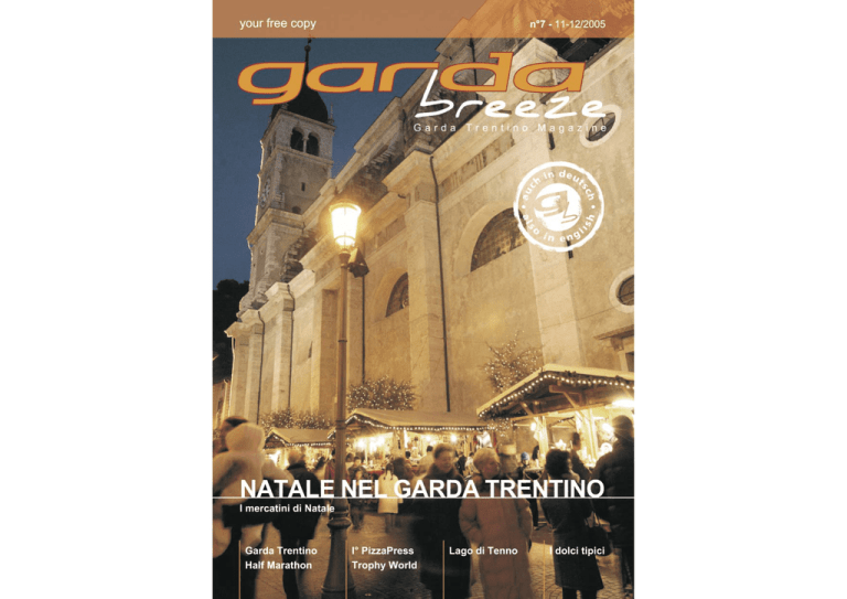 contents events GARDA TRENTINO HALF MARATHON NATALE NEL GARDA TRENTINO lifestyle I MERCATINI DI NATALE congress & exhibition culture sights 4 /8 16 I° PIZZAPRESS TROPHY WORLD 18 PAGINE DEL GARDA STAGIONE DI PROSA 2005-2006 RIVA DEL GARDA 22 /26 IL LAGO DI TENNO IL “PERCORSO ALLE CAVRE” wine & dine I DOLCI TIPICI 30 /34 36 GARDA BREEZE info & Co. gardabreeze 42 PERIODICO DI INFORMAZIONE TURISTICA DEL GARDA TRENTINO Anno 1 numero 7/2005 Registrazione Tribunale di Rovereto n. 260 del 03.03.2005 Editore: Ufficio Eventi Società Cooperativa Direttore responsabile: Claudio Chiarani Progetto editoriale e grafico: etymo gmbh-srl - BZ/TN Redazione e pubblicità: eVenti - Riva del Garda (TN) tel. +39.0464.560113 - [email protected] Stampa: Grafica5 - Arco Foto: ufficio eVenti, Ingarda Trentino S.p.A., Ronny Kiaulhen, Comune di Riva del Garda - Area Cultura, Comune di Arco, Trentino Eventi, PizzaPress Quality, Il Sommolago, Comune di Dro, Euroedit 3 events di Arco. In occasione di questa edizione il Collegio degli Ingegneri della provincia di Trento, che tra i suoi obiettivi propone anche l’attività sportiva, disputa il primo “Trofeo podistico Collegio degli Ingegneri” del Trentino. La gara si svolge su di un percorso interamente asfaltato che si conclude a Riva del Garda in Piazza Tre Novembre. Sul fronte dei partecipanti si registrano iscrizioni provenienti dall’estero e un nutrito numero di italiani in rappresentanza di quasi tutte le regioni: tale grado di partecipazione permette alla Garda Trentino Half Marathon di collocarsi, nelle mezze maratone, tra le dieci manifestazioni podistiche più numerose d’Italia. GARDA TRENTINO HALF MARATHON 4 GARDA TRENTINO HALF MARATHON 1° TROFEO PODISTICO COLLEGIO DEGLI INGEGNERI DEL TRENTINO La quarta edizione della Garda Trentino Half Marathon, corsa podistica internazionale riservata alle categorie Juniores, Promesse, Seniores, Amatori e Senior Master maschili e femminili sulla distanza di Km 21,097 scatterà domenica 13 novembre 2005 alle ore 10.00 con qualsiasi condizione di tempo dal Piazzale Segantini 4 4. GARDA TRENTINO HALF MARATHON 1° LAUFTROPHÄE “COLLEGIO DEGLI INGEGNERI DEL TRENTINO” Die vierte Ausgabe des Garda Trentino Half Marathon startet am Sonntag, den 13. November 2005 um 10.00 Uhr unabhängig vom Wetter vom Piazzale Segantini in Arco. Der Wettlauf über 21,097 km gilt für die Kategorien Juniores, Anwärter, Seniores, Amateure und Senior Master, Frauen und Männer. Parallel dazu trägt 4 th GARDA TRENTINO HALF MARATHON 1° TRENTINO COLLEGE OF ENGINEERING ROAD RACE TROPHY The fourth edition of the Garda Trentino Half Marathon, an international road race for male and female Juniors, Young Hopefuls, Seniors, Amateurs and Senior Masters, over a distance of 21,097 Km, will set off from Piazzale Segantini, Arco on Sunday 13 November 2005 at 10 a.m. in any weather conditions. gardabreeze das Ingenieurskollegium der Provinz Trient, das zu seinen Zielsetzungen auch den Sport zählt, seinen ersten Wettlauf „Trofeo podistico Collegio degli Ingegneri” aus. Der Half Marathon findet auf einer asphaltierten Strecke statt; das Ziel ist Riva del Garda, Piazza Tre Novembre. Die Teilnehmer kommen zum Teil aus dem Ausland, während Italien mit fast allen Regionen vertreten ist. Wegen der durchschnittlich sehr hohen Teilnehmerzahl zählt der Garda Trentino Half Marathon zu den zehn best besetzten nationalen Wettrennen. 1270 Läufer nahmen letztes Jahr teil, eine Zahl, die heuer sicher überboten wird. Die On the occasion of this edition the Trentino Provincial College of Engineering, whose aims include sporting activities, will run the first Trentino “College of Engineering Road Race Trophy”. The race will be run over a completely asphalted route that ends at Riva del Garda in Piazza Tre Novembre. Many participants from abroad have already registered, together with a great number of Italians representing almost all the Regions of Italy: such numerous participation places the Garda Trentino Half Marathon among the ten road races with the most participants in Italy. Last year 1270 people took part, a number that will be even L’anno scorso i partecipanti furono 1270, un numero destinato ad essere superato in quest’edizione, mentre per la cronaca vinsero il tunisino Rachid Amor e l’italiana Elisa Desco con il tempo, rispettivamente, di un’ora, tre minuti e trentadue secondi e un’ora, sedici minuti e trentadue secondi. Tante le iniziative collaterali: su iniziativa di alcune cantine provenienti dalle regioni Sicilia, Puglia, Toscana, Veneto e Trentino saranno portati in mostra e offerti in degustazione dei vini novelli per la “Festa del Novello Italiano”, mentre alcune aziende locali organizzeranno la seconda edizione di “Gustati il Trentino”, degustazione gratuita con possibilità d’acquisto di tutti i prodotti tipici del Trentino tra cui i famosi “Marroni” gardabreeze 5 events Gewinner waren der Tunesier Rachid Amor mit einer Zeit von 1h 3’ 32’’, und die Italienerin Elisa Desco mit 1h 16’ 32’’. Eine ganze Reihe gastronomischer Veranstaltungen begleitet dieses Sportevent. Weinproduzenten aus den Regionen Sizilien, Apulien, Toskana, Veneto und Trentino präsentieren ihre neuen Weine anlässlich des „Festa del Novello Italiano“, während lokale Betriebe im Rahmen greater in this edition. Last year a Tunisian, Rachid Amor and an Italian, Elisa Desco, won with the respective times of one hour three minutes and thirty two seconds, and one hour, sixteen minutes and thirty two seconds. There are many associated events: wineries from Sicily, Puglia, Tuscany, Veneto and Trentino will exhibit and offer tastes of new wine for the “Festa del Novello Italiano”, and some local firms will organize di Pranzo, la “Spressa Dop” delle Valli Giudicarie, la trota del fiume Sarca con polenta, le mele e lo strudel di mele, i salumi del Trentino, e tutti i vini prodotti sul territorio. Il Palameeting aprirà l