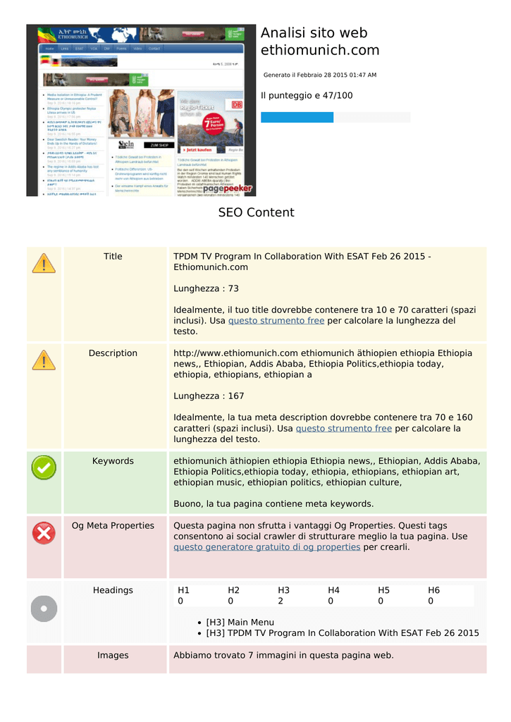 Analisi sito web ethiomunich.com Generato il Febbraio 28 2015 01:47 AM Il punteggio e 47/100 SEO Content Title TPDM TV Program In Collaboration With ESAT Feb 26 2015 Ethiomunich.com Lunghezza : 73 Idealmente, il tuo title dovrebbe contenere tra 10 e 70 caratteri (spazi inclusi). Usa questo strumento free per calcolare la lunghezza del testo. Description http://www.ethiomunich.com ethiomunich äthiopien ethiopia Ethiopia news,, Ethiopian, Addis Ababa, Ethiopia Politics,ethiopia today, ethiopia, ethiopians, ethiopian a Lunghezza : 167 Idealmente, la tua meta description dovrebbe contenere tra 70 e 160 caratteri (spazi inclusi). Usa questo strumento free per calcolare la lunghezza del testo. Keywords ethiomunich äthiopien ethiopia Ethiopia news,, Ethiopian, Addis Ababa, Ethiopia Politics,ethiopia today, ethiopia, ethiopians, ethiopian art, ethiopian music, ethiopian politics, ethiopian culture, Buono, la tua pagina contiene meta keywords. Og Meta Properties Headings Questa pagina non sfrutta i vantaggi Og Properties. Questi tags consentono ai social crawler di strutturare meglio la tua pagina. Use questo generatore gratuito di og properties per crearli. H1 0 H2 0 H3 2 H4 0 H5 0 H6 0 [H3] Main Menu [H3] TPDM TV Program In Collaboration With ESAT Feb 26 2015 Images Abbiamo trovato 7 immagini in questa pagina web. SEO Content 2 attributi alt sono vuoti o mancanti. Aggiungi testo alternativo in modo tale che i motori di ricerca possano comprendere meglio il contenuto delle tue immagini. Text/HTML Ratio Ratio : 20% Buono, il rapporto testo/codice HTML di questa pagina e maggiore di 15, e minore di 25 percento. Flash Iframe Terribile, hai contenuti Flash, questo significa che per i motori di ricerca e difficile comprendere il contenuto. Grande, non sono stati rilevati Iframes in questa pagina. SEO Links URL Rewrite Buono. I tuoi links appaiono friendly! Underscores in the URLs Abbiamo rilevato underscores nei tuoi URLs. Dovresti utilizzare trattini per ottimizzare le pagine per il tuo SEO. In-page links Abbiamo trovato un totale di 40 links inclusi 1 link(s) a files Statistics External Links : noFollow 0% External Links : Passing Juice 82.5% Internal Links 17.5% In-page links Anchor Type Juice Home Interno Passing Juice Abugida Externo Passing Juice Addisvoice Externo Passing Juice ECADF Externo Passing Juice Ethiomedia Externo Passing Juice In-page links EMF Externo Passing Juice Ethiopiazare Externo Passing Juice Ethiopianreview Externo Passing Juice Goolgule Externo Passing Juice Fnotenetsanet Externo Passing Juice Quatero Externo Passing Juice Zehabesha Externo Passing Juice Ethiogermany Externo Passing Juice ESAT Externo Passing Juice VOA Externo Passing Juice DW Externo Passing Juice Poems Interno Passing Juice Video Interno Passing Juice Contact Interno Passing Juice Young Ethiopian Musicians Rising! Externo Passing Juice የሸንጎና የብሔራዊ ም/ቤት የጋራ መግለጫ Externo Passing Juice ታላቅ ጥሪ፣ ፕሮፈሰር አስራት ወልደየስን ለመዘከር Externo Passing Juice Ethiopia shall overcome Externo Passing Juice ሼክ አላሙዲን የህወሃትን 40 ኛ አመት በአል በአዲስ አበባ ስፖንሰር አደረጉ Externo Passing Juice ESAT Radio Thu 26 Feb 2015 Externo Passing Juice ዝቋላ ሀገሩ የት ነው?– ከዳንኤል ክብረት Externo Passing Juice Ethiopia shall overcome (by Yilma Bekele) Externo Passing Juice አጥፍቶ ጠፊዎች! – ከኪዳኔ አማነ Externo Passing Juice ከአንድነት ሰሜን አሜሪካ ድጋፍ ማህበርና ከሰማያዊ ሰሜን አሜሪካ ድጋፍ ማህበር የተሰጠ የጋራ መግለጫ!! Externo Passing Juice ለዲያቆን ዳንኤል ክብረት ፣ከኤርሚያስ ለገሰ /የመለስ ትሩፋቶች /የተሰጠ ምላሽ Externo Passing Juice በወላይታ ዞን 30 የሰማያዊ አባላትና ደጋፊዎች ታሰሩ Externo Passing Juice ከአንድነት ሰሜን አሜሪካ ድጋፍ ማህበርና ከሰማያዊ ሰሜን አሜሪካ ድጋፍ ማህበር የተሰጠ የጋራ መግለጫ Externo Passing Juice In-page links ሕወሃት እና የባቡር ፖለቲካ – ምላሽ ለሕወሃቱ ጦማሪ – ግርማ ካሳ Externo Passing Juice የፊታችን አርብ ታላቅ አገር አቀፍ ተቃውሞ ይኖረናል «እስር ከትግላችን አያስቆመንም!» ድምጻችን ይሰማ!! Externo Passing Juice የ9ኙ ፓርቲዎች ትብብር ሊያደርገው የነበረውን ሰላማዊ ሰልፍ ላልተወሰነ ጊዜ ማስተላለፉን ገለጸ Externo Passing Juice Weltbank-Projekt in Äthiopien Gewalt statt Hilfe Interno Passing Juice Amnesty: Äthiopien geht gnadenlos gegen Oromo-Volk vor Interno Passing Juice "Wunderheiler" darf nicht in Garching predigen Interno Passing Juice © wetter.net Externo Passing Juice Free Joomla Templates Externo Passing Juice SEO Keywords Keywords Cloud 27, ድጋፍ የጋራ esat 26, feb ሰሜን program አሜሪካ tpdm Consistenza Keywords Keyword Contenuto feb 23 26, 11 esat 8 27, 5 አሜሪካ 4 Title Keywords Description Usabilita Url Dominio : ethiomunich.com Lunghezza : 15 Favicon Grande, il tuo sito usa una favicon. Stampabilita Non abbiamo riscontrato codice CSS Print-Friendly. Headings Usabilita Lingua Buono. La tua lingua dichiarata en. Dublin Core Questa pagina non sfrutta i vantaggi di Dublin Core. Documento Doctype XHTML 1.0 Transitional Encoding Perfetto. Hai dichiarato che il tuo charset e UTF-8. Validita W3C Errori : 46 Avvisi : 48 Email Privacy Grande. Nessun indirizzo mail e stato trovato in plain text! Deprecated HTML Grande! Non abbiamo trovato tags HTML deprecati nel tuo codice. Suggerimenti per velocizzare Eccellente, il tuo sito web non utilizza nested tables. Molto male, il tuo sito web utilizza stili CSS inline. Molto male, il tuo sito web ha troppi file CSS files (piu di 4). Molto male, il tuo si