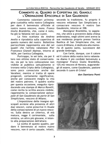 LA CASA SULLA ROCCIA - Parrocchia San Gaudenzio di Varallo - GENNAIO 2012 Commento al Quadro di Copertina del Gianoli: l'Ordinazione Episcopale di San Gaudenzio Commento volentieri un'immagine custodita nella nostra Collegiata per dare il benvenuto ufficiale al nostro nuovo vescovo, mons. Franco Giulio Brambilla, che, come è noto, ha già la Valsesia nel suo cuore. La foto scattata da Andrea Avolio e riprodotta sulla copertina di questo numero del nostro Bollettino parrocchiale rappresenta uno dei sei quadri che l'artista valsesiano Pier Francesco Gianoli dipinse, intorno al 1654, per l'antica Collegiata. Purtroppo, le sei tele, sia per il loro non ottimo stato di conservazione, sia per la loro collocazione non visibile al pubblico (attualmente si trovano nella Cripta della Collegiata), sono poco conosciute anche dai Varallesi, mentre si tratta di opere pregevoli, certamente significative, anche per conoscere meglio la vita del nostro patrono. Il quadro scelto per questa occasione, eseguito riproducendo una stampa di Marco Ravelli, come recita la scritta ancora visibile, rappresenta la consacrazione episcopale di San Gaudenzio da parte di San Simpliciano, vescovo di Milano. L'imposizione delle insegne episcopali avviene alla presenza di altri due vescovi, come prescrive il rituale della consacrazione di un nuovo vescovo. Sulla destra un chierico, di età matura, regge il cerimoniale, sulla sinistra, un altro più giovane, è intento alla preparazione dell'altare. La scelta di questo quadro, per dare il benvenuto al nostro nuovo vescovo, non è certo casuale, infatti, 3 secondo la tradizione, fu proprio il vescovo milanese San Simpliciano a consacrare vescovo il nostro San Gaudenzio, intorno al 398. Monsignor Brambilla, lo sappiamo, che oltre a provenire dalla chiesa ambrosiana, negli ultimi anni aveva la sua residenza proprio presso l'antica Basilica di San Simpliciano che, nel cuore di Milano, è dedicata alla memoria di questo santo, successore del grande Ambrogio. Con l'arte, dunque, con il calore ed il colore della nostra terra valsesiana diamo il più cordiale benvenuto a monsignor Franco Giulio Brambilla, 125.mo vescovo di Novara, augurandogli di essere, come Gaudenzio, pastore secondo il cuore di Cristo! don Damiano Pomi LA CASA SULLA ROCCIA - Parrocchia San Gaudenzio di Varallo - GENNAIO 2012 Una "Parola" Davvero Efficace, che ci da’ Lunga Vita! Il 13 febbraio inizia il "Cammino Biblico" proposto a tutta la Parrocchia Inoltre, quante parole "a vuoto" diciamo o magari ascoltiamo continuamente, di cui non ricordiamo nulla solo dopo pochi minuti … Noi viviamo nell'inflazione della parola (e dell'immagine). Non siamo più capaci di silenzio, perché questo ci riempie d'ansie, ci fa paura o addirittura ci mette tristezza! Inutile sottolineare l'importanza della parola, anche solo quella umana: una parola (due voti) decidono la sorte di un governo; un "sì" oppure un "no" decidono per la guerra o per la pace di una nazione, con implicazioni in tutto il resto del mondo. Un "sì" oppure un "no" decidono una vita a due oppure la solitudine. Una parola positiva o negativa conclude una sessione d'esame per uno studente e a volte può essere drammaticamente importante per la sua vita. Una parola può decidere se si viene assunti a fare un lavoro che probabilmente determinerà la nostra esistenza. Nella nostra vita quotidiana non solo ci sono le parole "a vuoto", ma poi ci sono le parole cattive, negative, che distruggono l'armonia, che creano forti divisioni, condannano, o sono addirittura malevole insinuazioni e possono rovinare la reputazione di altri. Cari Varallesi, come ci dice il bellissimo libro biblico del Deuteronomio (32, 47) "Quella del Signore non è una parola senza valore …" cioè non è mai destinata a cadere a vuoto per noi che la ascoltiamo; "anzi è la vostra vita, grazie a questa parola avrete lunga vita nel paese del quale andate a prendere possesso, passando il Giordano". Non dimentichiamo che però il Signore non parla sempre e comunque: della sua Parola si può dire che "era rara" ai tempi di Samuele, quando era ancora un bambino; oppure si dice anche che "La Parola del Signore fu rivolta a …" e segue il nome di un profeta e la data del messaggio, calcolata sugli anni del regnante in carica. Non c'è sempre e comunque, perché questo la renderebbe un "blabla", come la TV, come tante musiche o rumori di sottofondo che ascoltiamo perché ci tengano semplicemente compagnia. Dovremo fare attenzione a non usare-abusare della Bibbia in questo senso! C'è una grande differenza fra quando Dio parla e quando Dio tace. Bisogna tuttavia che taccia anche più spesso di quando parla, perché solo così apprezziamo quello che ci dirà nel momento di maggior bisogno. Ecco perché spesso ci capita di non sentire più Dio, magari nei momenti di scoraggiamento, di grande dolore, di solitudine… 4 LA CASA SULLA ROCCIA - Parrocchia San Gaudenzio di Varallo - GENNAIO 2012 mandata". Geremia parla della Parola di Dio come "un fuoco": "ecco, io farò in modo che la mia parola sia come fuoco nella tua bocca e che questo popolo sia il legno che quel fuoco divorerà (5,14)". Per Ezechiele la Parola di Dio è un libro dolce da mangiare: "apri la bocca e mangia ciò che ti do". Io guardai, ed ecco una mano stava stesa verso di me, la quale teneva il rotolo di un libro; lo srotolò davanti a me; era scritto di dentro e di fuori … Egli mi disse: "Figlio d'uomo, mangia ciò che trovi; mangia questo rotolo, e va' e parla alla casa d'Israele". Io aprii la bocca ed egli mi fece mangiare quel rotolo. Mi disse: "Figlio d'uomo, nùtriti il ventre e riempiti le viscere di questo rotolo che ti do". Io lo mangiai, e in bocca mi fu dolce come il miele". (Ez. 2,8 - 3,3). Bisogna che la Parola sia gustata, assaporata, mangiata, sminuzzata, che riempia le nostre viscere, che sia digerita, perché diventi forza vitale per tutti gli esseri umani. Perché "l'uomo non vive soltanto di pane, ma vive di tut