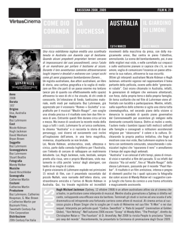 RASSEGNA 2008_2009 FILM N. 21 COME DIO LA AUSTRALIA IL GIARDINO DI LIMONI COMANDA DUCHESSA 27/28 FEBBRAIO Una ricca nobildonna inglese eredita una sconfinata tenuta in Australia con duemila capi di bestiame. Quando alcuni prepotenti proprietari terrieri cercano di impossessarsi dei suoi possedimenti, cerca l’aiuto di un mandriano per portare il bestiame al sicuro. Durante il loro avventuroso cammino attraverseranno luoghi impervi e desolati e vedranno con i propri occhi come gli aerei giapponesi bombardarono Darwin... Un regista australiano, due attori australiani, un libro di storia, una cartina geografica e la voglia di realizzare un film che parli di un paese enorme ma lontano (ancor più di quanto sia effettivamente nello spazio) attraverso la voce di chi ci ha vissuto, di chi crede di conoscerlo. Un’intenzione di fondo, tantissimo materiale, molti modi per realizzarlo: Buz Luhrmann, già apprezzato per il visionario “Romeo + Giulietta” e soprattutto per il musical “Moulin Rouge!”, non sceglie una strada precisa e il risultato sono ben due film invece di uno. Entrambi questi film durano circa un’ora e mezza. Ma invece di cavalcare la recente moda della saga a tutti i costi, Luhrmann fa un’unica confezione, la chiama “Australia” e ci racconta la storia di due personaggi, così diversi ed ovviamente così inclini all’esplosione dell’amore, in una terra magnifica, immensa, stupefacente se non brutale. Lei, Nicole Kidman, aristocratica, snob, altezzosa e cinica, parte dalla comoda Inghilterra per l’Australia, con l’intento di cercare di rattoppare un matrimonio deludente. Lui, Hugh Jackman, rude, bestiale, sempre pronto alla rissa, vero e proprio Mandriano, visto malamente in città perchè ‘amico’ degli aborigeni, con tanto di ex moglie di colore. Il genio visionario di Luhrmann esplode nei primissimi 15 minuti di film, con il preambolo raccontato dal piccolo Nullah, voce narrante dell’intera storia, uno straordinario omicidio e l’arrivo di Nicole Kidman in Australia. Qui, tra trovate registiche ed incredibili 13/14 MARZO 20/21 MARZO movimenti della macchina da presa, con dolly magicamente ariosi, Baz centra in pieno l’obiettivo, ammaliando. La scena del bombardamento, poi, è una delle migliori mai viste, e nelle carrellate sui crepacci o sulle vastissime pianure si capisce che c’è, se non amore, voglia di comunicare l’essenza un paese attraverso la sua natura, attraverso la sua oscurità. Ottimi gli interpreti australiani Nicole Kidman e Hugh Jackman: entrambi vigorosi nel rappresentare il tema portante della pellicola, ovvero uello delle “generazioni rubate”. Così erano chiamate in Australia, infatti, le generazioni di indigeni che venivano allontanati, con forza, dalla propria terra e dalla propria famiglia. Un tema scottante che nel film di Luhnrman viene affrontato con lucidità e partecipazione. Mentre, infatti, sulla superficie dello schermo si agita una storia tutta cinematografica, nel secondo piano della visione si denuncia lo scandalo di questo piano governativo del Commonwealth per assimilare gli indigeni nella dominante comunità bianca. Dietro ai mulini a vento, l’autore rivela i bambini (quasi tutti meticci) sottratti alle famiglie e consegnati a istituzioni assistenziali religiose per “sbiancarne” il colore e la cultura. Dichiarando la propria poetica imitativa, che finge di mostrare cose mai viste, Baz Luhrmann esplora la sua terra con sentimento smisurato, smascherando i colonizzatori inglesi che “epurarono il nero” e annullarono il tempo del sogno degli antenati. “Australia” è un colossal d’altri tempi, pieno di rimandi visivi e narrativi a film del passato. Si va infatti dal classico “Via col vento”, fino al “Moulin Rouge!” dello stesso Luhrmann, passando per il recente “Pearl Harbor”. Il risultato è un film ambizioso, intenso e pregno di elementi positivi tra i quali spiccano la fotografia dai colori accesi di Mandy Walzer ed i suggestivi campi lunghi che fanno da cornice a una trama articolata e magicamente avvincente. Hugh Michael Jackman (Sydney, 12 ottobre 1968) è un attore australiano attivo sia al cinema che a teatro, in particolare come interprete di musical. Mentre studia giornalismo a Sydney si diletta nel canto, sviluppando una efficace voce da baritono. Terminati gli studi si iscrive ad una scuola d’arte drammatica ed intraprende una fortunata carriera come attore di musical. Al cinema arriva al successo grazie a Bryan Singer che lo sceglie per il ruolo di Wolverine nel suo film “X-Men” e nei due sequel. Interpreta poi pellicole quali “Codice: Swordfish” e “Kate & Leopold” (nomination al Golden Globe), “Van Helsing”. Nell’autunno 2006 escono “Scoop” di Woody Allen, “The Prestige”, diretto da Christopher Nolan e “The Fountain” di D. Aronofsky. Nel 2008 la rivista People lo proclama “Uomo più sexy del mondo”. Recentemente, ha presentato la Cerimonia di premiazione degli Oscar 2009. FOCUS Anno 2008 Durata 165’ Origine Usa, Australia Regia Baz Luhrmann Cast Nicole Kidman Hugh Jackman David Wenham Bryan Brown Soggetto Baz Luhrmann Sceneggiatura Baz Luhrmann Stuart Beattie Fotografia Mandy Walker Musiche David Hirschfelder Scenografia Catherine Martin Costumi Catherine Martin Produzione Baz Luhrmann, Catherine Knapman, G. Mac Brown e Catherine Martin per Bazmark Films, Twentieth Century-Fox Film Corporation Distribuzione 20th Century Fox Italia 6/7 MARZO