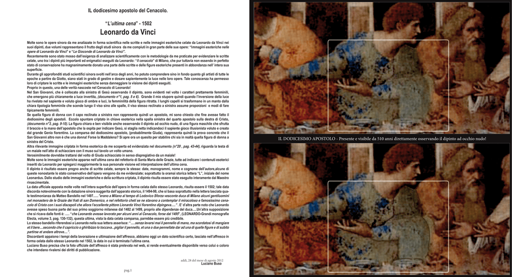 IL dodicesimo apostolo del Cenacolo. “L’ultima cena” - 1502 Leonardo da Vinci Molte sono le opere sinora da me analizzate in forma scientifica nelle scritte e nelle immagini esoteriche celate da Leonardo da Vinci nei suoi dipinti, due volumi rappresentano il frutto degli studi sinora da me compiuti in gran parte delle sue opere: “Immagini esoteriche nelle opere di Leonardo da Vinci” e “Le Gioconde di Leonardo da Vinci”. Recentemente sono stato mosso dall’esigenza di analizzare scientificamente con le metodologie da me praticate per evidenziare le scritte celate, uno tra i dipinti più importanti ed enigmatici eseguiti da Leonardo: “Il cenacolo” di Milano, che pur tuttavia non essendo in perfetto stato di conservazione ha magnanimamente donato una parte delle scritte e delle figure esoteriche presenti in abbondanza nell’ intera sua superficie. Durante gli approfonditi studi scientifici sinora svolti nell’arco degli anni, ho potuto comprendere sino in fondo quanto gli artisti di tutte le epoche a partire da Giotto, siano stati in grado di gestire e dosare sapientemente la luce nelle loro opere. Tale conoscenza ha permesso loro di criptare le scritte e le immagini esoteriche senza danneggiare la visione dei dipinti eseguiti. Proprio in questo, una delle verità nascoste nel Cenacolo di Leonardo! Nel San Giovanni, che è collocato alla sinistra di Gesù osservando il dipinto, sono evidenti nel volto i caratteri prettamente femminili, che emergono più chiaramente a luce invertita, (documento n°1, pag. 5 e 6). Grande il mio stupore quindi quando l’inversione della luce ha rivelato nel sapiente e voluto gioco di ombre e luci, la femminilità della figura ritratta. I lunghi capelli si trasformano in un manto dalla chiara tipologia femminile che scende lungo il viso sino alle spalle, il viso stesso reclinato a sinistra assume proporzioni e modi di fare tipicamente femminili. Se quella figura di donna con il capo reclinato a sinistra non rappresenta quindi un apostolo, mi sono chiesto che fine avesse fatto il dodicesimo degli apostoli. Eccolo spuntare criptato in chiave esoterica nella spalla sinistra del quarto apostolo sulla destra di Cristo, (documento n°3, pag. 9-10). La figura chiara e ben visibile anche osservando il dipinto ad occhio nudo, di una figura maschile che sfrutta il braccio e la mano dell’apostolo che la ospita per indicare Gesù, si staglia netta indicandoci il sapiente gioco illusionista voluto e creato dal grande Genio fiorentino. La comparsa del dodicesimo apostolo, (probabilmente Giuda), rappresenta quindi la prova concreta che il San Giovanni altro non è che una donna! Forse la Maddalena? Si apre ora un quesito per stabilire chi sia in realtà quella figura di donna a sinistra del Cristo. Altra rilevante immagine criptata in forma esoterica da me scoperta ed evidenziata nel documento (n°20 , pag. 43-44), riguarda la testa di un maiale nell’atto di schiacciare con il muso sul tavolo un volto umano. Verosimilmente dovrebbe trattarsi del volto di Giuda schiacciato in senso dispregiativo da un maiale! Molte sono le immagini esoteriche apparse nell’ultima cena del refettorio di Santa Maria delle Grazie, tutte ad indicare i contenuti esoterici inseriti da Leonardo per spiegarci maggiormente la sua personale visione ed interpretazione dell’ultima cena. Il dipinto è risultato essere pregno anche di scritte celate, sempre le stesse: date, monogrammi, nome e cognome dell’autore,alcune di queste nonostante lo stato conservativo dell’opera vengono da me evidenziate; soprattutto la oramai storica lettera “L”, iniziale del nome Leonardus. Dallo studio delle immagini esoteriche e della scrittura criptata, il dipinto risulta essere stato eseguito interamente dal Maestro rinascimentale. La data ufficiale apposta molte volte nell’intera superficie dell’opera in forma celata dallo stesso Leonardo, risulta essere il 1502; tale data discorda notevolmente con la datazione sinora suggerita dall’apparato storico, il 1494-98, che si basa soprattutto nella lettera lasciata quale testimonianza da Matteo Bandello nel 1497......”erano a Milano al tempo di Lodovico Sforza vesconte duca di Milano alcuni gentiluomini nel monastero de le Grazie dei frati di san Domenico, e nel refettorio cheti se ne stavano a contemplar il miracoloso e famosissimo cenacolo di Cristo con i suoi discepoli che allora l’eccellente pittore Lionardo Vinci fiorentino dipingeva.....” . E’ d’altra parte noto che Leonardo avesse speso buona parte del suo primo soggiorno milanese dal 1482 al 1499, proprio alle dipendenze del duca.....Un’altra supposizione che si ricava dalle fonti è: ..... “che Leonardo avesse lavorato per alcuni anni al Cenacolo, forse dal 1495”, (LEONARDO-Grandi monografie Electa, volume 3, pag. 130-132), questa ultima, vista la data celata comparsa, parrebbe essere più credibile. Lo stesso bandello riferendosi a Leonardo nella sua lettera asserisce: “.....senza levarsi mai il pennello di mano, ma scordatosi di mangiare et il bere....secondo che il capriccio o ghiribizzo lo toccava...pigliar il pennello, et una o due pennellate dar ad una di quelle figure e di subito partirse et andare altrove....”. Discordanti appaiono i tempi della lavorazione e ultimazione dell’affresco, abbiamo oggi un dato scientifico certo, lasciato nell’affresco in forma celata dallo stesso Leonardo nel 1502, la data in cui è terminata l’ultima cena. Luciano Buso precisa che la foto ufficiale dell’affresco è stata prelevata nel web, si rende eventualmente disponibile verso colui o coloro che intendano rivalersi dei diritti di pubblicazione. addì, 28 del mese di agosto 2012 Luciano Buso pag.1 IL DODICESIMO APOSTOLO - Presente e visibile da 510 anni direttamente osservando il dipinto ad occhio nudo! Leonardo da Vinci - ” L’ ultima cena”- 1502 - Tempera ed olio - Milano, refettorio di Santa Maria delle Grazie. PAG 3- particolare PAG 1 PAG 4 Scritte e fi