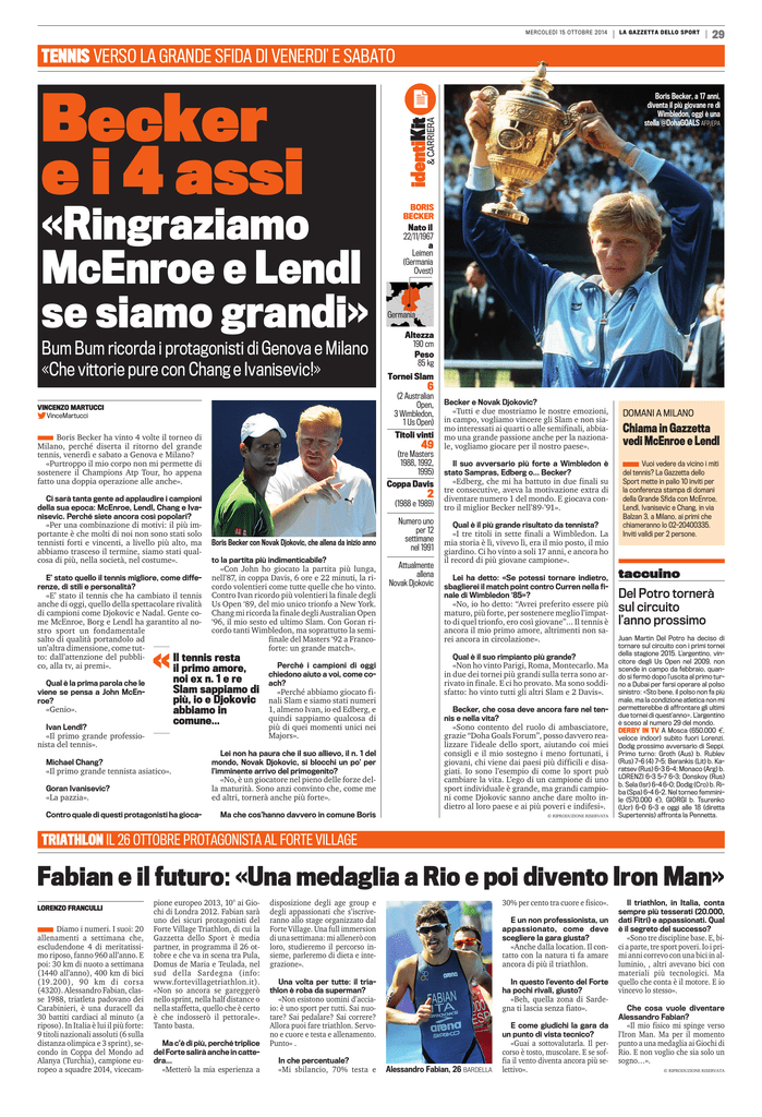 MERCOLEDÌ 15 OTTOBRE 2014 LA GAZZETTA DELLO SPORT 29 TENNIS VERSO LA GRANDE SFIDA DI VENERDI’ E SABATO v identiKit & CARRIERA Becker e i 4 assi BORIS BECKER «Ringraziamo McEnroe e Lendl se siamo grandi» Nato il 22/11/1967 a Leimen (Germania Ovest) Germania Altezza 190 cm Peso 85 kg Bum Bum ricorda i protagonisti di Genova e Milano «Che vittorie pure con Chang e Ivanisevic!» Tornei Slam 6 (2 Australian Open, 3 Wimbledon, 1 Us Open) Titoli vinti VINCENZO MARTUCCI VinceMartucci Boris Becker ha vinto 4 volte il torneo di Milano, perché diserta il ritorno del grande tennis, venerdì e sabato a Genova e Milano? «Purtroppo il mio corpo non mi permette di sostenere il Champions Atp Tour, ho appena fatto una doppia operazione alle anche». 49 (tre Masters 1988, 1992, 1995) Coppa Davis 2 Ci sarà tanta gente ad applaudire i campioni della sua epoca: McEnroe, Lendl, Chang e Iva nisevic. Perché siete ancora così popolari? «Per una combinazione di motivi: il più im portante è che molti di noi non sono stati solo tennisti forti e vincenti, a livello più alto, ma abbiamo trasceso il termine, siamo stati qual cosa di più, nella società, nel costume». E’ stato quello il tennis migliore, come diffe renze, di stili e personalità? (1988 e 1989) « Qual è la prima parola che le viene se pensa a John McEn roe? «Genio». Ivan Lendl? to la partita più indimenticabile? «Il primo grande professio nista del tennis». «Il primo grande tennista asiatico». Attualmente allena Novak Djokovic «Con John ho giocato la partita più lunga, nell’87, in coppa Davis, 6 ore e 22 minuti, la ri cordo volentieri come tutte quelle che ho vinto. Contro Ivan ricordo più volentieri la finale degli Us Open ‘89, del mio unico trionfo a New York. Chang mi ricorda la finale degli Australian Open ‘96, il mio sesto ed ultimo Slam. Con Goran ri cordo tanti Wimbledon, ma soprattutto la semi finale del Masters ‘92 a Franco forte: un grande match». noi ex n. 1 e re Slam sappiamo di più, io e Djokovic abbiamo in comune... Michael Chang? Numero uno per 12 settimane nel 1991 Boris Becker con Novak Djokovic, che allena da inizio anno «E’ stato il tennis che ha cambiato il tennis anche di oggi, quello della spettacolare rivalità di campioni come Djokovic e Nadal. Gente co me McEnroe, Borg e Lendl ha garantito al no stro sport un fondamentale salto di qualità portandolo ad un’altra dimensione, come tut to: dall’attenzione del pubbli Il tennis resta co, alla tv, ai premi». il primo amore, «La pazzia». Contro quale di questi protagonisti ha gioca Becker e Novak Djokovic? «Tutti e due mostriamo le nostre emozioni, in campo, vogliamo vincere gli Slam e non sia mo interessati ai quarti o alle semifinali, abbia mo una grande passione anche per la naziona le, vogliamo giocare per il nostro paese». DOMANI A MILANO Il suo avversario più forte a Wimbledon è stato Sampras, Edberg o... Becker? Vuoi vedere da vicino i miti del tennis? La Gazzetta dello Sport mette in palio 10 inviti per la conferenza stampa di domani della Grande Sfida con McEnroe, Lendl, Ivanisevic e Chang, in via Balzan 3, a Milano, ai primi che chiameranno lo 0220400335. Inviti validi per 2 persone. «Edberg, che mi ha battuto in due finali su tre consecutive, aveva la motivazione extra di diventare numero 1 del mondo. E giocava con tro il miglior Becker nell’89’91». Qual è il più grande risultato da tennista? «I tre titoli in sette finali a Wimbledon. La mia storia è lì, vivevo lì, era il mio posto, il mio giardino. Ci ho vinto a soli 17 anni, e ancora ho il record di più giovane campione». Lei ha detto: «Se potessi tornare indietro, sbaglierei il match point contro Curren nella fi nale di Wimbledon ‘85»? «No, io ho detto: “Avrei preferito essere più maturo, più forte, per sostenere meglio l’impat to di quel trionfo, ero così giovane”... Il tennis è ancora il mio primo amore, altrimenti non sa rei ancora in circolazione». Qual è il suo rimpianto più grande? «Non ho vinto Parigi, Roma, Montecarlo. Ma in due dei tornei più grandi sulla terra sono ar rivato in finale. E ci ho provato. Ma sono soddi sfatto: ho vinto tutti gli altri Slam e 2 Davis». Perché i campioni di oggi chiedono aiuto a voi, come co ach? «Perché abbiamo giocato fi nali Slam e siamo stati numeri 1, almeno Ivan, io ed Edberg, e quindi sappiamo qualcosa di più di quei momenti unici nei Majors». Becker, che cosa deve ancora fare nel ten nis e nella vita? «Sono contento del ruolo di ambasciatore, grazie “Doha Goals Forum”, posso davvero rea lizzare l’ideale dello sport, aiutando coi miei consigli e il mio sostegno i meno fortunati, i giovani, chi viene dai paesi più difficili e disa giati. Io sono l’esempio di come lo sport può cambiare la vita. L’ego di un campione di uno sport individuale è grande, ma grandi campio ni come Djokovic sanno anche dare molto in dietro al loro paese e ai più poveri e indifesi». Lei non ha paura che il suo allievo, il n. 1 del mondo, Novak Djokovic, si blocchi un po’ per l’imminente arrivo del primogenito? «No, è un giocatore nel pieno delle forze del la maturità. Sono anzi convinto che, come me ed altri, tornerà anche più forte». Goran Ivanisevic? Boris Becker, a 17 anni, diventa il più giovane re di Wimbledon, oggi è una stella @DohaGOALS AFP/EPA Ma che cos’hanno davvero in comune Boris © RIPRODUZIONE RISERVATA Chiama in Gazzetta vedi McEnroe e Lendl taccuino Del Potro tornerà sul circuito l’anno prossimo Juan Martin Del Potro ha deciso di tornare sul circuito con i primi tornei della stagione 2015. L’argentino, vin citore degli Us Open nel 2009, non scende in campo da febbraio, quan do si fermò dopo l’uscita al primo tur no a Dubai per farsi operare al polso sinistro: «Sto bene, il polso non fa più male, ma la condizione atletica non mi permetterebbe di affrontare gli ultimi due tornei di quest’anno». L’argentino è sceso al numero 29 del mondo. DERBY IN TV A M