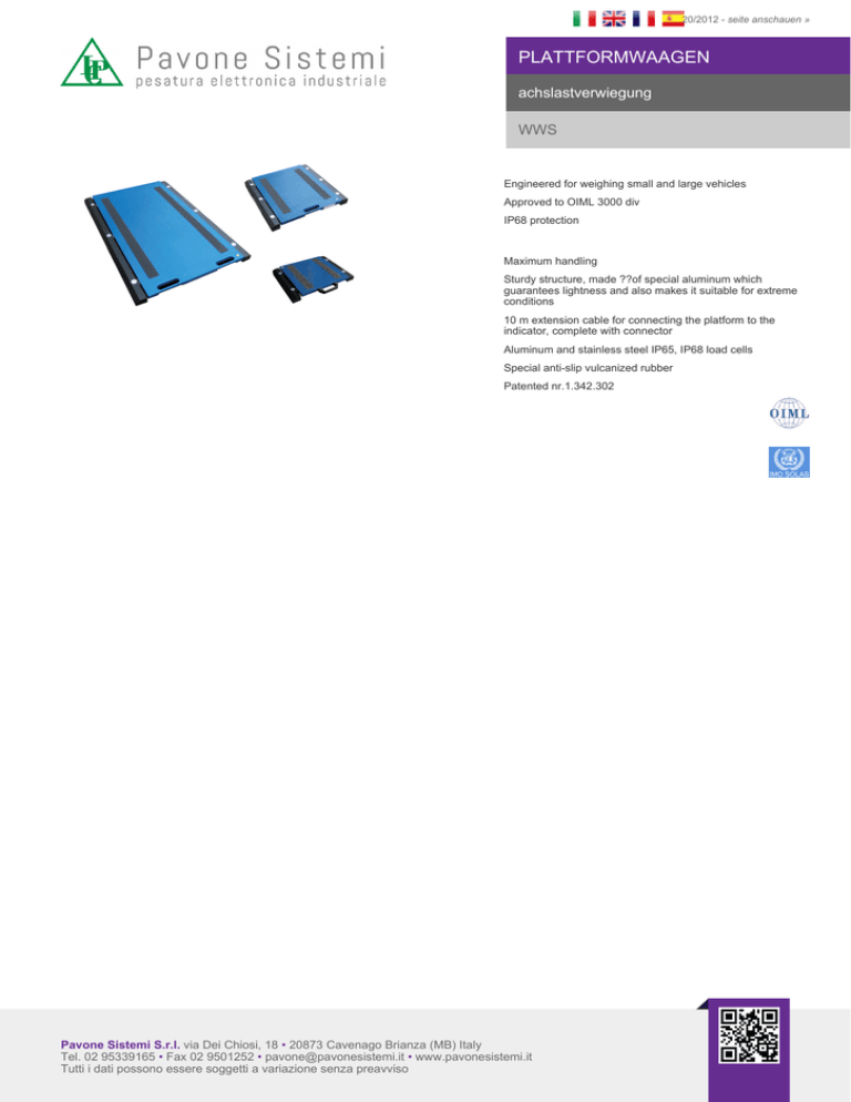 20/2012 - seite anschauen » PLATTFORMWAAGEN achslastverwiegung WWS Engineered for weighing small and large vehicles Approved to OIML 3000 div IP68 protection Maximum handling Sturdy structure, made ??of special aluminum which guarantees lightness and also makes it suitable for extreme conditions 10 m extension cable for connecting the platform to the indicator, complete with connector Aluminum and stainless steel IP65, IP68 load cells Special anti-slip vulcanized rubber Patented nr.1.342.302 Pavone Sistemi S.r.l. via Dei Chiosi, 18 • 20873 Cavenago Brianza (MB) Italy Tel. 02 95339165 • Fax 02 9501252 • [email protected] • www.pavonesistemi.it Tutti i dati possono essere soggetti a variazione senza preavviso 20/2012 - seite anschauen » PLATTFORMWAAGEN achslastverwiegung WWS Pavone Sistemi S.r.l. via Dei Chiosi, 18 • 20873 Cavenago Brianza (MB) Italy Tel. 02 95339165 • Fax 02 9501252 • [email protected] • www.pavonesistemi.it Tutti i dati possono essere soggetti a variazione senza preavviso