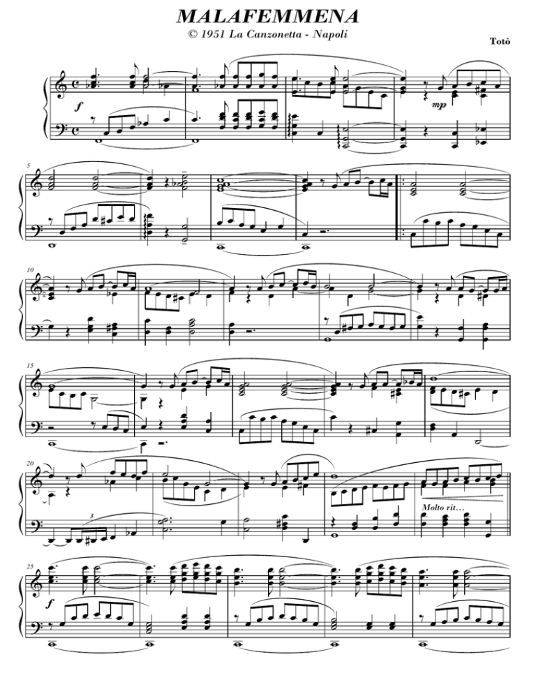 MALAFEMMENA © 1951 La Canzonetta - Napoli 5 & ˙˙˙ œ bœ œ œœ Œ b ˙˙˙˙ œ ˙˙ ˙ j œ. œ œ œw. b œ œ j œ œ . œœ œœœ w www w ~~~~~~ œ # œ œ œ œœ ‰ œ ? œœ œ Œ ˙ -̇ w j & œœœ ‰ œ œ œ b œœ œ œ wœ œ œ # œ œ˙ œ œ œ œ ˙˙ ? œ Œ œœ # œœœ œ œ ˙ œœœœœ œ w j œ ‰ œ œœ œ œœ œ œ ˙˙˙˙ œ Œ œ œœ ‰ œ œ œ œ Œ œœ œœ œ œ Ó. & wœ œ œ œ ˙ ?Ó w j œ œ & ‰Œ œ œ œ b œ œ œœ œ˙ œ œ œ ˙ œ œ 20 ? œ œ œ #œ œ œ bœ œ. œ. & œ. f ?‰œœ w 25 3 œ˙ œœ ˙˙ J ˙˙˙ .. . œ œ . œ œœ œœ œœ œœ œ . œœ .. œœ œ œ œ œ œœ .. J œœœœœ ˙ ˙˙ w œœ œ œœ œ œœœ ‰ œj œ œ œ œ œ .. ˙ ˙˙ œ .. œ œ Ó. w j œœ ‰ œ œœ œ œœ œ œ ˙œ œ Œ ‰ #œ œœ Ó . wœ 10 15 œ œ œ œ . œ œ œœj ˙ œ œ œ œ œ. œ œ œ ˙ œ œ œœ œœ œœ œœ œ œ œ œ œœ œ ˙ œ ˙˙ œœ ~~~~~~ j œœ ˙œ̇ œ bœ ~~~~~~ œœ .. c & bœ. f ?c ‰ œ œ w ˙ ˙˙˙ Totò ‰ œj œœ œ # œœ œ Œ œ œ P Œ œ bœ œ bœ ˙˙ ˙ œ œ œ œ œ œ œ œœ ‰ œj œ œ œ œ œ Œ œ #œ œ œ œ œ œ œ œ Œ œ œœ œ œ ˙˙ j œœœœ ‰ œ œœ œ # œœœ b œ œ wœœ œ œ # œ œ œ œœœ œ œœ Œ #œ œ œ œœ œ ˙ œ j œœ ‰ œ œœ œ# œœ w œ œ œ œ œ œ œ œœ œ œœ œ œœ œ œœœ œ œ Molto rit...œ œ œ œ œ œ œ ˙ Œ œœ œ œ œ œ œœ œ # œœ ˙ œ œ w œœ ˙˙ œ˙ J œœ . œœ œœ œœ œœ œœ œœ . œ .. œ œ œ œ œ œ .. J ‰ œ œ œ œ œ œ œ ˙˙ ˙ w w œœ œœ œœ ˙˙ œ˙ J ‰œœœœœœœ w œœ .. & œ. 30 ?˙ ˙ œœ œœ œœ œœ œœ ww œ œ œ œ œ w J j œ ˙ & wœw. ~~~~~~~~~ ? N www www œ. œœ .. œœœ œ œ & œœ œœ .. & œ. 45 œœ ˙˙ œ˙ J j œ œ œ œ œ œw. w 40 œ f œœ .. & œ. ? b www œ. π w b www j œ ˙ œ. wwww œœ .. œœ œœ œœ b œœ œœ www œ. œ œ œ bœ œ J œœ # œœœ œ œœ œœ œœ Uœœ œœ œœ .. bœ œ œ œ œ œ. J œww. w ˙˙˙˙ œœ œ w www ˙˙ ˙ ˙ ˙ œœ .. œ. ‰ œ œ œ œ œ œ œ ˙˙ ˙ w w œ bœ œ #œ N˙. ˙. 3 j œ œ œ œ œ ˙w w ˙ w # www 2. Trascrizione di Stefano Cucchi [email protected] œœ œœ ˙˙ œ˙ J ‰bœ œ œ œ œ œœ œ #œ œ bœ nœ w œ #œ œ bœ nœ w 5 ˙˙ œœ œ. b œœ .. ˙˙ œœ œ œ œ œ œ J J b wwww bœ bœ œ . œj œ œ œ œ œ .. ww b œ b œ w bœ œ ‰w œ œ œ œ œ œ w œœ ... œ œ œ œ œ œ ? œ. .. ww œ œœ b b ww Ó. 1. & w 55 bœ œ #œ œ bœ œ # œœ œœ œœ . œœ œœ œœ œœ œœ œ .. œ œ œ œ œ J œœ ˙˙ œ˙ J ww w ‰ œ œ #œ œ œ w œœ ˙˙ œ ˙ J j œ œ œ œ œ œœ œ œ œ œ œ œ J œ. œ ˙ J j œ # œ˙ œ œ œ ˙˙˙ ˙ œ. œ . œ œœ œœ œœ œœ œ . œœ .. œœ œ œ œ œ œœ .. J œ˙ œœ ˙˙ J œœœœœ ˙ Œ b b œœœ œ œ œ ‰ ˙˙ ˙ w w ? ‰œœœœœœœ ˙ w ˙ 50 ww w œ #œ œ œ œ œ œ w œw œ œœ # œœ œ 35 ? N œœœœ MALAFEMMENA ~~~~~ 2 ww w ww w Ó ˙