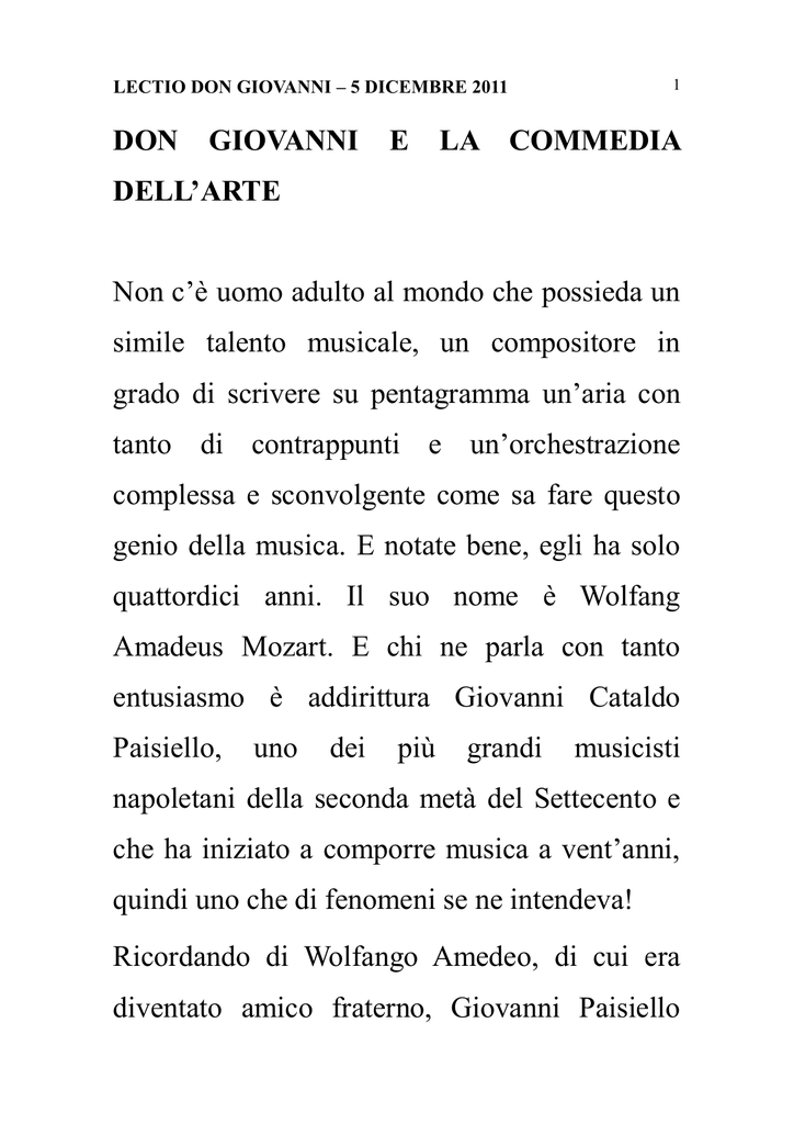 1 LECTIO DON GIOVANNI – 5 DICEMBRE 2011 DON GIOVANNI E LA COMMEDIA DELL’ARTE Non c’è uomo adulto al mondo che possieda un simile talento musicale, un compositore in grado di scrivere su pentagramma un’aria con tanto di contrappunti e un’orchestrazione complessa e sconvolgente come sa fare questo genio della musica. E notate bene, egli ha solo quattordici anni. Il suo nome è Wolfang Amadeus Mozart. E chi ne parla con tanto entusiasmo è addirittura Giovanni Cataldo Paisiello, uno dei più grandi musicisti napoletani della seconda metà del Settecento e che ha iniziato a comporre musica a vent’anni, quindi uno che di fenomeni se ne intendeva! Ricordando di Wolfango Amedeo, di cui era diventato amico fraterno, Giovanni Paisiello 2 LECTIO DON GIOVANNI – 5 DICEMBRE 2011 racconta un episodio legato al successo davvero straordinario del ragazzo austriaco: ci troviamo a Napoli al Conservatorio della Pietà dei Turchini, Amedeo meravigliosamente, sta all’istante suonando il pubblico rumoreggia. Le sue piccole mani volano sulla tastiera del cembalo. Soprattutto l’agilità della sinistra, dove porta un anello, sembra impressionare la gente. Qualcuno esclama: “Ecco il motivo di tanta abilità: ha un anello magico al dito!” Il giovane Mozart, che conosce bene la superstizione davvero fanatica dei napoletani, comprende divertito il motivo di tanto baccano, smette di suonare e tranquillamente si sfila l’anello dal dito, lo mostra al pubblico, se lo infila in una tasca e quindi riprende a suonare. Il pubblico ammutolisce. Evidentemente è solo lui LECTIO DON GIOVANNI – 5 DICEMBRE 2011 3 la vera magia! E alla fine del concerto lo applaudono urlando festosi. “Tu si’ ‘o re. Tu si’ ‘o nostro re!” Ora parleremo di Wolfango Amedeo cresciuto e del suo Don Giovanni, composto quando aveva circa trent’anni. Quest’opera è senz'altro uno dei maggiori capolavori del teatro musicale del Settecento. Già che ne abbiamo l'occasione anticipiamo subito che nel XVIII Secolo era quasi d'obbligo per i musici mettere in scena esclusivamente opere cantate in italiano, poiché la nostra lingua era considerata da ognuno l'unica perfettamente consona alla musica cantata. Il Don Giovanni, detto anche “El Burlador de 4 LECTIO DON GIOVANNI – 5 DICEMBRE 2011 Sevilla”, è un'opera da porsi fra le tragedie in musica, ma il suo assetto strutturale, quello che noi del teatro recitato chiamiamo la situazione scenica, è assolutamente mutuato dall'opera buffa o meglio ancora dalla commedia dell'arte o buffoneria! Ce lo testimonia Delia Gambelli, forse la più autorevole e documentata studiosa del teatro del Sei-Settecento in lingua italiana. Esistevano già al tempo di Wolfango Amedeo compositori che si erano serviti della commedia comica all'italiana per musicare un'opera lirica; ma ognuno si limitava a temi e svolgimenti assolutamente ridanciani dove era regola assoluta che la situazione comica fosse il motore principale dell'opera stessa. LECTIO DON GIOVANNI – 5 DICEMBRE 2011 5 Ma nel Don Giovanni, come è nella sua edizione originale (quella dello spagnolo Tirso De Molina), ci troviamo davanti a un testo assolutamente tragico dove il protagonista ci appare come un personaggio nient’affatto amabile, divertente, ma al contrario deprecabile, infame spietato gabbellatore di uomini e femmine. E tutti gli allestitori e gli autori del XVI secolo hanno sempre rispettato quella situazione dall’inizio alla fine del dramma che si risolve con una scena davvero infernale. Ma nel caso del Don Giovanni di Mozart succede un vero e proprio ribaltone scenico: il giovane autore austriaco sfascia a piedi giunti tutte le regole imposte nell’opera drammatica. Una scelta assolutamente fuori dal comune. Ma quella di sortire a bella posta dalla consuetudine era una costante di Wolfango forse imparata 6 LECTIO DON GIOVANNI – 5 DICEMBRE 2011 proprio a Napoli, frequentando i numerosi compositori ritenuti in quel tempo i più importanti d’Europa. Tutto ciò che si esprimeva dentro le leggi della forma stabilita immancabilmente veniva stravolto e ribaltato dal compositore di Salisburgo. Ma nel nostro caso, con il Don Giovanni, come è possibile introdurre un andamento scherzoso? Nell’opera si comincia con un atto criminale in cui il protagonista uccide il padre della donna che egli ha in animo di sedurre e quindi di seguito: inganni, tradimenti, menzogne e macchinerie orrende... E quale ne è il risultato? Per capirne il paradosso basta analizzare con molta attenzione i testi dai quali il giovane compositore di Salisburgo aveva tratto l’andamento dell’opera e la sua struttura scenica. E’ chiaro che Mozart aveva saltato a LECTIO DON GIOVANNI – 5 DICEMBRE 2011 7 piè pari l’idea di servirsi dell’impianto originale del dramma del creatore Tirso de Molina, che aveva debuttato con grande successo più di un secolo prima in Spagna. Si trattava di una vera e propria tragedia nel gusto e nella forma del teatro spagnolo di quel tempo e Mozart aveva scelto di affidarsi completamente all’inserimento del paradosso. Per inciso il Don Giovanni era stato allestito dai comici dell’arte a Parigi un secolo prima, già al tempo di Molière. A questo proposito va detto che Molière a sua volta mettendo in scena il Don Giovanni aveva fatto grande attenzione all’impianto creato dai comici italiani prima di lui. La compagnia dei Gelosi, diretta da Tiberio Fiorilli, aveva sbilanciato l’organizzazione interna dei canovacci in favore delle parti LECTIO DON GIOVANNI – 5 DICEMBRE 2011 8 comiche. Quella soluzione finiva per mettere in scena lo screditamento e la presa in giro di ogni potere. In poche parole i comici dell’arte, tornavano a realizzare una forma di spettacolo e di scrittura creata dai greci quattro secoli avanti Cristo, mettendo in primo piano quel modulo nel quale si dichiarava: non esiste nessuna forma di teatro ad autentica dimensione umana se non si intreccia il comico al tragico e vicev