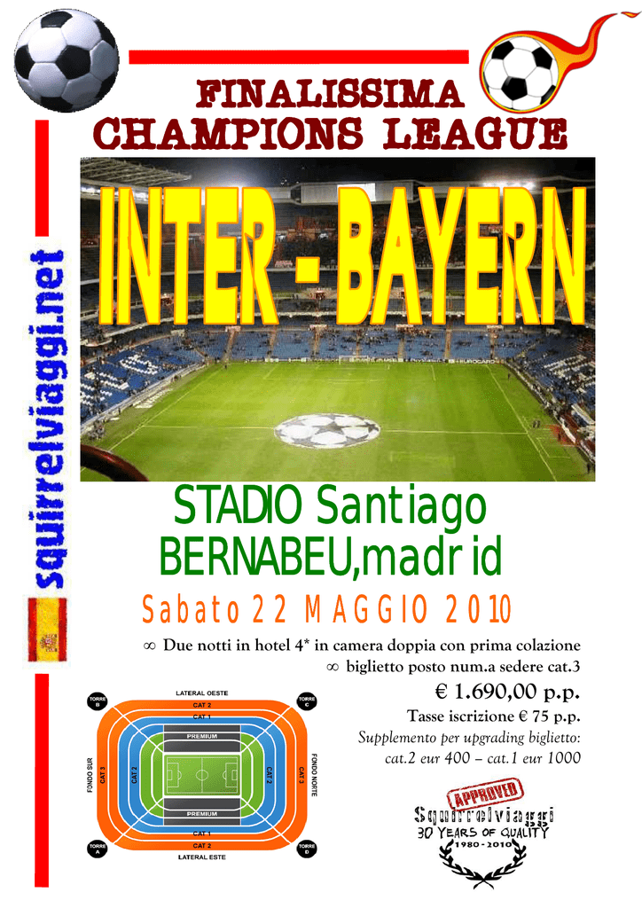 FINALISSIMA FINALISSIMA CHAMPIONS LEAGUE STADIO Santiago Santiago BERNABEU,madrid BERNABEU,madrid Sabato 22 MAGGIO 2010 • Due notti in hotel 4* in camera doppia con prima colazione • biglietto posto num.a sedere cat.3 € 1.690,00 p.p. Tasse iscrizione € 75 p.p. Supplemento per upgrading biglietto: cat.2 eur 400 – cat.1 eur 1000