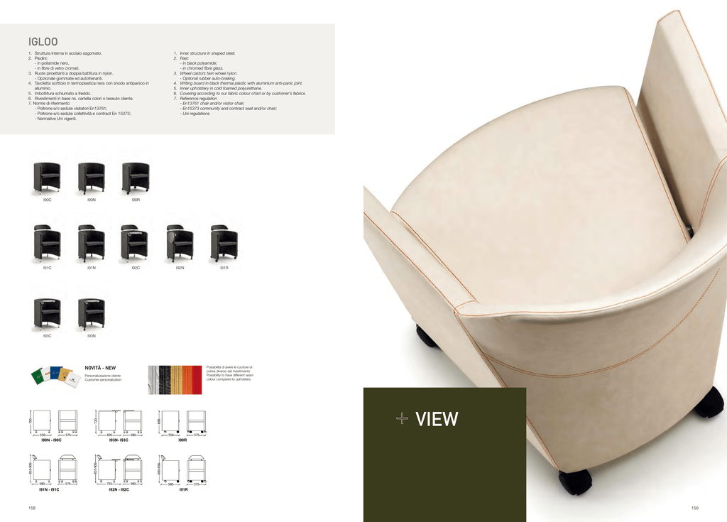 Igloo 1. Struttura interna in acciaio sagomato. 2.Piedini: - in poliamide nero, - in fibre di vetro cromati. 3. Ruote piroettanti a doppia battitura in nylon. - Opzionale gommate ed autofrenanti. 4. Tavoletta scrittoio in termoplastica nera con snodo antipanico in alluminio. 5. Imbottitura schiumato a freddo. 6. Rivestimenti in base ns. cartella colori o tessuto cliente. 7. Norme di riferimento - Poltrone e/o sedute visitatori En13761; - Poltrone e/o sedute collettività e contract En 15373; - Normative Uni vigenti. I90C I90N I90R I91C I91N I92C I93C I93N 1. Inner structure in shaped steel. 2.Feet: - in black polyamide; - in chromed fibre glass. 3. Wheel castors twin wheel nylon. - Optional rubber auto-braking. 4. Writing board in black thermal plastic with aluminium anti-panic joint. 5. Inner upholstery in cold foamed polyurethane. 6. Covering according to our fabric colour chart or by customer’s fabrics. 7. Reference regulation - En13761 chair and/or visitor chair; - En15373 community and contract seat and/or chair; - Uni regulations. I92N I91R NOVITÀ - NEW Possibilità di avere le cuciture di colore diverso dal rivestimento Possibility to have different seam colour compared to upholstery 550 575 695 550 575 575 I90R 800-890 810-900 580 I91N - I91C 158 580 I93N- I93C 810-900 I90N - I90C View 688 720 700 Personalizzazione cliente Customer personalization 725 I92N - I92C 580 580 575 I91R 159 View La serie View è una poltrona a pozzetto ricca di dettagli ed e capace di sposarsi bene con varie ambienti. The View series is a tub chair with many details and is adaptable for various environments. V60R V60C V61C V60R La serie View ha come caratteristica particolare un sedile ribaltabile che va aggiunta alla tavoletta scrittoio per confermare la sua completezza. The View series features a particular bucket seat along with a writing board to confirm its completeness. V60R 160 161 View V65C La serie View al massimo della sua flessibilità, una poltrona totalmente pieghevole per ridurre gli spazi. The View series is a true example of flexibility, a fully folding chair to reduce space. V63C La serie View si presenta nel suo modo più tradizionale con la possibilità di scelta fra ruote e piedini. V62R 162 The View series presents itself in the most traditional manner with choice of wheels or feet. V62C V64C 163 View 1. Struttura interna in acciaio sagomato. - pieghevole (V64C e V65C). 2.Piedini: - in poliamide nero; - in fibre di vetro cromati. 3. Ruote piroettanti a doppia battitura in nylon. - Opzionale gommate ed autofrenanti. 4. Sedile fisso o ribaltabile. 5. Tavoletta scrittoio: - in termoplastica nera con snodo antipanico in alluminio (V61C); - in termoplastica nera con snodo antipanico in nylon nero (V63C, V65C). 6. Imbottitura schiumato a freddo. 7. Rivestimenti in base ns. cartella colori o tessuto cliente. 8. Norme di riferimento - Poltrone e/o sedute visitatori En 13761; - Poltrone e/o sedute collettività e contract En 15373; - Normative Uni vigenti. V60R V60C V61C V62R V62C V63C V64C 1. Inner structure in shaped steel. - foldable (V64C e V65C). 2.Feet: - in black polyamide; - in chromed fibre glass. 3. Wheel castors twin wheel nylon. - Optional rubber auto-braking. 4. Seat fixed or bucket. 5. Writing board: - in black thermal plastic with aluminium anti-panic joint (V61C); - in black thermal plastic with black nylon anti-panic joint (V63C, V65C). 6. Inner upholstery in cold foamed polyurethane. 7. Covering according to our fabric colour chart or by customer’s fabrics. 8. Reference regulation - En 13761 chair and/or visitor chair; - En 15373 community and contract seat and/or chair; - Uni regulations. V65C NOVITÀ - NEW Possibilità di avere le cuciture di colore diverso dal rivestimento Possibility to have different seam colour compared to upholstery Personalizzazione cliente Customer personalization 655 Corner V61C 640 575 580 825 550 810 825 V62C 164 V60R 580 665 V62R 550 580 825 V60C 550 665 655 850 575 835 850 575 V63C - V65C V64C 165