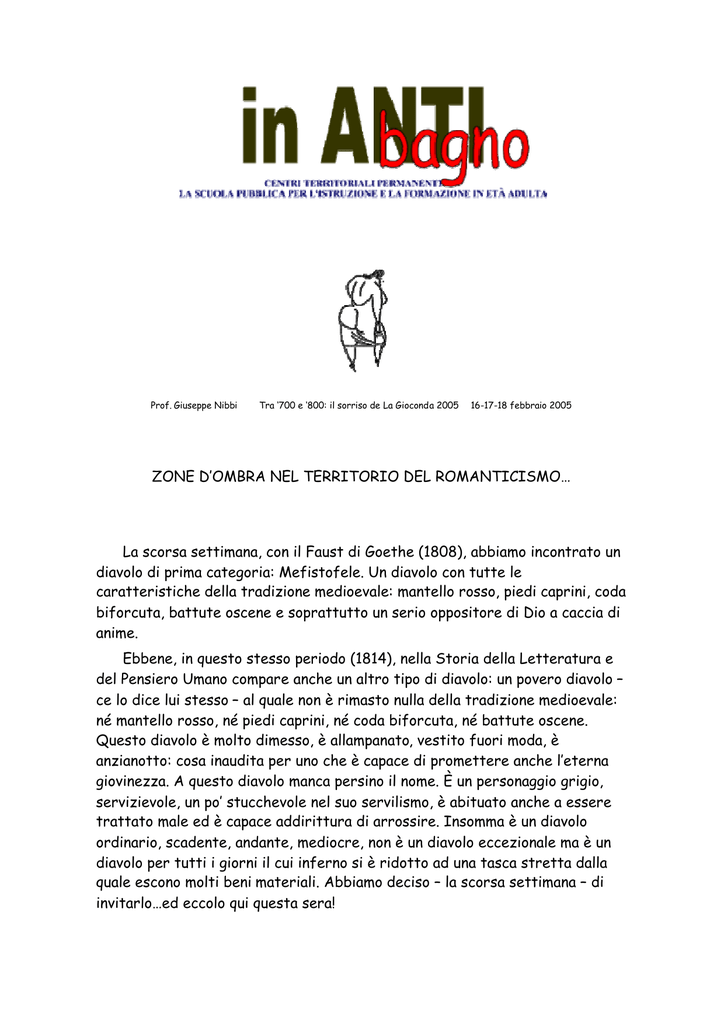 Prof. Giuseppe Nibbi Tra ‘700 e ‘800: il sorriso de La Gioconda 2005 16-17-18 febbraio 2005 ZONE D’OMBRA NEL TERRITORIO DEL ROMANTICISMO… La scorsa settimana, con il Faust di Goethe (1808), abbiamo incontrato un diavolo di prima categoria: Mefistofele. Un diavolo con tutte le caratteristiche della tradizione medioevale: mantello rosso, piedi caprini, coda biforcuta, battute oscene e soprattutto un serio oppositore di Dio a caccia di anime. Ebbene, in questo stesso periodo (1814), nella Storia della Letteratura e del Pensiero Umano compare anche un altro tipo di diavolo: un povero diavolo – ce lo dice lui stesso – al quale non è rimasto nulla della tradizione medioevale: né mantello rosso, né piedi caprini, né coda biforcuta, né battute oscene. Questo diavolo è molto dimesso, è allampanato, vestito fuori moda, è anzianotto: cosa inaudita per uno che è capace di promettere anche l’eterna giovinezza. A questo diavolo manca persino il nome. È un personaggio grigio, servizievole, un po’ stucchevole nel suo servilismo, è abituato anche a essere trattato male ed è capace addirittura di arrossire. Insomma è un diavolo ordinario, scadente, andante, mediocre, non è un diavolo eccezionale ma è un diavolo per tutti i giorni il cui inferno si è ridotto ad una tasca stretta dalla quale escono molti beni materiali. Abbiamo deciso – la scorsa settimana – di invitarlo…ed eccolo qui questa sera! Naturalmente questo diavolo non è venuto da solo ma è accompagnato da altri due personaggi. Il primo personaggio da cui è accompagnato è l’insidiato: questo personaggio – insidiato dal diavolo – si chiama Peter Schlemihl. E Peter Schlemihl compare nel titolo di un famoso romanzo: Storia straordinaria di Peter Schlemihl (1814), e il secondo personaggio che, questa sera, accompagna il povero diavolo è l’autore di questo romanzo: lo scrittore Adelbert von Chamisso. Chi è Adelbert von Chamisso? Adelbert von Chamisso è un personaggio significativo nella storia della cultura europea e vale la pena fare una rapida escursione nella biografia di questo scrittore perché possiamo trarne degli utili elementi di riflessione. Chamisso discende da una nobile famiglia francese originaria della Lorena, difatti si fregia del titolo di visconte. Nasce nel gennaio del 1781 nel castello di Boncourt nella regione della Champagne. Nel 1790, insieme alla sua famiglia, è costretto, dagli avvenimenti della Rivoluzione a lasciare la Francia e a fuggire in Olanda. Successivamente, nel 1793, i Chamisso si spostano in Germania e vivono in diverse città della Germania, finché, nel 1796 si stabiliscono a Berlino dove cominciano a frequentare la corte prussiana (il re Federico Guglielmo II e la regina Federica Luisa). A Berlino, nel 1796, Adelbert von Chamisso s’iscrive al ginnasio francese e frequenta l’Accademia militare, e comincia anche a scrivere le sue prime poesie in francese. Nel 1798 entra nell’esercito prussiano con il grado di alfiere in un reggimento di stanza a Berlino: per fortuna questo è un momento di scarso impegno per l’esercito prussiano e Adelbert si dedica intensamente allo studio e alla lettura delle opere dell’illuminismo francese, di Diderot, D’Alembert, Voltaire, Rousseau e delle opere degli intellettuali tedeschi suoi contemporanei, in particolare legge con grande interesse I dolori del giovane Werther di Goethe e i drammi di Schiller. Nel 1801 viene nominato sottotenente e decide di rimanere nel suo reggimento a Berlino, mentre la sua famiglia rientra in Francia usufruendo del decreto di Napoleone primo console che concedeva ai nobili, non troppo coinvolti con l’Antico Regime, di tornare in patria. Adelbert von Chamisso scrive in francese una raccolta di versi dal titolo: Racconti in versi di un giovane esiliato, ma lui non si sente in esilio. Nel 1802 si dedica con passione allo studio della letteratura e della filosofia e poi compie un lungo viaggio in Francia. Nel 1803 torna a Berlino e scrive in tedesco un dramma intitolato: Faust. Partecipa con impegno alla vita intellettuale tedesca: siamo in pieno movimento "romantico" e Adelbert von Chamisso dà vita, con altri giovani scrittori, ad una associazione culturale, l’Associazione della stella polare (Nord stern bund). Questa associazione s’ispira al misticismo, al sentimentalismo, a elementi di natura titanica, ma s’ispira anche al tema della galanteria divulgando nella società, in modo "poetico", le competenze galanti, e cercando un giusto equilibrio tra ciò che vi è di naturale e di artificiale nella galanteria. Avete capito che Adelbert von Chamisso – e anche per questo ci occupiamo di lui – possiede uno spirito da "pendolare" della cultura: va avanti e indietro tra la Francia, (la sua terra d’origine), e la Germania (che considera la sua terra d’adozione). E a lui viene spontaneo unire le caratteristiche del movimento titanico tedesco con quelle del movimento galante francese; a lui, viene spontaneo mescolare insieme le idee illuministe di Diderot e di Voltaire con quelle romantiche di Goethe e di Schiller. Adelbert von Chamisso, attraverso l’Associazione della stella polare, stampa (a sue spese) l’Almanacco delle muse (Musenalmanach) per l’anno 1804 che raccoglie anche la produzione poetica di molti giovani scrittori. Intreccia una relazione amorosa con una giovane vedova parigina Cérès Duvernay e questo fatto lo stimola a muoversi ancor più spesso tra Parigi e Berlino. L’Almanacco delle muse trova un editore e attira persino l’attenzione di Fichte, ed esce quindi anche per l’anno 1805 e per l’anno 1806. Ma, nel 1806, nubi fosche si affacciano all’orizzonte dell’Europa. In ottobre il reggimento di Chamisso lascia Berlino e si trasferisce in Assia, e dopo poco scoppia la guerra contro Napoleone che, da liberatore, è ormai diventato aggressore. Questo è un momento terribile per Adelbert von Chamisso. L’idea che la Francia e la Prussia (che sono le sue 