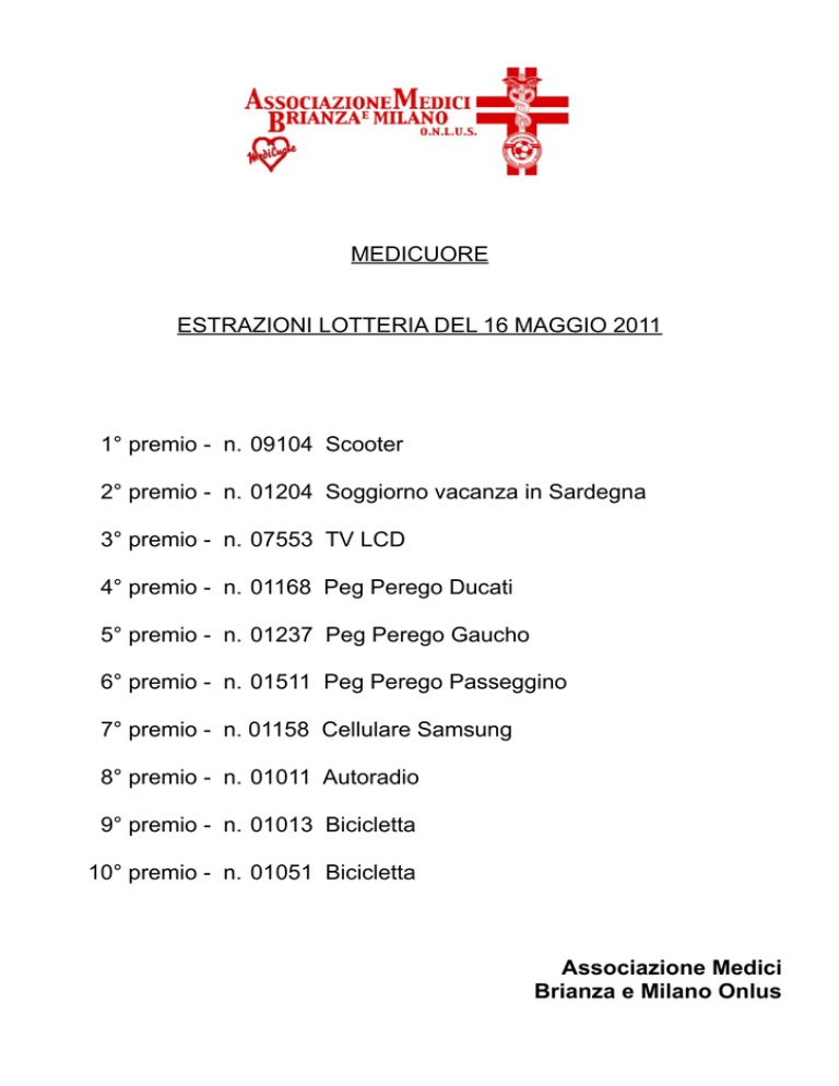 MEDICUORE ESTRAZIONI LOTTERIA DEL 16 MAGGIO 2011 1° premio - n. 09104 Scooter 2° premio - n. 01204 Soggiorno vacanza in Sardegna 3° premio - n. 07553 TV LCD 4° premio - n. 01168 Peg Perego Ducati 5° premio - n. 01237 Peg Perego Gaucho 6° premio - n. 01511 Peg Perego Passeggino 7° premio - n. 01158 Cellulare Samsung 8° premio - n. 01011 Autoradio 9° premio - n. 01013 Bicicletta 10° premio - n. 01051 Bicicletta Associazione Medici Brianza e Milano Onlus