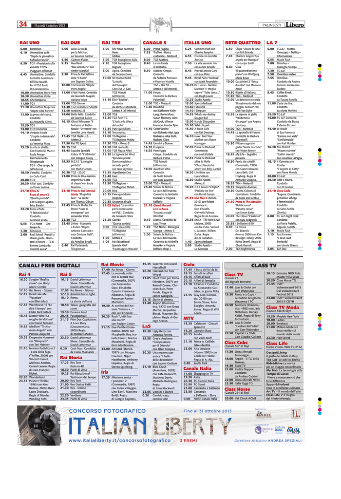 34 PALINSESTI Martedì 8 ottobre 2013 RAI UNO RAI DUE RAI TRE CANALE 5 ITALIA UNO RETE QUATTRO LA 7 6.00 Euronews 6.10 Unomattina caffè "Ospite la giornalista Raffaella Fanelli" 6.30 TG1 - Previsioni sulla viabilità CCISS Viaggiare informati 6.45 Unomattina. Condotto da Duilio Giammaria ed Elisa Isoardi. Per il TG1 Paolo Di Giannantonio 10.00 Unomattina Storie Vere 10.30 Unomattina Verde 10.55 Che tempo fa 11.00 TG1 11.30 Unomattina Magazine "Ospite Alba Parietti" 12.00 La prova del cuoco. Condotto da Antonella Clerici 13.30 TG1 14.00 TG1 Economia 14.10 Verdetto Finale "L'ospite indesiderato". Condotto da Veronica Maya 15.20 La vita in diretta. Con Franco Di Mare e Paola Perego Rai Parlamento Telegiornale TG1 - Che tempo fa (all'interno) 18.50 L'eredità. Condotto da Carlo Conti 20.00 TG1 20.30 Affari tuoi. Condotto da Flavio Insinna 21.10 Prima tv Paura di amare 2 "Quarta puntata". Con Giorgio Lupano, Erica Banchi 23.20 Porta a Porta "Il femminicidio". Condotto da Bruno Vespa 0.55 TG1 Notte - Che tempo fa 1.30 Sottovoce 2.00 Real School "Prendi la strada giusta, Orientarsi al futuro - ITS di Somma Lombardo: mobilità aerea" 6.00 6.00 6.00 Prima Pagina 7.55 Traffico - Borsa e Monete - Meteo.it 8.00 TG5 Mattina 8.40 La telefonata di Belpietro 8.50 Mattino Cinque. Condotto da Federica Panicucci e Federico Novella TG5 - Ore 10 Meteo.it (all'interno) 11.00 Forum. Condotto da Barbara Palombelli 13.00 TG5 - Meteo.it 13.40 Beautiful con Katherine Kelly Lang, Ronn Moss, Susan Flannery, John McCook, Winsor Harmon, Hunter Tylo 14.10 CentoVetrine con Roberto Alpi, Jgor Barbazza, Alex Belli, Barbara Clara 14.45 Uomini e Donne 16.10 Il segreto 16.55 Pomeriggio Cinque. Condotto da Barbara d’Urso TG5 Minuti (all'interno) 18.50 Avanti un altro. Condotto da Paolo Bonolis con Luca Laurenti 20.00 TG5 - Meteo.it 20.40 Striscia la Notizia La voce dell'irruenza. Condotto da Michelle Hunziker e Virginia Raffaele 21.10 Gianni Morandi Live in Arena "Seconda serata" (Diretta) 0.10 Matrix. Condotto da Luca Telese 1.30 TG5 Notte - Rassegna Stampa - Meteo 5 2.00 Striscia la Notizia La voce dell'irruenza. Condotto da Michelle Hunziker e Virginia Raffaele (Repl.) 6.25 6.50 6.00 TGLa7 - Meteo Oroscopo - Traffico Informazione 6.55 Movie flash 7.00 Omnibus Rassegna Stampa 7.30 TG La7 7.50 Omnibus meteo 7.55 Omnibus. Condotto da Andrea Pancani, Alessandra Sardoni 9.45 Coffee Break. Condotto da Tiziana Panella 11.00 L'aria che tira. Condotto da Myrta Merlino 13.30 TG La7 14.00 TG La7 Cronache. Condotto da Bianca Caterina Bizzarri 14.40 Le strade di San Francisco "Camera con vista" "Confidenziale" con Karl Malden 16.30 The District "Misure estreme" "Cattivi maestri" con Jonathan LaPaglia 18.15 Il Commissario Cordier "Il segreto di Cathy" con Pierre Mondy 20.00 TG La7 20.30 Otto e mezzo. Condotto da Lilli Gruber 21.10 Linea Gialla "Ragusa, Gambirasio, gemelline Schepp e femminicidio". Condotto da Salvo Sottile (Diretta) 0.00 TG La7 Night Desk. Condotto da Flavia Fratello, Edgardo Gulotta 1.10 Movie flash 1.15 Fast Forward "Il caso: Kurt Swoboda" con Ursula Strauss 2.05 La7 Doc 19.35 Supercar con David Hasselhoff 20.20 Hazzard con Tom Wopat 21.05 Quel treno per Yuma (Western, 2007) con Russell Crowe, Christian Bale, Peter Fonda. Regia di James Mangold. 23.15 Storie di cinema 23.40 Airport (Drammatico, 1970) con Dean Martin, Jacqueline Bisset, Maureen Stapleton. Regia di George Seaton. Cielo 6.40 8.35 9.20 10.00 11.00 13.00 13.30 13.50 14.00 16.15 17.45 17.50 18.15 18.45 19.35 20.30 21.00 21.10 22.45 23.30 23.45 0.40 Julia: la strada per la felicità c on Susanne Gartner Cartoon Flakes Heartland "Mai arrendersi" con Amber Marshall Prima tv Rai Settimo cielo "Il bacio" con Stephen Collins TG2 Insieme "Ospite Piero Angela" I Fatti Vostri. Condotto da Giancarlo Magalli, Adriana Volpe TG2 Giorno TG2 Costume e Società Medicina 33 Detto fatto. Condotto da Caterina Balivo Ghost Whisperer "Il fantasma di Babbo Natale" "Diversità" con Jennifer Love Hewitt TG2 Flash L.I.S. Meteo 2 Rai TG Sport TG2 Squadra Speciale Cobra 11 "L'infiltrato" con Erdogan Atalay N.C.I.S. "La moglie perfetta" con Mark Harmon TG2 - 20.30 Prima tv Una mamma imperfetta "Lotta di classe" con Lucia Mascino Prima tv Rai Criminal Minds "Magnifica luce" "La recita" con Thomas Gibson Prima tv Under the Dome "Stato di emergenza" con Alexander Koch TG2 2Next - Economia e Futuro "Ospiti: Antonio Catricalà e suor Giuliana Galli". Condotto da Annalisa Bruchi Rai Parlamento Telegiornale CANALI FREE DIGITALI Rai 4 Rai 5 16.20 Streghe "Reality show" con Holly Marie Combs 17.10 Rai News - Giorno 17.15 Dead Like Me "Vacation" con Ellen Muth 17.55 Warehouse 13 "Lo dirà il tempo" con Eddie McClintock 18.45 Doctor Who "La moglie del dottore" con David Tennant 19.35 Medium "Ti chiamerò Angelo" con Patricia Arquette 20.25 Desperate Housewives "Rimpianti" con Teri Hatcher 21.10 Nemico Pubblico n.1 - L'ora della fuga (Thriller, 2009) con Vincent Cassel, Mathieu Amalric, Gérard Lanvin. Regia di Jean-François Richet. 23.30 Wonderland 23.55 Pusher (Thriller, 1996) con Kim Bodnia, Zlatko Buric, Laura Drasbæk. Regia di Nicolas Winding Refn. 16.15 David Letterman Show. Condotto da David Letterman 17.05 Rai News - Giorno 17.10 America tra le righe 18.10 Roma. La storia dell'arte 18.50 Talam, geografia dei suoni 19.50 Dreams Road 20.45 Passepartout 21.15 Film Doc Capitalism: A Love Story (Documentario, 2009) Regia di Michael Moore. 23.30 David Letterman Show. Condotto da David Letterman 0.20 Cool Tour. Condotto da Carlo Massarini Rai Storia 17.25 Res Tore Italia in 4D 18.30 Punti di vista 19.25 Rai Educational Testimoni del tempo 20.00 Res Tore 21.00 Res Gestae Fatti 21.30 Res - Donne straordinarie 22.30 Verdiana 23.35 Punti di vista 7.00 7.30 8.00 10.00 11.10 12.00 12.25 12.45 13.10 14.00 14.20 14.50 15.05 15.10 15.55 16.40 19.00 19.30 20.00 20.15 20.35 21.05 23.20 0.00 1.00 1.05 RAI News Morning News Meteo TGR Buongiorno Italia TGR Buongiorno Regione Agorà. Condotto da Gerardo G