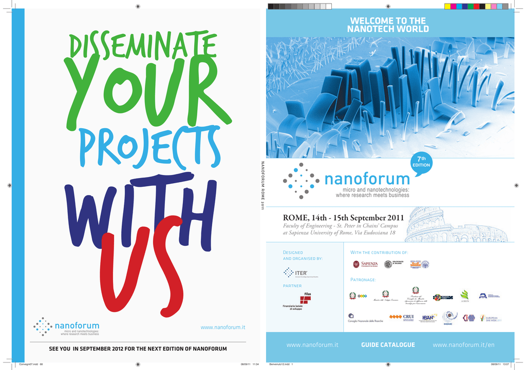 WELCOME TO THE NANOTECH WORLD disseminate your projects with us micro and nanotechnologies: where research meets business 7 th EDITION micro and nanotechnologies: where research meets business ROME, 14th - 15th September 2011 Faculty of Engineering - St. Peter in Chains’ Campus at Sapienza University of Rome, Via Eudossiana 18 Designed and organised by: Patronage: partner www.nanoforum.it www.nanoforum.it SEE YOU IN SEPTEMBER 2012 FOR THE NEXT EDITION OF NANOFORUM Convegni07.indd 68 With the contribution of: 08/09/11 11:34 Benvenuto12.indd 1 GUIDE CATALOGUE www.nanoforum.it/en nanoforum 2011 1 08/09/11 13:07 THE EVOLUTION OF INNOVATION L’EVOLUZIONE DELL’INNOVAZIONE I T E R S E M I N A R I P RO F E SS I O N A L I EXECUTIVE ASSISTANT EMAIL MARKETING EVENTO 2.0 (KRDLHM@QHNG@KNRBNONCH@TLDMS@QDKŗDƧB@BH@DKŗDƧBHDMY@CDKKDQDK@YHNMHOQNEDRRHNnali di a segretarie e assistenti di direzione, la cui funzione comporta degli elementi di relazione, d’iniziativa e di organizzazione. Un seminario operativo, grazie al quale imO@QDQBNLDRBQHUDQDLDRR@FFHDƧB@BHBGD non vengano interpretati come spam e nel pieno rispetto delle norme sulla privacy. Un seminario per imparare ad organizzare un evento con il web. Strumenti, tecniche, economie e molta esercitazione pratica, grazie ad una simulazione di gestione di un evento in ottica 2.0. Dall’importanza strategica dell’evento come strumento di relazione e comunicazione, alle diverse forme di promozione e ai nuovi strumenti a disposizione dell’event manager. FRONT OFFICE D’ECCELLENZA SOCIAL MEDIA STRATEGY Questo seminario è rivolto principalmente alle persone addette al ricevimento e al centralino, il cui lavoro quotidiano comporta responsabilità di relazione, d’iniziativa, di organizzazione e di presa di decisione. The market is changing every day and the key of success is being always one step ahead. Since 1989 we have been organising b2b events about innovative topics such as: Facebook, MySpace, Linkedin e gli altri Social Media hanno cambiato per sempre il nostro modo di comunicare. Le aziende sono oggi di fronte a un bivio: adeguarsi oppure essere scavalcate dal cambiamento, a vantaggio della concorrenza. BIOTECHNOLOGIES The market is changing every day and the key of success is being always one step NANOTECHNOLOGIES ahead. Since 1989 we DOCUMENT have been organising b2b events about innovative topics such as & INFORMATION MANAGEMENT electronic document management, front office, biotechnologies and nanotechnologies. FRONT OFFICE We also organize specialized meetings, we publish professional magazines and develop customised forwepublic bodies and private corporations. We also organize specializedservices meetings, publish professional magazines and develop customised TECNICHE DI PROBLEM SOLVING Le tecniche di problem-solving possono essere applicate quotidianamente per tutti i problemi correnti e creano sistemi e metodi di lavoro che risolvono i problemi già apparsi e riducono l’insorgere di nuovi problemi: questo seminario spiega come fare. services for public bodies and private corporations. COME REALIZZARE UN PIANO INDUSTRIALE E FINANZIARIO PER L’IMPRESA E LE BANCHE www.iter.it/en Il seminario illustra come impostare un “Business Plan” da presentare alle Banche per ottenere i crediti necessari, alle migliori condizioni e nel contempo consente all’imprenditore di evidenziare le implicazioni DBNMNLHBGDDƥM@MYH@QHDODQ@SST@QDHKOQNprio programma di sviluppo. Innovare: Tecnologie, Esperienze, Ricerche. www.iter.it/contatto www.iter.it/english/contact_us.htm ITER S.r.l. Via Rovetta, 18 -18 20127 Milan (MI) 2831161- fax - fax+39 +39 28311666 - www.iter.it - [email protected] ITER-S.r.l. - Via Rovetta, - 20127 Milan (MI)- ph. - ph.+39 +39 02 02 2831161 0202 28311666 - www.iter.it - [email protected] Benvenuto11.indd 2 08/09/11 11:33 Convegni07.indd 67 WEBMARKETING Dal SEO/SEM ai web analytics e alle strategie di promozione in rete. Un seminario indispensabile per tutti coloro che vogliono sfruttare al massimo il canale online per studiare il mercato e sviluppare nuovi rapporti commerciali (promozione/pubblicità, distribuzione, vendita, assistenza alla clientela, etc.) tramite il Web. GESTIONE DEI CONTRASTI E DEI CONFLITTI L’obiettivo del seminario è portare i parteBHO@MSH@CHRSHMFTDQDSQ@BNMSQ@RSHDBNMƦHSSH D@HTS@QKH@ƧMBG¤QHDRB@MNMDHLNLDMSHCH disaccordo a muoversi alla ricerca della miFKHNQD RNKTYHNMD D MNM CDKKŗ@ƤDQL@YHNMD @ priori del proprio punto di vista. 08/09/11 11:34 7 th EDITION nanoforum thanks NANOFORUM 2011 EXHIBITORS & SPONSOR MEDIA PARTNER nanoforum 2011 3 Benvenuto12.indd 3 08/09/11 15:44 NANOFORUM 2011 INDEX 04 U SE F U L IN FORM AT I ON 07 WELCOME by Domenico Piazza 09 HONOUR COMMITTEE 10 P R O M O T IN G COMMITTEE 12 WELCOME by University of Rome 14 WELCOME by FILAS 16 MEETING AREA, PRESS, SPECIALIZED EXPO 17 EXHIBITORS 38 CONFERENCE PLAN 40 13 T H S E P T E M B E R 43 14 T H S E P T E M B E R 50 15 T H S E P T E M B E R INFO UTILI USEFUL INFORMATION Per poter apprezzare nel modo migliore il programma di nanoforum 2011 si suggerisce di partecipare ai tutorial, alle sessioni di conferenza di proprio interesse e all’evento satellite, e di visitare l’expo. Infine, la preghiamo di riempire il modulo di valutazione: >> www.nanoforum.it In order to take all the best of nanoforum 2011 we suggest to participate to the conference sessions and the satellite events, and to visit the Expo. But not least, fill in the evaluation form: >> www.nanoforum.it ORARI DI APERTURA 13 settembre: 14.00 - 18.00 14 settembre: 08.30 - 18.00 15 settembre: 08.45 - 18.00 ISCRIZIONE Grazie al contributo di Partner, espositori e sponsor, la partecipazione a nanoforum 2011 è totalmente gratuita. È sufficiente compilare il modulo che si trova all’indirizzo www.nanoforum.it/iscrizione COME ARRIVARE Nanoforum 2011 si terrà presso la Facoltà di Ingegneria -Sede di S. Pietro in Vincoli dell’Università Sapienza di Roma, via Eudossiana 18,