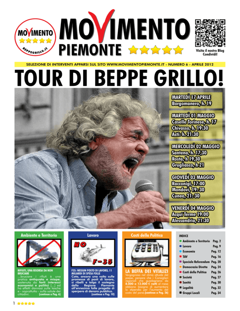 piemonte Visita il nostro Blog Condividi! Selezione di interventi apparsi sul sito www.movimentopiemonte.it - Numero 6 - aprile 2012 tour di beppe grillo! Martedì 17 aprile Borgomanero, h. 19 Martedì 01 maggio Caselle Torinese, h. 17 Chivasso, h. 19:30 Asti: h. 21:30 Mercoledì 02 maggio Santena, h. 17,30 Rosta, h 19,30 Grugliasco, h 21 Giovedì 03 maggio Racconigi, 17:00 Mondovì, 19: 30 Cuneo, 21: 30 Venerdì 04 maggio Acqui Terme 19:00 Alessandria, 21:30 Ambiente e Territorio Lavoro Costi della Politica Indice Ambiente e Territorio Pag. 2 Lavoro Pag. 9 EconomiaPag. 12 TAV Pag. 16 Speciale Referendum Pag. 20 Rifiuti, una risorsa da non bruciare ...bruciare i rifiuti è una pratica antiquata e miope, sostenuta da forti interessi economici e politici [...] ed ha effetti dannosi sulle tasche e - soprattutto - sulla salute dei cittadini. (continua a Pag. 6) 1 f35: Nessun posto di lavoro, 11 miliardi di spesa folle Cota, ancora una volta sulle promesse di posti di lavoro, si ribelli e tolga il sostegno della Regione Piemonte all’ennesimo folle progetto di sperpero di denaro pubblico. (continua a Pag. 10) La beffa dei vitalizi Vergognoso nel clima attuale del paese, pensare che i Consiglieri regionali che guadagnano da 8.000 a 12.000 € netti al mese abbiano bisogno di aumentarsi lo stipendio per l’aumento del costo del pane.(continua a Pag. 26) Democrazia Diretta Pag. 24 Costi della PoliticaPag. 26 Società Pag. 27 SanitàPag. 30 LegalitàPag. 32 Gruppi LocaliPag. 34 Chiuso per Amianto La sede principale del Teatro Regionale Alessandrino, fondazione partecipata anche dalla Regione Piemonte, è chiusa ormai da più di cinquecentotrenta giorni, come indica il contatore presente nel sito del comitato per la riapertura del teatro: www. ridatecilteatro.it Il 19 luglio del 2010 era stato siglato il contratto di appalto con l’azienda Swich 1988 di Genova che prevedeva l’eliminazione e lo smaltimento di tutto l’amianto ancora presente nell’involucro murario del locale contenente la centrale termica e nelle guarnizioni dell’impianto di aerazione, con termine il 30 settembre. Alla riapertura, dopo alcune segnalazioni da dipendenti e spettatori, il 2 ottobre la struttura viene chiusa, ufficialmente per “troppa polvere” cementizia, dovuta ai lavori di ristrutturazione. Immediatamente affidate le analisi ad un laboratorio privato, furono prodotti risultati negativi rispetto alla presenza di asbesto e solo le successive analisi condotte dall’ARPA hanno poco tempo dopo confermato la sensazione di chi stava in platea, fornendo un informazione aggiuntiva e terribile: il pulviscolo era formato da fibre di amianto, presente in valori di 16 fibre/litro, cioè 8 volte i limiti consentiti! 2 - Ambiente e Territorio Dopo le prime notizie ufficiali e i primi incontri con la popolazione, cui hanno partecipato comitati e movimenti casalesi attivi da anni nella spinosa problematica dell’amianto, sembrò chiaro che i lavori di bonifica sarebbero stati lunghi e che tutto l’iter fosse stato in qualche modo viziato da una gestione personalistica, nata da una dichiarazione di emergenza posta sui lavori iniziali, evitando l’intera gara d’appalto. Parallelamente nasce il risvolto giudiziario che è giunto nel tempo ad individuare ben nove indagati per l’esecuzione dei lavori e la modalità di affidamento, oltre che per reati di carattere prettamente ambientale. Nel marzo di quest’anno due degli indagati hanno chiesto di estinguere i loro reati pagando una sanzione, in quanto i loro incarichi di ingegnere dei lavori e responsabile della sicurezza erano comunque terminati; di alcune settimane fa invece il rinvio a giudizio per i vertici della Fondazione Teatro Regionale Alessandrino per abuso d’ufficio nella nomina proprio della Swich a ditta incaricata della bonifica iniziale. Se alla prima interrogazione, datata marzo 2011, l’Assessore Coppola ha risposto ottimista con una previsione di apertura “nell’autunno di quest’anno”, a seguito di una descrizione da parte dei soci di una “situazione molto confortante”, Fabrizio Biolé ha deciso di ribadire la situazione dimostrando che l’apertura non è avvenuta, che manca la designazione del membro del consiglio in carico alla Regione e che si ritiene, come il comitato Ridatecilteatro, inopportuno affidare la bonifica alla stessa Swich, che l’incresciosa situazione ha causato. Proprio nella stessa seduta la maggioranza regionale ha ignavamente deciso di non procedere alla nomina del rappresentante in seno al consiglio. Dunque, al di là del prossimo esito degli iter giudiziari a carico degli indagati, preme rimarcare quanto emblematico sia l’esempio di TRA, con un consigliere di amministrazione che avrebbe forzato l’affidamento di un appalto, un’azienda che ha dimostrato un negligenza assoluta mettendo a rischio la salute di decine di cittadini e la volontà di far passare tutto in maniera inosservata. Fortunatamente emblematica è stata in questo caso anche la volontà dei cittadini di riunirsi subito in comitato e fare a meno della delega nel chiedere risposte precise: esempio da copiare e mettere in rete! Scorie nucleari, rispettiamo le leggi ed il referendum! Nella notte tra il 24 ed il 25 di novembre è giunta la notizia improvvisa che sarebbero arrivate di notte 150 betoniere piene di cemento per la realizzazione delle fondamenta del Deposito Temporaneo-Definitivo di Saluggia che dovrebbe raccogliere l’85% delle scorie nucleari radioattive presenti in Italia. Restando sempre in attesa della costruzione dell’impianto di vetrificazione Cemex che dovrebbe solidificarle. Come al solito, nessuna comunicazione ufficiale è arrivata alle popolazioni interessate, giustificando l’orario notturno con le esigenze tecniche e logistiche dell’opera. Ribadiamo ancora una volta, se ce ne fosse bisogno, che il deposito di scorie nucleari sulla Dora Baltea e a 1500 metri dalla zona di ricarica delle falde dell’acquedotto del