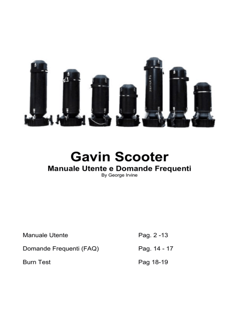 Gavin Scooter Manuale Utente e Domande Frequenti By George Irvine Manuale Utente Pag. 2 -13 Domande Frequenti (FAQ) Pag. 14 - 17 Burn Test Pag 18-19 2 INDICE MANUALE D’USO Access Port Plug Batterie Caricamento batterie Connessioni batterie Pacchi batterie Eliche o-ring del corpo Chiusure a scatto Connessioni motore o-ring di prua o-ring compartimento motore Reed Switch Relè Guidare lo scooter-Posizione del corpo Immersioni in acqua salata Assemblaggio delle guarnizioni e della frizione Connettori Corda da traino Cavo del grilletto Coppiglia grilletto Pag. 3 Pag. 3 Pag. 4 Pag. 4 Pag. 5 Pag. 6 Pag. 6 Pag. 6 Pag. 6 Pag. 6 Pag. 7 Pag. 8 Pag. 8 Pag. 9 Pag. 9 Pag. 10 Pag. 11 Pag. 11 Pag. 12 Pag 12 Il Gavin (entrambe le versioni) richiede poca manutenzione. Quando il Gavin Scooter è a posto,il motore non dovrebbe MAI diventare caldo,non dovrebbe mai avere predite dalle guarnizioni,e non dovrebbe mai avere bisogno di un qualsiasi tipo di servizio. I motori usati sono a corrente continua e sono altamente efficienti. Gavin Scooter User’s Manual and FAQ (© George Irvine 2002) Traduzione Halcyon Italia 2004 3 ACCESS PORT PLUG Assicuratevi che la “access port plug” sia ben serrata prima dell’utilizzo,altrimenti potrebbe far trafilare idrogeno. Se le connessioni venissero disturbate per una qualsiasi causa ,potrebbero svitarsi dalle loro sedi filettate e causare trafilamento. Questo non è ancora successo,quindi state attenti perché queste connessioni sono avvitate attraverso il coperchio e devono essere tenute ferme quando i bulloni vengono stretti. BATTERIE Le batterie si possono facilmente rovinare. Possono infatti funzionare correttamente e poi rovinarsi immediatamente senza nessuna ragione apparente. Non sopportano il calore. Non riponetele nell’auto o in un posto caldo. 45-50 °C è abbastanza per comprometterle. Di solito le batterie hanno una vita di circa 200 cicli,ma noi le sostituiamo dopo circa 100 oppure se il burn test risulta inferiore di 5 minuti rispetto al livello ottimale. Se le batterie che vi forniamo sono malfunzionanti ve ne spediremo altre .La scelta migliore è quella di comprarle localmente in modo da poterle sostituire. Questo vi permette di risparmiare nella spedizione e di evitare un possibile danneggiamento dello scooter Un’altra cosa da ricordare è che tutte le batterie emettono gas(anche le Ni-Cd). Non lasciate mai il vostro scooter sigillato e non accendetelo fuori dall’acqua. Se lo lasciate sigillato potrebbe esplodere, diventare estremamente pericoloso e potreste ferirvi. Gavin Scooter User’s Manual and FAQ (© George Irvine 2002) Traduzione Halcyon Italia 2004 4 CARICARE LE BATTERIE Per caricare le batterie del vostro scooter avrete bisogno di un carica batteria 24 v. La “Sears” ne vende uno con le regolazioni 12 e 25 volts, batterie con gel,carica rapida,normale o di mantenimento e con un amperometro con regolazioni a 2,10 o massimo 20 ampere;questo è da utilizzarsi in caso di buona ventilazione e costa circa 80$.Il carica batterie della interactyo non offre tutte queste regolazioni ed è prezzato a 110$. Lo Xenotronic è un carica batterie di alta qualità macosta400$, ma il carica batterie della Sears è più che adeguato. Fate attenzione che la connessione tra batteria e carica batteria sia corretta,assicuratevi che i connettori non siano allentati o ossidati Per controllare che le batterie siano cariche, se non siete sicuri del funzionamento del vostro carica batterie,predisponete il vostro tester per misurare gli Ampere e mettete tutti e due i puntali su di un unico lato del circuito e accendete il carica batterie. Se il tester non rileverà corrente e il carica batterie rileva voltaggio allora la batteria è carica. Controllate prima il voltaggio del carica batterie poi della batteria e poi gli ampere e in ultimo il voltaggio della batteria. CONNESSIONI DELLA BATTERIA Le connessioni della batteria sono in oro e non dovrebbero causare problemi. Sono costituite di due parti che mantengono l’impianto senza tirare il cavo- usate le spine a mano per disconnetterle. Dentro hanno delle viti che trattengono il cavo che è ricoperto d’argento assicurare una buona connessione.. Dall’altro capo ci sono semplicemente dei connettori resistenti all’alta temperatura,chiusi e saldati. Il connettore di ricarica è un semplice connettore per Radio . Il cavo è cavo da barca #10. Gavin Scooter User’s Manual and FAQ (© George Irvine 2002) Traduzione Halcyon Italia 2004 5 PACCHI BATTERIA I pacchi batteria necessitano di avere le paratie spaziate correttamente. La paratia superiore deve essere posizionata in modo che il coperchio senza l’o-ring possa battere con la base sul corpo. Il coperchio ha delle sedi dove si incastrano le barre del pacco batteria per fare in modo che non si muova. Potete mettere un pezzo di gommapiuma tra il coperchio e le batterie,noi lo facciamo per mantenere in pressione il coperchio quando l’oring non c’è. Per maggior informazioni sui pacchi batteria e sugli spaziatori riferitevi alla sezione FAQ – Come bilanciare lo scooter- Gavin Scooter User’s Manual and FAQ (© George Irvine 2002) Traduzione Halcyon Italia 2004 6 ELICA In qualche caso l’elica potrebbe allentarsi e lo scooter rallenterebbe un po’. Questo accade a causa dei buchi fatti per controllare il passo. Le nuove eliche sono vendute in set da 27 pezzi. Si sta un attimo per smontarle. Personalmente io non ne ho mai smontata una ma i miei “hard core diver” si. Se ci dovesse essere un qualsiasi cambio performance,rumore o velocità,spediteci immediatamente il motore e noi provvederemo ad aggiustarlo. O-RINGS DEL CORPO Gli o-rings del corpo sono del numero 375. Se qualche volta appaiono rovinati esternamente non avete di che preoccuparvi. Non dovreste mai avere bisogno di sostituirli,ma se lo fate vi costerà solo qualche € CHIUSURE A SCATTO Le chiusure a scatto talvolta sono difficili da avere,quindi trattatele con cura. Se le rompete,com