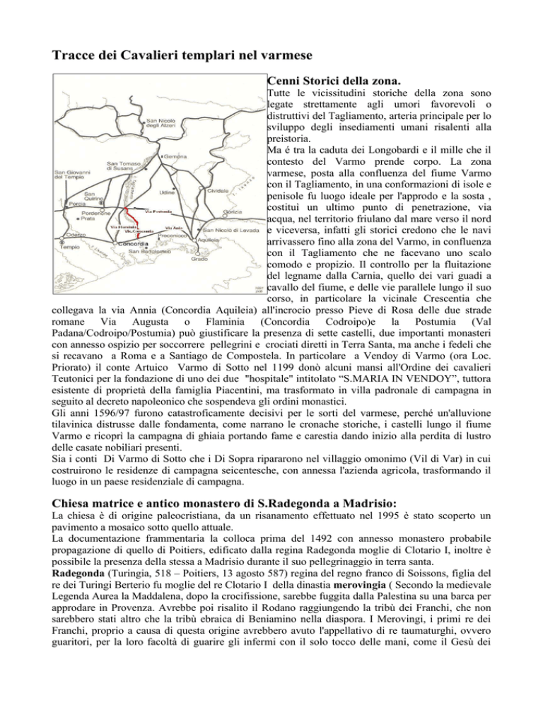 Tracce dei Cavalieri templari nel varmese Cenni Storici della zona. Tutte le vicissitudini storiche della zona sono legate strettamente agli umori favorevoli o distruttivi del Tagliamento, arteria principale per lo sviluppo degli insediamenti umani risalenti alla preistoria. Ma é tra la caduta dei Longobardi e il mille che il contesto del Varmo prende corpo. La zona varmese, posta alla confluenza del fiume Varmo con il Tagliamento, in una conformazioni di isole e penisole fu luogo ideale per l'approdo e la sosta , costituì un ultimo punto di penetrazione, via acqua, nel territorio friulano dal mare verso il nord e viceversa, infatti gli storici credono che le navi arrivassero fino alla zona del Varmo, in confluenza con il Tagliamento che ne facevano uno scalo comodo e propizio. Il controllo per la fluitazione del legname dalla Carnia, quello dei vari guadi a cavallo del fiume, e delle vie parallele lungo il suo corso, in particolare la vicinale Crescentia che collegava la via Annia (Concordia Aquileia) all'incrocio presso Pieve di Rosa delle due strade romane Via Augusta o Flaminia (Concordia Codroipo)e la Postumia (Val Padana/Codroipo/Postumia) può giustificare la presenza di sette castelli, due importanti monasteri con annesso ospizio per soccorrere pellegrini e crociati diretti in Terra Santa, ma anche i fedeli che si recavano a Roma e a Santiago de Compostela. In particolare a Vendoy di Varmo (ora Loc. Priorato) il conte Artuico Varmo di Sotto nel 1199 donò alcuni mansi all'Ordine dei cavalieri Teutonici per la fondazione di uno dei due "hospitale" intitolato “S.MARIA IN VENDOY”, tuttora esistente di proprietà della famiglia Piacentini, ma trasformato in villa padronale di campagna in seguito al decreto napoleonico che sospendeva gli ordini monastici. Gli anni 1596/97 furono catastroficamente decisivi per le sorti del varmese, perché un'alluvione tilavinica distrusse dalle fondamenta, come narrano le cronache storiche, i castelli lungo il fiume Varmo e ricoprì la campagna di ghiaia portando fame e carestia dando inizio alla perdita di lustro delle casate nobiliari presenti. Sia i conti Di Varmo di Sotto che i Di Sopra ripararono nel villaggio omonimo (Vil di Var) in cui costruirono le residenze di campagna seicentesche, con annessa l'azienda agricola, trasformando il luogo in un paese residenziale di campagna. Chiesa matrice e antico monastero di S.Radegonda a Madrisio: La chiesa è di origine paleocristiana, da un risanamento effettuato nel 1995 è stato scoperto un pavimento a mosaico sotto quello attuale. La documentazione frammentaria la colloca prima del 1492 con annesso monastero probabile propagazione di quello di Poitiers, edificato dalla regina Radegonda moglie di Clotario I, inoltre è possibile la presenza della stessa a Madrisio durante il suo pellegrinaggio in terra santa. Radegonda (Turingia, 518 – Poitiers, 13 agosto 587) regina del regno franco di Soissons, figlia del re dei Turingi Berterio fu moglie del re Clotario I della dinastia merovingia ( Secondo la medievale Legenda Aurea la Maddalena, dopo la crocifissione, sarebbe fuggita dalla Palestina su una barca per approdare in Provenza. Avrebbe poi risalito il Rodano raggiungendo la tribù dei Franchi, che non sarebbero stati altro che la tribù ebraica di Beniamino nella diaspora. I Merovingi, i primi re dei Franchi, proprio a causa di questa origine avrebbero avuto l'appellativo di re taumaturghi, ovvero guaritori, per la loro facoltà di guarire gli infermi con il solo tocco delle mani, come il Gesù dei Vangeli. Il santo Graal non sarebbe altro che il sang real ovvero il sangue regale di questa stirpe dalle origini nobilissime). Quando i re franchi Teodorico I e Clotario I conquistarono la Turingia (531), Radegonda fu presa in ostaggio da Clotario e condotta in Neustria con gli altri prigionieri. Crebbe alla corte di Soissons e quando Clotario, vista la sua bellezza, decise di farne sua moglie, fu mandata ad Athies per ricevere un'educazione adatta ad una regina. Radegonda dovette piegarsi alla volontà del re e, riluttante, sposò Clotario I attorno al 540. Il matrimonio, per l'indole brutale e i continui tradimenti del marito, fu estremamente infelice. Fallì definitivamente quando Clotario fece uccidere l’amato fratello di sua moglie, Clotacario, l'unico parente rimastole. Radegonda decise di abbandonare il marito (al quale non aveva dato eredi) e di prendere i voti.Le cronache narrano che Clotario, appena ebbe accettata la vocazione della regina, se ne sia pentito ed abbia inviato alcuni soldati a Saix per riportarla a corte. Allorché i soldati si avvicinarono a Saix, Radegonda fuggì verso sud attraverso un campo ove alcuni contadini stavano seminando l'avena. Miracolosamente questa crebbe fino a nascondere la fuggitiva ed i contadini poterono affermare ai soldati che si rivolsero a loro, di non aver visto alcuno nel campo da quando questo era stato seminato. Da allora in poi Clotario non la perseguì più e le lasciò proseguire il suo percorso di fede. Ricevette il velo di diaconessa da san Medardo e fece il suo ingresso nel monastero di Tours (quello dov'era entrata anche sua suocera Clotilde); si trasferì poi in quello di Saix, dove si dedicò all'assistenza dei lebbrosi; alla fine, Clotario I fece costruire per lei il monastero di Notre-Dame a Poitiers, che divenne poi della Sainte-Croix quando, nel 569, Radegonda ottenne in dono dall'imperatore Giustino II un frammento della vera croce. Diede a questa nuova abbazia la regola di Cesario di Arles, ma rifiutò di diventarne badessa, affidando la carica ad Agnese di Poitiers. Il monastero divenne presto famoso sia per la presenza di Radegonda che per quella di Venanzio Fortunato, che di Radegonda diresse i progressi spirituali e scrisse la biografia. La santa fu sempre circondata dalla venerazione dei fedeli, e ai suoi funerali intervenne Gregorio di Tours che le dedicò una pagina della sua Historia Francorum. La chiesa venne gravemente d