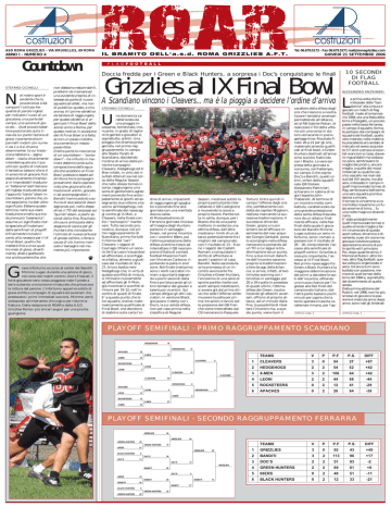 ASD ROMA GRIZZLIES - VIA BRUXELLES, 69 ROMA Tel. 06.679.5173 - Fax 06.679.5271 [email protected] ANNO I - NUMERO 4 GIOVEDÌ 21 SETTEMBRE 2006 Countdown STEFANO CICINELLI N el nostro sport è evidente che la provenienza USA comporti l’utilizzo frequente di parole inglesi: per indicare il ruolo di un giocatore, una parte del campo, una azione di gioco etc… Quel piccolo tabellone posizionato sulla linea da cui parte l’azione di gioco, riportante alcuni pannelli mobili con numeri da 1 a 4 si chiama downmarker, la cui traduzione letteraria – segna down – lascia chiaramente intendere quale sia il suo utilizzo: quello di indicare il tentativo (down) che si è in procinto di giocare. Può essere divertente cimentarsi in improbabili traduzioni “letterarie” dall’italiano all’inglese, traducendo per l’appunto “conta” down in countdown, parola che, come sappiamo, ha ben altro significato. Ebbene questo termine, nella sua reale traduzione e nella sua traduzione più “casereccia”, assume un significato molto speciale all’indomani delle semifinali di playoff: è finalmente iniziato il conto alla rovescia per il IX Final Bowl, quello che metterà fine a circa quattro mesi di gioco, divertimento, sfide e spettacolo ma anche polemiche, che G non debbono restare sterili, problemi da risolvere ed una evidente crescita di interesse da parte di nuove squadre ed atleti, ma non di pubblico: questo, a mio avviso, è il primo obiettivo da tentare di raggiungere, per questo obiettivo si organizzò il Final Bowl dello scorso anno a Roma, per questo motivo in occasione del IX Final Bowl si è fatto, se non un passo indietro, sicuramente un mezzo passo falso. D’altra parte la mancanza di un countdown – “contadown” - ha influito in maniera determinante sulla composizione delle squadre che accedono al Final Bowl: potevano essere addirittura tre le compagini provenienti dalla capitale visto che, grazie alla distrazione di arbitri, giocatori ed accompagnatori, i Banditi hanno potuto usufruire di due secondi down segnando poi, nello stesso drive, il TD del sorpasso sul “quinto” down, a pochi secondi dalla fine. Risultato: chiusura anticipata della stagione di caccia per gli Hunters che, nonostante l’utilizzo di nuove cartucce di grosso calibro, o forse a causa di ciò, hanno mancato il bersaglio nel momento più importante. rave infortunio occorso al center dei Banditi Mimmo Lugas: durante una azione di gioco, nel corso del match contro i Doc’s Frascati, il forte giocatore nero-rosso poggiava male il piede a terra subendo una torsione innaturale che provocava la rottura del perone. L’infortunio appariva subito di grave entità a compagni di squadra ed avversari che prestavano i primi immediati soccorsi. Mimmo verrà sottoposto ad intervento chirurgico per ridurre la frattura. Dalla redazione di ROAR e dalla A.S.D. Grizzlies Roma i più sinceri auguri per una pronta guarigione. F L A G F O O T B A L L Doccia fredda per i Green e Black Hunters, a sorpresa i Doc’s conquistano le finali Grizzlies al IX Final Bowl A Scandiano vincono i Cleavers... ma è la pioggia a decidere l’ordine d’arrivo STEFANO CICINELLI U na domenica caratterizzata da una pioggia incessante, torrenziale, insinuante, in grado di tagliare le gambe a giocatori e, soprattutto, arbitri. Una pioggia che diventa protagonista, nel primo raggruppamento in campo allo Stadio Torelli di Scandiano, decidendo l’ordine di arrivo delle prime tre compagini: Cleavers, Hedgehogs ed XMen infatti, in virtù dei risultati ottenuti sia nel corso della Regular Season che nello stesso torneo in corso, raggiungono una sorta di gentlemen’s agreement ponendo fine anticipatamente ai giochi ed assegnando due vittorie a tavolino ad Hedgehogs, nella semifinale dei ripescaggi contro gli X-Men, e Cleavers, nella finale contro i “porcospini” mantovani. Tutto secondo pronostico, dunque, nel primo raggruppamento di Scandiano, primo fra tutti il ritorno dei “veri” Cleavers: i ragazzi di Cavriago rifilano un sonoro 54-0 ai Leoni trovandosi ad affrontare, e sconfiggere a fatica, almeno a giudicare dal risultato di 32 a 27, le loro bestie nere Hedgehogs che, in virtù di questa sconfitta di misura, si ritrovano nuovamente ad affrontare gli X-Men, già incontrati e sconfitti di misura per 19-12, nell’incontro di quarti di finale. E’ a questo punto che le tre squadre, oramai matematicamente qualificate al Final Bowl, che decidono di stabilire sulla carta l’or- dine di arrivo, impazienti di raggiungere gli spogliatoi e ponendo fine alla giornata con una meritata doccia calda. Al Motovelodromo di Ferrara la giornata iniziava all’insegna degli Hunters: partono in vantaggio i Green, nel primo incontro con i vicentini 69ers, poi l’ottima prestazione della difesa vicentina riesce ad intercettare il QB neocampione d’Italia di contact football Massimo Fierli con Vincenzo Carbone, riportando la palla in end zone. Nel finale tiratissimo sono i verdi cacciatori romani a spuntarla segnando a pochi secondi dalla fine e poi bloccando gli ultimi tentativi dei giovani e talentuosi vicentini. Sul campo attiguo gli altri cacciatori, in versione Black, giocavano il derby con i Doc’s, la cui solida difesa, non per caso prima nella classifica di Regular Season, mostrava subito la propria pericolosità intercettando il QB Castiglione e muovendo lo score a proprio favore. Partita tutta in salita, dunque, per i Blacks che da una parte mettono in evidenza una ottima difesa, dall’altra mostrano i limiti di un attacco potenzialmente fra i migliori del campionato: con il risultato di 13 – 6 sono i ragazzi dei Castelli Romani a conquistare il diritto di affrontare ai quarti i padroni di casa Banditi. Nella seconda fase la promessa di un incontro avvincente fra Grizzlies e Green Hunters, l’ennesimo di una serie di epiche partite risolte con scarti sempre ridottissimi, si avvera già dal primo drive che vede l’offense verde muovere la pall