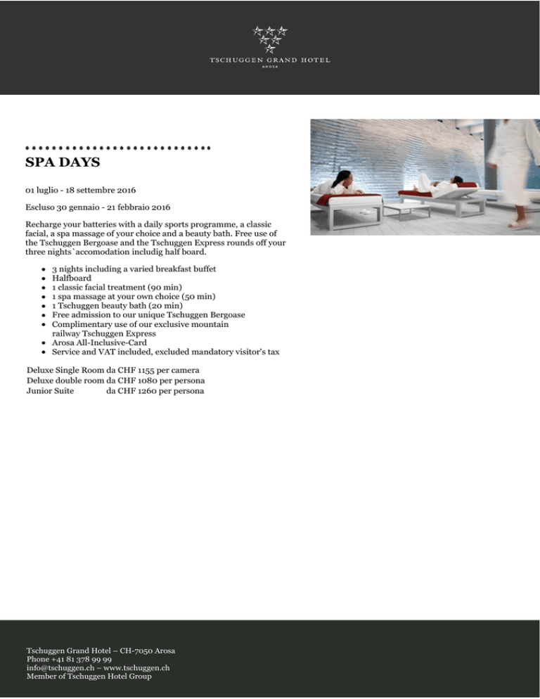 SPA DAYS 01 luglio - 18 settembre 2016 Escluso 30 gennaio - 21 febbraio 2016 Recharge your batteries with a daily sports programme, a classic facial, a spa massage of your choice and a beauty bath. Free use of the Tschuggen Bergoase and the Tschuggen Express rounds off your three nights`accomodation includig half board. 3 nights including a varied breakfast buffet Halfboard 1 classic facial treatment (90 min) 1 spa massage at your own choice (50 min) 1 Tschuggen beauty bath (20 min) Free admission to our unique Tschuggen Bergoase Complimentary use of our exclusive mountain railway Tschuggen Express Arosa All-Inclusive-Card Service and VAT included, excluded mandatory visitor's tax Deluxe Single Room da CHF 1155 per camera Deluxe double room da CHF 1080 per persona Junior Suite da CHF 1260 per persona Tschuggen Grand Hotel – CH-7050 Arosa Phone +41 81 378 99 99 [email protected] – www.tschuggen.ch Member of Tschuggen Hotel Group