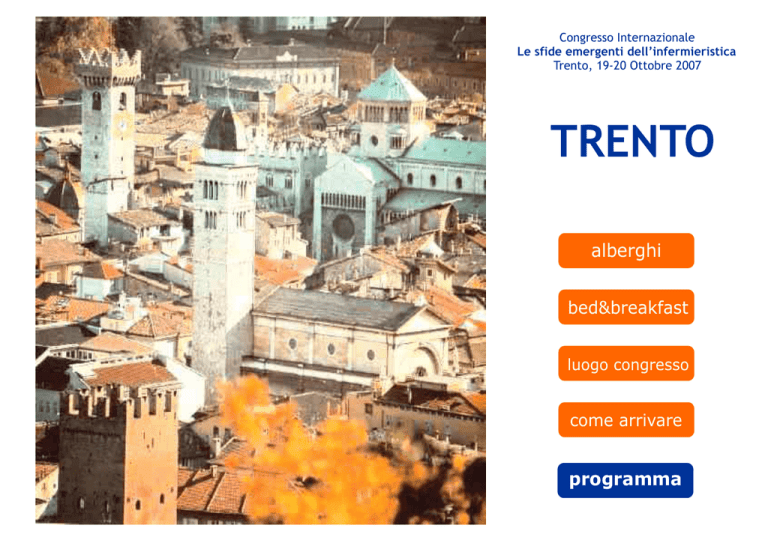 Congresso Internazionale Le sfide emergenti dell’infermieristica Trento, 19-20 Ottobre 2007 TRENTO alberghi bed&breakfast luogo congresso come arrivare programma home alberghi luogo del congresso b&b come arrivare verifica il percorso pedonale ALBERGHI 2 Boscolo Grand Hotel Trento **** Website: http://www.boscolohotels.com 3 Hotel Accademia **** Website: http://www.accademiahotel.it 4 Hotel America *** Website: http://www.hotelamerica 5 Hotel Buonconsiglio **** 950mt 825mt 950mt 1200mt Website: http://www.hotelbuonconsiglio.it 6 Hotel Monaco *** 1200mt Website: http://www.albermonaco.it 8 Hotel Venezia ** Website: http://www.hotelveneziatn.it 13 Hotel Sporting Trento *** Website: http://www.hotelsportingtrento.com/ 13 650mt 2500mt UTILITA’ Centro Culturale S.Chiara Palazzo Geremia 10 Stazione Ferroviaria 11 Stazione Autocorriere 12 Parcheggio P.zza Fiera P1 Parcheggio Silos V.Petrarca P2 Parcheggio V. Segantini P3 alberghi che offrono tariffe agevolate per i partecipanti al congresso - Boscolo Grand Hotel Trento (a notte) Singola € 90,00 - Doppia € 100 1 - Hotel Accademia (a notte) Singola € 74,00 - Doppia uso singola € 92,00 - Matrimoniale € 124,00 - Hotel America (a notte) Singola € 65,00 - Doppia € 99,00 - Hotel Buonconsiglio (a notte) Singola € 73,00 - Doppia uso singola € 83,00 - Doppia € 96,00 - Hotel Monaco (a notte) Singola € 62,00 - Doppia € 94,00 - Hotel Sporting Trento (a notte) Singola € 62,00 - Doppia uso singola € 76,00 - Matrimoniale € 96,00 ulteriore sconto per prenotazioni prima del 20 settembre per almeno 2 notti - Hotel Venezia (a notte) Singola € 38,00 - Doppia uso singola € 48,00 - Doppia € 55,00 home alberghi b&b luogo del congresso come arrivare b&b BED & BREAKFAST BUONCONSIGLIO Località: Salita della Spalliera, 4 - 38100 Trento - Tel. 0461.232260 - 328 7315514 cerca su tuttocittà CASA POMPERMAIER Località: Via Lavisotto, 69 - 38100 Trento - Tel. 0461 822190 - 346 6695886 ALLE COSTE Via alle Coste, 24 - Fraz. Cognola - 38050 Trento - Tel: +39(0461)983783 - +39(340)8494348 BARBASOL - FAM. GERONAZZO MICHAELA Via Roberti, 87 - Villazzano - Fraz. San Rocco – Trento - Tel: +39(0461)912041 - Tel: +39(339)8630470 CA' BERLANDA - BERLANDA ROBERTO Via Pozati, 5 - Fraz. Cognola- 38050 Trento - Tel: +39(0461)236651 - Tel: +39(335)7193889 CASA DELL'ALBICOCCO - FALLA ANGELA Fraz. Romagnano - Via Alle Porte, 71 - 38060 Trento - Tel: +39(0461)348041 VILLA BERTAGNOLLI Strada delle Novaline, 42 - Fraz. Mattarello - 38060 Trento - Tel: +39(0461)942020 - Tel: +39(0461)942212 ESTER Via Salè, 8 Fraz. Povo – 38050 Trento - Tel: +39(0461)810380 OSTELLO Ostello Giovane Europa VIA TORRE VANGA, 9 Trento Tel: +39(0461)263484 - Fax: +39(0461)222517 home alberghi b&b luogo del congresso come arrivare LUOGO DEL CONGRESSO 1 CENTRO CULTURALE S.CHIARA Via Santa Croce, 67 - Trento Il complesso del Centro Servizi Culturali Santa Chiara è situato nei pressi del Centro Storico di Trento. Il teatro Auditorium, che ospiterà il congresso Venerdì 19, per capienza è il più grande teatro della città di Trento, ristrutturato nell’estate d el 2006 in una veste elegante e moderna. La sua più grande peculiarità è che da tutti i posti si gode una buona visibilità. Durante la giornata di Sabato 20 verranno utilizzate per i workshop paralleli anche la Sala 2 e la Sala 3, poste al primo piano del complesso che ospita il Centro Servizi. E’ facilmente raggiungibile dagli alberghi della città, nonché dalla Stazione Ferroviaria e dall’Autostrada. 4 home alberghi b&b luogo del congresso come arrivare Meteo: http://www.meteotrentino.it/aspweb/index.asp Aeroporto-VR: COME ARRIVARE Trenitalia: http://www.aeroportoverona.it http://www.ferroviedellostato.it/ meteo AUTOMOBILE autostrada del Brennero (A22 uscita Trento centro); per chi proviene da Verona o Bolzano, strada statale 12 dell'Abetone; per chi proviene da Bassano-Padova-Venezia, strada statale 47 (superstrada della Valsugana); per chi proviene da Brescia e Lago di Garda, strada statale 45 bis della Gardesana Occidentale. TRENO linea ferroviaria del Brennero - Stazione di Trento linea ferroviaria della Valsugana – Stazione di Trento AEREO Trento dista 90 km dallo scalo Catullo di Verona, 195 km dal Mar co Polo di Venezia, 245 km da Milano Linate e 60 km circa dal nuovo aeroporto di Bolzano.