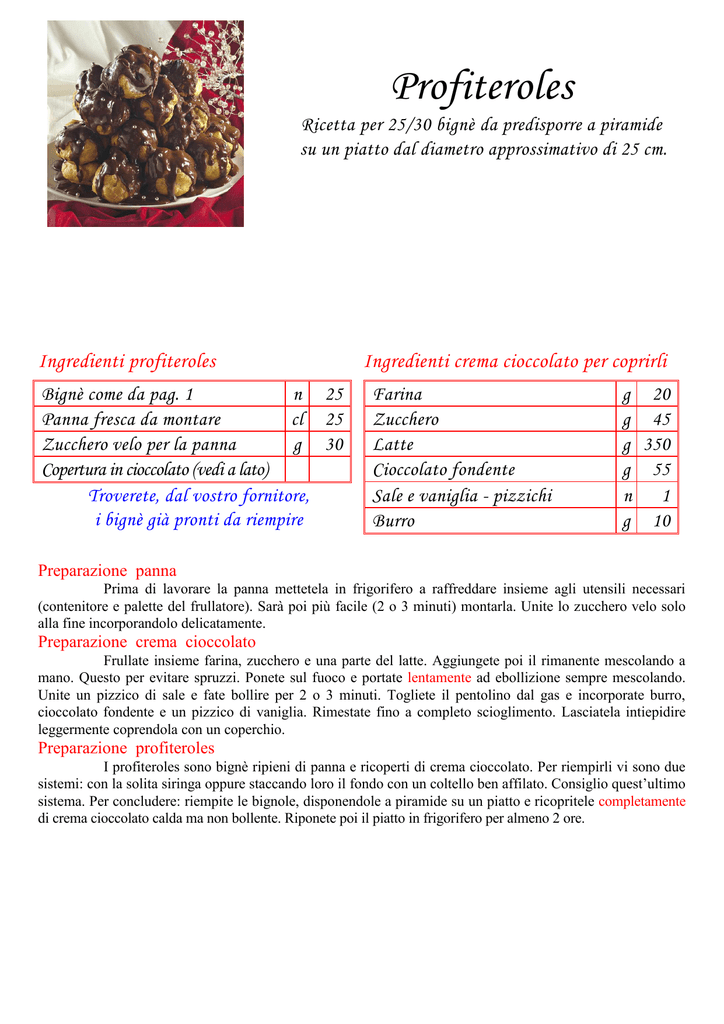 Profiteroles Ricetta per 25/30 bignè da predisporre a piramide su un piatto dal diametro approssimativo di 25 cm. Ingredienti profiteroles Bignè come da pag. 1 n 25 Panna fresca da montare cl 25 Zucchero velo per la panna g 30 Copertura in cioccolato (vedi a lato) Troverete, dal vostro fornitore, i bignè già pronti da riempire Ingredienti crema cioccolato per coprirli Farina Zucchero Latte Cioccolato fondente Sale e vaniglia - pizzichi Burro g 20 g 45 g 350 g 55 n 1 g 10 Preparazione panna Prima di lavorare la panna mettetela in frigorifero a raffreddare insieme agli utensili necessari (contenitore e palette del frullatore). Sarà poi più facile (2 o 3 minuti) montarla. Unite lo zucchero velo solo alla fine incorporandolo delicatamente. Preparazione crema cioccolato Frullate insieme farina, zucchero e una parte del latte. Aggiungete poi il rimanente mescolando a mano. Questo per evitare spruzzi. Ponete sul fuoco e portate lentamente ad ebollizione sempre mescolando. Unite un pizzico di sale e fate bollire per 2 o 3 minuti. Togliete il pentolino dal gas e incorporate burro, cioccolato fondente e un pizzico di vaniglia. Rimestate fino a completo scioglimento. Lasciatela intiepidire leggermente coprendola con un coperchio. Preparazione profiteroles I profiteroles sono bignè ripieni di panna e ricoperti di crema cioccolato. Per riempirli vi sono due sistemi: con la solita siringa oppure staccando loro il fondo con un coltello ben affilato. Consiglio quest’ultimo sistema. Per concludere: riempite le bignole, disponendole a piramide su un piatto e ricopritele completamente di crema cioccolato calda ma non bollente. Riponete poi il piatto in frigorifero per almeno 2 ore.