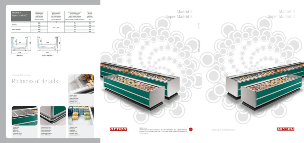Temperatura di esercizio Working temperature Betriebstemperatur Temp. de fonctionnement Temperatura de trabajo Superficie di esposizione orizzontale Horizontal display surface Gesamte Ausstellefläche Surface d ’exposition horizontale Superficie de exposición de apoyo Горизонтальная площадь экспозиции Capacità utile Net volume Nutzleistung Capacité utile Capacidad útil Длина без боковин Рабочая температура mm 2500 °C m2 2,3 dm3 932 3,4 1397 -18°C / -25°C 2,3 915 2500 3,0 1220 3750 4,5 1830 1875 405 920 950 405 Super Madrid 3 1205 1139 1422 MADRID 3 SUPER MADRID 3 950 3750 Вес Madrid 3 Super Madrid 3 Madrid 3 Super Madrid 3 STUDIOVERDE Madrid 3 Lunghezza senza spalle Length without ends Länge ohne Seiten Longeur sans joues Longitud sin laterales 05050221 - Ed. 02- 01/11/2009 Madrid 3 Super Madrid 3 Styling & Refrigeration Richness of details Divisori vasca. Basin dividers. Boden-Trenngitter. Séparation cuve. Divisorios cuba. Разделитель ванны. Tenda notte. Nightblind. Nachtrollo. Rideau de nuit. Cortina de noche. Ночные шторки. Paracolpi inferiore. Lower bumper rail. Pare-chocs inferieur. Untere Stoßleiste. Parachoques inferior. Нижний бампер. Griglie di fondo. Base grids. Bodengitter. Grilles de fond. Rejilla de fondo. Базовые решетки. ARNEG S.p.A. 35010 Campo San Martino (PD) Italy - Tel. +39 049 9699333 - Fax +39 049 9699444 Certified UNI EN ISO 9001:2008 - UNI EN ISO 14001:2004 - RAEE IT8010000000139 www.arneg.com W O R L D W O R L D Styling & Refrigeration Madrid 3 Super Madrid 3 Styling & Refrigeration Large capacity Madrid 3 Super Madrid 3 Le isole refrigerate Madrid 3 e Super Madrid 3 si collocano nella fascia di prodotti impiegabili nelle varie tipologie di punti vendita, con una naturale propensione al genere “Discount”. Le nuove soluzioni tecniche, l’utilizzo di nuovi materiali e il miglioramento del design hanno contribuito alla realizzazione di un prodotto altamente professionale e come sempre, affidabile. Madrid 3 and Super Madrid 3 refrigerated islands belong to a range of products that can be used in a variety of sales outlets, with a natural propensity for the “Discount” type. The new technical solutions, the use of new materials and the improved design contribute to the development of a highly professional product that is, as always, absolutely reliable. Die Tiefkühlinseln Madrid 3 und Super Madrid 3 können, in verschiedenen Verkaufspunkten eingesetzt werden und fügen sich außerdem optimal auch in das Bild eines “Discounters”ein. Die neuen technischen Lösungen, der Einsatz neuer Materialien und die Verbesserung des Designs, haben zur Fertigung eines extrem professionellen, sowie eines immer zuverlässigen Produktes beigetragen. Les îlots réfrigérés Madrid 3 et Super Madrid 3 se placent dans la tranche des produits utilisés dans les différentes typologies de points de vente, avec un penchant naturel au genre « Discount ». Les nouvelles solutions techniques, l’utilisation de nouveaux matériaux et l’amélioration du design ont contribué à la réalisation d’un produit hautement professionnel et comme toujours fiable. Las islas refrigeradas Madrid 3 y Super Madrid 3 se encuentran en la franja de productos utilizados en las diferentes tipologías de puntos de venta, con una tendencia natural hacia el “Discount”. Las soluciones técnicas nuevas, la utilización de materiales nuevos y el mejoramiento del design contribuyeron a la realización de un producto muy profesional y, como siempre, fiable. Морозильные ванны Madrid 3 и Super Madrid 3 предназначены для эксплуатации в магазинах различных форматов, и в особенности для магазинов типа “Discount”. Новые технические решения, конструктивные материалы, совершенный дизайн – вот отличительные характеристики высококачественной и, как всегда, надежной продукции концерна. La linea Madrid 3 e Super Madrid 3 propone un’ampia gamma di soluzioni che aumentano le possibilità di arredamento nelle aree vendita dei supermercati. The Madrid 3 and Super Madrid 3 line offers a wide range of solutions that simplify the layout of different sections of the supermarket. Die Linie Madrid 3 und Super Madrid 3 schlägt zahlreiche Lösungen vor, welche die Einrichtungsmöglichkeiten der Verkaufsbereiche in Supermärkten erhöhen. La ligne Madrid 3 et Super Madrid 3 propose une large gamme de solutions qui augmentent les possibilités d’aménagement dans les aires de vente des supermarchés. La línea Madrid 3 y Super Madrid 3 propone una gama de soluciones amplia que aumenta las posibilidades de amueblado en las áreas de venta de los supermercados. Широкий выбор типоразмеров модели Madrid 3 и Super Madrid 3 значительно упрощает оснащение торговых залов супермаркетов.