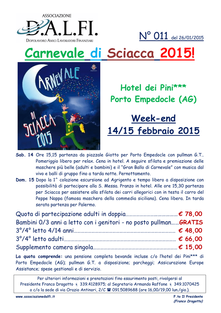 N° 011 del 26/01/2015 Carnevale di Sciacca 2015! Hotel dei Pini*** Porto Empedocle (AG) Week-end 14/15 febbraio 2015 Sab. 14 Ore 15,15 partenza da piazzale Giotto per Porto Empedocle con pullman G.T.. Pomeriggio libero per relax. Cena in hotel. A seguire sfilata e premiazione delle maschere più belle (adulti e bambini) e il “Gran Ballo di Carnevale” con musica dal vivo e balli di gruppo fino a tarda notte. Pernottamento. Dom. 15 Dopo la 1^ colazione escursione ad Agrigento e tempo libero a disposizione con possibilità di partecipare alla S. Messa. Pranzo in hotel. Alle ore 15,30 partenza per Sciacca per assistere alla sfilata dei carri allegorici con in testa il carro del Peppe Nappa (famosa maschera della commedia siciliana). Cena libera. In tarda serata partenza per Palermo. Quota di partecipazione adulti in doppia…………………………………… € 78,00 Bambini 0/3 anni a letto con i genitori - no posto pullman……GRATIS 3°/4° letto 4/14 anni…………………………………………………………………………… € 48,00 3°/4° letto adulti…………………………………………………………………………………… € 66,00 Supplemento camera singola……………………………………………………………… € 15,00 La quota comprende: una pensione completa bevande incluse c/o l’hotel dei Pini*** di Porto Empedocle (AG); pullman G.T. a disposizione; parcheggi; Assicurazione Europe Assistance; spese gestionali e di servizio. Per ulteriori informazioni e prenotazioni fino esaurimento posti, rivolgersi al Presidente Franco Dragotto 339.4128975; al Segretario Armando Raffone 349.1070425 o c/o la sede di via Orazio Antinori, 2/C 091.5089688 (ore 16,00/19,00 lun./gio.). www.associazionedalfi.it F.to Il Presidente (Franco Dragotto)