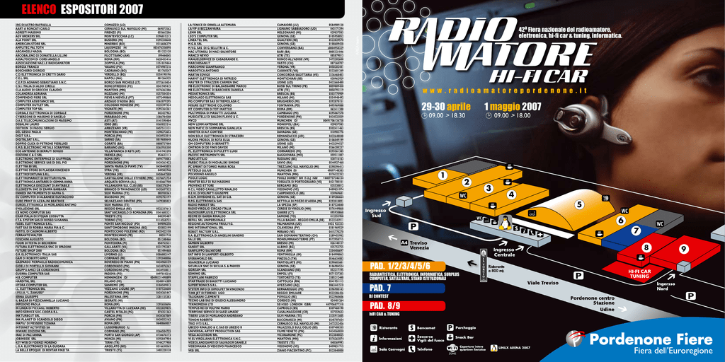 ELENCO ESPOSITORI 2007 3RG DI ASTRO RAFFAELLA AART di RONCATI CARLO AGRESTI MASSIMO AGV BROKERS SRL ALA POINT SRL AMERICAN-STORE SRL AMPLITEC PAL TOTH ARCANGELI NADIA ARCOBALENO DI DONATELLA LILLINI ASSALTOCOM DI CORSI ANGELO ASSOCIAZIONE NAZ.LE RADIOAMATORI BORGIA FRANCO BOSCHIERO GIORGIO C.D. ELETTRONICA DI CRETTI DARIO C.E.L. SRL C.E.P. DI AGNANO SEBASTIANO S.N.C. C.S.I. ITALIA DI ALDO CIRELLI CLA AUDIO DI GRECCHI CLAUDIO COLANDREA ADRIANA COMPENDIO FIERE SRL COMPUTER ASSISTANCE SRL COMPUTER OUTLET SRL COMPUTER TOP SRL CORSALE ELETTRONICA DI CORSALE CYBERZONE DI MASSIMO D’ANGELO D.A.E. TELECOMUNICAZIONI DI MASSIMO DEBALINI LAURO DEITRON DI FASOLI SERGIO DEL GESSO PAOLO DIGIT S.R.L. DIGITALSAT S.R.L. DOPPIO CLICK DI PETRONE PIERLUIGI E.M.S. ELECTRONIC METALS SCRAPPING ECO ANTENNE DI BERRUTI SERGIO EDIZIONI C & C SRL ELECTRONIC ENTERPRICE DI GIUFFRIDA ELECTRONIC SERVICE SAS DI DEL PIO ELETTRA 80 SRL ELETTRO STORE DI PLACIDA VINCENZO ELETTROFORTUNA S.R.L. ELETTROMARKET DI BOTTURI VILMA ELETTRONICA ANTARES DI GEMMA ANNA ELETTRONICA DISCOUNT DI AVITABILE ELLEBIZETA SNC DI ZAMPA BARBARA ENNEDI INSTRUMENTS DI NAFRA G. EU COMPUTER DI ALBANESE EUSTACCHIO EURO PRINT DI AZZALINI BEATRICE EUROELETTRONICA DI MORLANDO ANTIMO EVOLUZIONE SRL EX NOVO COMPUTER SAS EXAR ITALIA DI STOJAN COSSUTTA F.T.A. SYSTEM SAS DI ROSSO SUSANNA FADEL ELETTRONICA S.R.L. FAST SAS DI ROBBIA MARIA PIA & C. FASTEL DI CAGNONI ALBERTO FERRANTE WALTER FOSCHINI AUGUSTO FUORI DI TESTA DI BECHERINI FUTURA ELETTRONICA SNC DI SPADONI FUTURE SHOP 2000 G.R. ELECTRONICS ITALIA SAS GAM DI ROBERTO AMICI GASPARDO PIERPAOLO RADIOCOMUNICA GIOELI DI PORTELLO GIOVANNI GRUPPO AMICI CB CORDENONS GUERRA COMPUTER SAS H.B. COMPUTER HARDITAL SRL HYDRA COMPUTER SRL I.L. ELETTRONICA SRL I.P.S.I.A. “L. ZANUSSI” IERNA GIUSEPPE IL BAZAR DI PIZZICANNELLA LUCIANO IMPEDOVO PAOLA IN LINEA DI PICCAGLI ROBERTO INFO SERVICE SOC.COOP. A R.L. INK TURBO.IT SRL INK-PLANET DI SCANDOLO DIEGO INKPIU’ DI MESSERO TIZIANA INTERNET ACTIVITIES SA INWARE EDIZIONI SRL IRAE DI PACI ANNA JOBINSIDE SRL KEY WEB DI FIDENZI MORENO L.G.A. ELECTRONICS DI LA GUIDARA LA BELLE EPOQUE DI ROVTAR FINZI TA COMAZZO (LO) CERNUSCO SUL NAVIGLIO (MI) 069073562 FIRENZE (FI) 055663286 MONTEVECCHIA (LC) 0396815213 BUSSERO (MI) 0295330648 MINERBIO (BO) 0516606279 LAJOSMIZSE /H/ 003676356890 BOLOGNA (BO) 051322120 FILOTTRANO (AN) 199444045 ROMA (RM) 0620433416 ZOPPOLA (PN) 3351819444 VAIANO (PO) 0574987216 CADRIANO (BO) 051765547 VERDELLO (BG) 0354190196 NAPOLI (NA) 081266325 BORGO SAN MICHELE (LT) 0773610454 RONCOFREDDO (FC) 0541949415 MANTOVA (MN) 0376262386 ROZZANO (MI) 0257504354 PIEVE A NIEVOLE (PT) 0572490868 ARZAGO D’ADDA (BG) 0363879295 COLOGNO MONZESE (MI) 0225397324 VIGNATE (MI) 0295364361 PORDENONE (PN) 043427962 PARABIAGO (MI) 3386784588 ASTI (AT) 0141590484 IDRO (BS) 0365823216 ARBIZZANO (VR) 0457513131 MONTESILVANO (PE) 3298272652 PORCIA (PN) 0434923010 SARNO (SA) 0819680648 CORATO (BA) 0808727080 BARIANO (BG) 0363958300 VILLAFRANCA D’ASTI (AT) 0141943298 FAENZA (RA) 054622112 ROMA (RM) 0694770083 PORDENONE (PN) 0434363422 SANTA MARIA DI PIAVE (TV) 0438445055 STRA’ (VE) 049503746 VERONA (VR) 0458647588 CASTIGLIONE DELLE STIVIERE (MN) 0376672754 ARQUATA SCRIVIA (AL) 0143667700 VILLANUOVA SUL CLISI (BS) 0365376294 BRANCO DI TAVAGNACCO (UD) 0432657322 SILVI MARINA (TE) 085930363 BIASSONO (MI) 0392753197 SELVAZZANO DENTRO (PD) 3479285023 SILVI MARINA (TE) REGGIO EMILIA (RE) 0522337613 SANT’ARCANGELO DI ROMAGNA (RN) 0541680321 TRIESTE (TS) 040395487 TORINO (TO) 0114558721 PONTE SAN NICOLO’ (PD) 049896250 SANT’OMOBONO IMAGNA (BG) 035852199 PONTECCHIO POLESINE (RO) 0425422158 MONTESILVANO (PE) 08551718 BOLOGNA (BO) 051248466 PONTEDERA (PI) 058753531 GALLARATE (VA) 0331792287 BOLOGNA (BO) 051494468 LIVORNO (LI) 0586802147 CORMANO (MI) 3392048006 ROVEREDO IN PIANO (PN) 0434960159 CORDOVADO (PN) 0434876363 CORDENONS (PN) 0434930811 PADOVA (PD) 0497818216 HENNINGEN /D/ 00498331498899 MILANO (MI) 0248016309 SANREMO (IM) 0184509013 VEZZANO LIGURE (SP) 0187520600 PORDENONE (PN) 0434365447 PALESTRINA (RM) 3281135383 SEGRATE (MI) ROMA (RM) 3293650696 VILLAROTTA DI LUZZARA (RE) 0522829835 CASTEL RITALDI (PG) 074351362 PORCIA (PN) 0434367069 AVIANO (PN) 0434552162 ROMA (RM) 0640860057 LUSSEMBURGO /L/ CORMANO (MI) 0266504755 PORTO SAN GIORGIO (AP) 0734676173 MONZA (MI) 0392847904 TERNI (TR) 0744277988 ARGELATO (BO) 0516630565 TRIESTE (TS) 3483228138 LA FENICE DI ORNELLA ALTEMURA LA VIP di BEZZAN VAIRA LEMM SRL LEO’S COMPUTER SRL LINEA TEL SRL M.G.B. SRL M.V.G. SAS DI G. SELLITRI & C. MAC UTENSILI DI MACI SALVATORE MANCO NEVIO MANUELSERVICE DI CASAGRANDE E. MARCHESANI.IT MARCOMINI GIANFRANCO MAROSTICA ANTONIO MARTIN EDVIGE MARVIT ELETTRONICA DI PATRIZIO MASTER DI STRAZZERI CARMEN SNC MB ELECTRONIC DI BALDASSARRE MARCO MB ELECTRONIC DI BARCHIESI DANIELA MEDIATRONICS SRL MEDOLAGO ELETTRONICA SAS MG COMPUTER SAS DI TREMOLADA C. MISURE ELETTRICHE COLOMBO MT COMPUTER DI TOTI MATTEO MULTIMEDIA DI MASUTTI LUCIANA MUSICATELLI DI BALDIN FLAVIO & C. MVCD NEW LEMM ANTENNE SRL NEW MATIC DI SOMMARIVA GIANLUCA NINETEK DI A.F. CORTESE NON SOLO ELETTRONICA DI STRAZZERI NUOVA PROSOL DI ROTA ELSA OM COMPUTERS DI BERNETTI ONTRON DI DE FINIS DAVIDE P.L. ELETTRONICA DI PULETTI LUIGI PACIFIC INSTRUMENTS SRL PARO ATTILIO PARSIC ITALIA DI MICHALSKI SIMONE PC SPRINT DI TOMEO MARIA ROSA PETZOLD JULIUS POLVERINO ANGELO POOLE LOGIC PRINTER SELF DI RUI MASSIMO PROVENZI ETTORE R.C.L. VIDEO CAVALLETTO RINALDO R.E.V.I. DI VOLPATTI GIUSEPPE R.G.M. DIVISIONE EL. SAT. DI G.B. R.P.G. ELETTRONICA SAS RADIO MARKET SRL RADIO VIRGILIO CIRCAD ITALIA RADIOSURPLUS ELETTRONICA SRL RECME DI GARDA RINALDO REFILL SRL UNIPERSONALE REGIONE AUTONOMA FRIULI V.G. RMS INTERNATIONAL SRL ROBOT FACTORY S.R.L. S.A. ELETTRONICA DI ANGELINI SANDRO SA.LE SRL SAMBIN GILBERTO SANDIT SRL SANFILIPPO SALVATORE SAT INFO DI LAMPERTI GILBERTO SFERAWORLD SRL SGANZERLA LUCIANO SICURLUX SNC DI SICILIA S. & PARODI SIDREAM SRL SOMIWO SRL STAFFILANI FAB