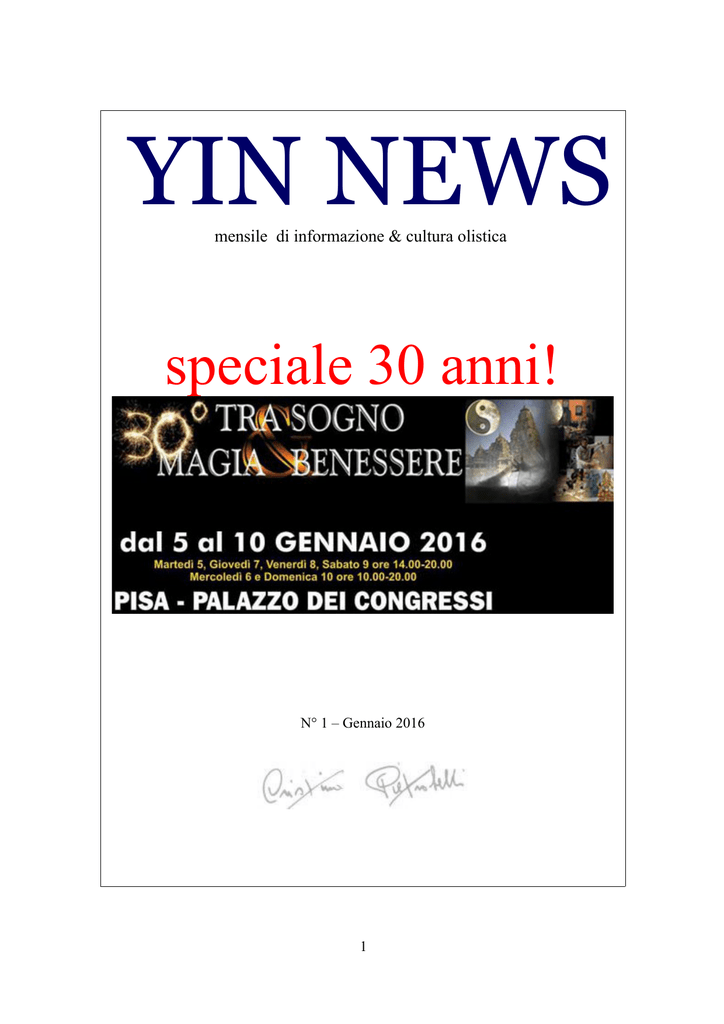 YIN NEWS mensile di informazione & cultura olistica speciale 30 anni! N° 1 – Gennaio 2016 1 La nostra redazione Jolanda Pietrobelli iscrittasi all'Ordine Giornalisti Pubblicisti nel 1974, proviene dalla Scuola di Giornalismo di Urbino conclusa con una tesi su Picasso. E' autrice di numerose monografie sull'arte contemporanea. ha diretto per quindici anni la collana della galleria pisana il Prato dei Miracoli. Con lo studio delle Grandi Religioni e aprendosi alle varie tecniche di consapevolezza e sviluppo interiore, porta avanti la pratica di antiche tradizioni giapponesi come il Reiki con il quale ha iniziato a sondare il campo delle energie sottili, approfondendo molti maestrati. Ha acquisito il master di Reiki metodo Usui negli anni 90, conseguendo il Livello <Teacher>. Ha ricevuto l'attivazione al livello master nel metodo <Tiger Reiki> l'attivazione al livello master nel metodo <chi-ball- orb of life>, l'attivazione a <Universal Reiki>. E' Deeksha Giver. Si occupa di Discipline Olistiche ed i suoi interessi sono maturati nel campo delle Energie. Ha fondato la Casa editrice CristinAPietrobelli. Claudio Bargellini Scrittore, Biologo e Tecnico Erborista, naturopata, è presidente ANTEL (Associazione Nazionale Tecnici Erboristi Laureati) e ABEI ( Associazione Bioenergetica Italiana). È direttore della Scuola Superiore di Naturopatia con sede a Cascina (Pisa) È ricercatore scientifico e membro del Tavolo di Naturopatia in Regione Toscana, ricercatore Centro Studi ABEI s.a.s, membro direttivo settore DBN Confartigianato, consulente scientifico S.I.S.T.E, consulente scientifico AGRI-SAN srl, Master di Reiki, tiene conferenze e scrive su riviste di settore. Parte della sua vita oscillante continuamente tra scienza e parascienza, l'ha trascorsa viaggiando per il mondo, tra Africa, India, America, Europa, sempre alla ricerca di tecniche terapeutiche varie e di tradizioni antiche, mettendo sempre avanti un sano scietticismo e una personale sperimentazione. L'incontro con un grande Maestro francese, protrattosi per oltre venti anni, ha segnato in modo sostanziale la sua vita. Alcune tappe indicative: Reiki Master, Teacher Reiki, Master Karuna, Master Radiestesia, Naturopata, Erborista, Master CFQ, Operatore Theta Healing, Utopista. Silvia Cozzolino Vice Presidente ABEI, è naturopata, Reiki Master, svolge la sua attività di creativa, prevalentemente in Italia. Cura la Scuola Superiore di Naturopatia negli aspetti di immagine; esperta nel campo della fisiognomica, si occupa di grafica pubblicitaria, è ricercatrice olistica. Tiene corsi sulla cromoarmonia. È tra i massimi esperti di riflessologia, in Italia. 2 Elisa Benvenuti E' una psicologa libera professionista e psicoterapeuta in formazione presso la Scuola di specializzazione in Psicoterapia dell'Istituto Gestalt Firenze (IGF). Socia fondatrice e presidente dell'Associazione Aurora che promuove nella città di Pisa il benessere psicologico dell'individuo e della comunità attraverso attività gratuite come gruppi sul benessere, laboratori sul corpo e laboratori creativi. Da anni si interessa a diverse discipline olistiche, lavorando con il Reiki e interessandosi alle diverse scuole. È Deeksha Giver. Franca Ballotti e Roberto Aiello Sono operatori delle Dicipline del Benessere Naturale, Cranio Sacral Balancing, e Naturopatia. Sono Maestri di Reiki. Sono specializzati in tecniche di meditazione, respirazione e rilassamento, Fiori di Bach, Channeling, Thanatolgia e Theta Healing.Franca : La vita per me ha significato solo se vissuta con intensità e profondità. Già dall'infanzia trascorsa in uno dei più bei castelli della Montagnola Senese è stato tracciato il mio cammino all'insegna del mistero e della ricerca.Roberto : Viaggiando in diversi continenti, ho incontrato culture interessanti e delle bellissime persone, maestri che guidano il nostro cammino, e fra di loro Osho che mi ha invitato a seguire la strada del cuore e della meditazione, in modo da liberarmi delle abitudini e ritrovare la mia vera essenza nella forza del silenzio. Sia Franca che Roberto sono Deeksha Giver David Berti Dottore in Mediazione Linguistica Applicata, scrittore, tiene conferenze e seminari su argomenti su comunicazione, percezione e spiritualità. Ricercatore nel campo del benessere, delle energie sottili, dell'alimentazione e della parascienza, è Reiki Master e radiestesista, specialista nel campo delle tecnologie e dell'informatica. Amante della musica, ingegnere del suono, compositore e arrangiatore, ha ideato e coordinato la produzione di vari album, curandone musica e immagine. In qualità di designer realizza opere che espone a mostre ed eventi. 3 Gianni Tucci Dopo aver iniziato la sua formazione nelle arti marziali nel 1959 col Judo, nel quale ha conseguito il grado di I Dan, ha iniziato lo studio del Karate Shotokan sotto la direzione del M° Naotoshi Goto, proseguendo successivamente sotto l'egida dei migliori Maestri in Italia e all'estero; fra di essi possiamo citare Hiroshi Shirai, Tetsuji Murakami, Plée, Masaru Miura e Roland Habersetzer. Oltre al Karate Shotokan, ha praticato altri stili di Karate a contatto pieno e non, oltre a stili meno noti come il Nanbudo Sankukai con il M° Yoshinao Nanbu e il M° Sergio Mor Stabilini; ha poi studiato alcune basi di Karate Shotokai, Ashiara, Shito Ryu e Koshiki Ryu, non disdegnando di interessarsi all'approccio al karate seguito da altre scuole, come lo Uechi Ryu e lo Shidokan, e riuscendo anche a studiare il lavoro di alcune scuole antiche di Okinawa. A parte il suo studio del Karate, ha praticato anche il Kung Fu Nan Quan con il M° Weng Jan, il Tai ji Quan e il Qi Gong (discipline nelle quali vanta un'esperienza di oltre vent'anni), e il Ju Jitsu, per il quale è Istruttore Tecnico W.J.J.F. - W.J.J.K.O.. È inoltre istruttore di Kali Arnis Escrima (I.S.A.M.), istruttore di Pesistica e Cultura fisica (F.I.P.C.F.), Warm-up Dance (U.I.S.P.) e ginnastica metodo Pilates. Dirige, oltre al Kosmos Clu