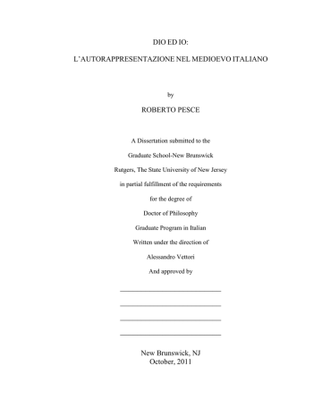 DIO ED IO: L‟AUTORAPPRESENTAZIONE NEL MEDIOEVO ITALIANO by ROBERTO PESCE A Dissertation submitted to the Graduate School-New Brunswick Rutgers, The State University of New Jersey in partial fulfillment of the requirements for the degree of Doctor of Philosophy Graduate Program in Italian Written under the direction of Alessandro Vettori And approved by ________________________ ________________________ ________________________ ________________________ New Brunswick, NJ October, 2011 ABSTRACT OF THE DISSERTATION Dio ed io: l‟autorappresentazione nel Medioevo italiano By Roberto Pesce Dissertation Director: Alessandro Vettori This dissertation explores the representations of the Self in the Middle Ages through the analysis of literary works produced in Italy. Differentiating autobiography from autobiographism, I analyze the prose works of three authors whose “I” demanded to find expression in a written form in the first person. I thus consider their texts as protoautobiographical writing. I focus my attention on Francis of Assisi‟s Testamentum, which represents the self as a public confession; Dante‟s Convivio, where the author imposes an imagine and a forma of himself on his readers, creating an ideal poet; and Petrarca‟s Posteritati, a depiction of the poets‟s life recounted through his shortcomings and sins. I also briefly analyze the Vita nova and the Secretum, but these works have less direct bearing on my argument. The first chapter begins with an introduction to the genre of autobiography and establishes my theoretical framework. In particular, I engage Misch, Gusdorf, Zink, ii Foucault, Olney, Lejeune, Starobinsky, Guglielminetti, and Ferrucci. My subsequent chapters consider each of the aforementioned works individually, drawing particular attention to the autobiographical markers (auto, bio, and graphē) that characterize the genre. Starting from a specific point identified as a conversion, all of these authors trace their lives by representing their ideal self, and hiding any controversial aspect of their existence. Through my research, I offer different interpretations of this reticence, and on the minimal circulation of these texts, suggesting an historical and anthropological hypothesis Ultimately, I am in agreement with Gusdorf‟s notion that autobiography was born from a religious impetus in which the believer, in colloquium with the divine, discovers the possibility and the necessity of making the self the center of one‟s spiritual experience. I argue, however, that while Gusdorf dates the beginning of this practice as the 16th century my research indicates that this phenomenon begins to appear at the beginning of the 13th century because of the creation of Purgatory and the imposition of the annual confession. Seeking God in his own soul, the individual measures and creates a space for his own consciousness. In my analysis, the concept of the self begins here, in the autumn of the Middle Ages. iii Ringraziamenti Dopo sette splendidi anni passati alla Rutgers University, è arrivato il momento del congedo e dei ringraziamenti. Il primo pensiero va alla mia famiglia, Serena e Lorenzo, senza il cui costante sostegno e pazienza biblica non sarei mai giunto dove mi trovo. Ai miei genitori, Anna e Rino, e ai miei fratelli, Paola e Francesco, un sentito e doveroso grazie per aver condiviso con me l‟esperienza americana. A mio zio “Renzo”, cui dedico questa tesi, un affettuoso abbraccio e un arrivederci in qualche altro luogo. Accolto in una grande famiglia al Dipartimento di Italiano, sono grato ad Alessandro Vettori, mio advisor e mentore, guida fondamentale per il completamento del mio percorso formativo e professionale, che mi ha pazientemente diretto nello studio e nella ricerca. Sono riconoscente a Laura Sanguineti White, per avermi dato l‟opportunità di entrare a far parte di questa vivace comunità e per il continuo supporto; a David Marsh, la cui competenza e simpatia mi accompagneranno a lungo; ad Andrea Baldi, Paola Gambarota ed Elizabeth Leake per il loro appoggio e l‟attenzione nei miei riguardi. La mia riconoscenza va inoltre ai miei due angeli custodi, Carol Feinberg e Robin Rogers, per l‟affetto e l‟amicizia dimostratimi. Desidero ringraziare Francesco Ciabattoni per la sua disponibilità e cortesia nel seguire questo studio. Una menzione speciale infine gli amici che mi sono sempre stati vicini e presenti, facendomi sentire come a casa: Ida e Gino, John e Donna, Sara, Paolo, Bryan, Deena, Matthew, Arnout e Joke, Monica, Daniele e Rosa, Annachiara e Brendan, Sandy, Roberto e Vaninha, Gabriella e Dario. iv Indice Abstract ii Ringraziamenti iv Indice v 1. Introduzione 1 1.1. Premessa teorica 4 1.2. Premessa storica 18 1.3. Premessa critica 26 1.3.1. Lo stile 26 1.3.2. I testi e la loro diffusione 29 Prime conclusioni 33 1.4. 2. 3. 4. Recordatio, ammonitio, exhortatio: il Testamentum di Francesco d‟Assisi 35 2.1. Cenni sulla «quaestio francescana» 37 2.2. Il Testamentum come autobiografia 43 2.3. Recordatio 52 2.4. La tradizione manoscritta 71 Il parlar di se medesimo in Dante 75 3.1. lo parlare di sé è conceduto: il Convivio 81 3.2. La tradizione manoscritta 104 Petrarca e la Posteritati: l‟opera quod ante me, ut arbitror, fecit nemo v 107 5. 4.1. Franciscus posteritati salutem 116 4.2. La tradizione manoscritta 140 Conclusioni 143 Bibliografia 149 Curriculum vitae 178 vi 1 1 Introduzione L‟autobiografia nasce come genere letterario nel XVIII secolo con la pubblicazione postuma, tra il 1782 e il 1789, delle Confessions di Rousseau. Pur essendo tutt‟ora aperto il dibattito sulla definizione del genere1, la critica è concorde nell‟attribuire all‟illuminista svizzero il merito di aver creato un‟opera nuova in cui costruisce introspettivamente la propria identità, originale e non riconducibile ad altri se non a se stesso, liberata dall‟ideale religioso come punto focale della ricerca per ripiegare sull‟io2. Come o