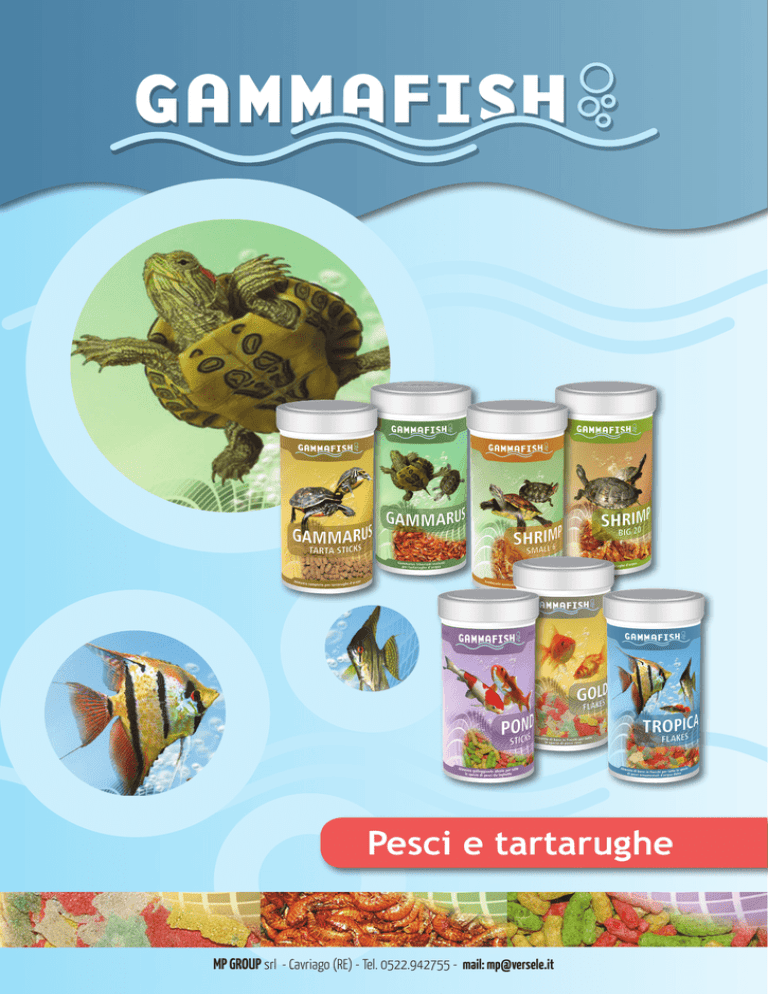 Pesci e tartarughe MP GROUP srl - Cavriago (RE) - Tel. 0522.942755 - mail: [email protected] Pesci e Tartarughe Shrimp Small 6 Gamberetti essiccati per tartarughe d’acqua Shrimp Small 6 è un alimento semplice per tartarughe d’acqua, composto al 100% da gamberetti essiccati (Gammarus lacustris). Le piccole dimensioni di questi gamberi (non superiore a 6 mm.) facilita l’ingestione da parte delle tartarughe di piccole dimensioni. L’alto contenuto di proteine (41%) fornirà alle tartarughe energia e vitalità. Il metodo di essicazione, stoccaggio e confezionamento garantiscono la conservazione della maggior parte delle qualità nutritive di questo alimento naturale. Shrimp Small 6- 28 g / 250 ml 6 pz. F451125 x cartone Shrimp Small 6 - 110 g / 1000 ml 6 pz. F451150 x cartone Shrimp Big 20 Gamberi essiccati per tartarughe d’acqua Shrimp Big 20 è un alimento semplice per tartarughe d’acqua adulte o di grosse dimensioni, composto al 100% da gamberi essiccati (Gammarus pulex). La grandezza di questi gamberi (non inferiore a 20 mm.) facilita l’ingestione e diminuisce lo spreco di cibo. L’alto contenuto di proteine (58%) fornirà alle tartarughe energia e vitalità. Il metodo di essicazione, stoccaggio e confezionamento garantiscono la conservazione della maggior parte delle qualità nutritive di questo alimento naturale. Shrimp Big 20 - 30 g / 250 ml 6 pz. x cartone F451225 Shrimp Big 20 - 120 g / 1000 ml 6 pz. x cartone F451250 Pesci e Tartarughe Gammarus Gammarus siberiani per tartarughe d’acqua Gammarus è un alimento semplice di origine animale per tartarughe d’acqua. Grazie al suo alto contenuto di calcio (6%) questo alimento deve assolutamente far parte della loro dieta. L’alto contenuto di proteine e grassi fornirà alle tartarughe energia e vitalità. Il metodo di essicazione, stoccaggio e confezionamento garantiscono la conservazione della maggior parte delle qualità nutritive di questo alimento naturale. Gammarus - 28 g / 250 ml 6 pz. F451025 x cartone Gammarus - 110 g / 1000 ml 6 pz. F451050 x cartone Gammarus Tarta Sticks Alimento galleggiante per tartarughe d’acqua Gammarus Tarta Sticks è un alimento galleggiante completo per tartarughe d’acqua, contenente gammarus. I granuli galleggianti contengono il 20% di gammarus che rende l’alimento particolarmente appetibile per le tartarughe e garantisce l’apporto di minerali e vitamine. I valori nutritivi di Gammarus Tarta Sticks garantiscono una buona salute delle tartarughe ma soprattutto uno sviluppo corretto del carapace. Il contenuto ottimale di proteine, grassi, calcio, fosforo e fibre garantisce una corretta digestione. Gammarus Tarta Sticks - 90 g / 250 ml 6 pz. x cartone F451325 Gammarus Tarta Sticks - 360 g / 1000 ml 6 pz. x cartone F451350 Pesci e Tartarughe Gold Flakes Fioccato per pesci rossi Gold Flakes è un alimento di base in fiocchi per tutte le specie di pesci rossi. La sua composizione ricca di proteine vegetali, plancton e alghe aiuta a mantenere tutte le specie di pesci rossi in ottima salute e con colori vivaci. Gold Flakes può essere somministrato più volte al giorno. Gold Flakes - 20 g / 100 ml 6 pz. F450100 x cartone Gold Flakes - 50 g / 250 ml 6 pz. Gold Flakes - 200 g / 1000 ml F450125 x cartone 6 pz. F450150 x cartone Tropica Flakes Fioccato per pesci ornamentali d’acqua dolce Tropica Flakes è un nuovo alimento di base in fiocchi per tutti i tipi di pesci ornamentali d’acqua dolce. Questa nuova formula contiene una quantità bilanciata di materie prime selezionate di alta qualità contenenti importanti sostanze nutritive e un elevato contenuto di vitamine naturali, minerali e sostanze che migliorano il colore, la salute e la vitalità dei pesci. Arricchito con acidi grassi OMEGA-3, l’alimento che svolge un ruolo importante in molti processi vitali nell’organismo dei pesci quali: effetti anti-infiammatori, prevenzione di malattie cutanee e aumento delle difese immunitarie. Tropica Flakes - 20 g / 100 ml 6 pz. F450200 Tropica Flakes - 50 g / 250 ml 6 pz. F450225 x cartone x cartone Pond Sticks Alimento galleggiante per pesci da laghetto Pond Sticks è un alimento completo galleggiante per un facile pasto dei vostri pesci da laghetto. Contiene proteine altamente digeribili che, con l’aggiunta di minerali e vitamine, aiutano a mantenere i pesci sempre in ottima salute. La sua ricca e bilanciata composizione garantisce un’alimentazione completa per tutti i vostri pesci da laghetto. Non intorbidisce l’acqua. Pond Sticks - 100 g / 1000 ml 6 pz. x cartone F450250