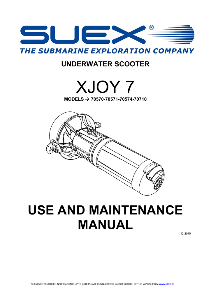 UNDERWATER SCOOTER XJOY 7 MODELS 70570-70571-70574-70710 USE AND MAINTENANCE MANUAL 12-2015 TO ENSURE YOUR USER INFORMATION IS UP TO DATE PLEASE DOWNLOAD THE LATEST VERSION OF THIS MANUAL FROM WWW.SUEX.IT Document INSTRUCTION MANUAL Date DEC 28th 2015 Title of document INSTRUCTION MANUAL and WARNINGS FOR USE XJOY 7 Revision 001 Welcome to the world of SUEX SUEX S.r.l. congratulates and thanks you for your trust in purchasing our scooter. Every Suex Advanced Diving Vehicle is the result of extensive experience and prolonged prototype testing. A capable and creative staff, assisted by highly courageous diving experts with proven professional and recreational abilities, have created this and other underwater scooters to assist and extend your underwater dives. However, never overestimate your abilities and always undertake specific underwater diving courses to be able to use your underwater scooter in total safety. Always remember that fun should NEVER put your life at risk. The SUEX Staff TO ENSURE YOUR USER INFORMATION IS UP TO DATE PLEASE DOWNLOAD THE LATEST VERSION OF THIS MANUAL FROM WWW.SUEX.IT CONTENTS 1 General safety and accident prevention regulations 2 Hazard warning 3 Introduction 4 Signal plates 5 Intended use 6 Diving safety 6.1 Training 6.2 Handling configuration and settings 6.3 Hazardous area and residual risks 6.4 Safety device 7 Handling and transport 8 Description and operating principle 9 ADV use 9.1 Opening and closing the hull. 9.2 Battery removal 9.3 Starting the scooter 10 Tying the scooter to the diver 11 Setting regulation 11.1 Positioning the ballast for salt water use 12 Autonomy 13 Red led on, battery low 14 Precautions during scooter use 14.1 Scooter use in apnea 14.2 Descent speed 14.3 Ascent speed 14.4 Depth 14.5 Occluded environments 14.6 Muddy or murky environments 14.7 ADV flooding, sinking 15 General precautions 16 Cleaning and storage 17 Easy inspect (engine compartment visual inspection) 17.1 Water in the engine compartment 18 Troubleshooting 19 Maintenance 19.1 Routine maintenance 19.2 Extraordinary maintenance (to be performed by an authorized SUEX service centre) 20 Disposal and scraping 21 Notes on the battery 22 Battery charge (general rules) 23 Pb battery information 24 Ideal battery charging conditions 25 Ideal battery depletion conditions 25.1 Important note 26 Battery polarity inversion 27 Lead battery, frequently asked questions: TO ENSURE YOUR USER INFORMATION IS UP TO DATE PLEASE DOWNLOAD THE LATEST VERSION OF THIS MANUAL FROM WWW.SUEX.IT 3 3 5 6 7 8 8 8 11 11 12 12 14 14 15 16 17 17 17 18 18 19 19 19 19 19 19 20 20 20 21 21 21 22 22 22 23 23 24 24 25 26 26 26 26 27 10416UK 28 29 30 31 32 33 Technical specifications Supplied material Spare parts and accessories Warranty Customer service CE conformity 29 30 30 31 32 33 TO ENSURE YOUR USER INFORMATION IS UP TO DATE PLEASE DOWNLOAD THE LATEST VERSION OF THIS MANUAL FROM WWW.SUEX.IT Pag. 2 10416UK 1 General safety and accident prevention regulations Pay special attention to the hazard signs in this manual. There are 3 levels of hazard signs: This sign warns that, if the described operations are not correctly performed, the user may be subject to risks that could cause health problems, serious injury or even death. This sign warns that, if the described operations are not correctly performed, the user is subject to possible risks that do not, however, cause damages or injuries. This sign warns that, if the described operations are not correctly performed, the scooter may be subject to damages. Carefully read the instructions in this manual before using the scooter. 2 Hazard warning READ CAREFULLY CAREFULLY READ THE BATTERY CHARGE AND USE INSTRUCTION MANUAL, INCLUDING SECTION “BATTERY CHARGE”. The underwater scooter is not a toy, nor a suitable rescue means. It’s exclusive function is to help expert divers in immersions to cover greater distances than could be normally covered with fins only. The scooter and its components, specifically the battery and battery charger, are intended for adult and expert use after carefully reading these instructions. In order to prevent any harm to things or individuals, the user of the battery and battery charger supplier with our underwater scooters must first read the use and maintenance manual and strictly observe the indications on correct use and product features, preventing inexpert personnel or minors from handling, even inadvertently, the scooter and supplied instruments. This scooter is equipped with a “cut off” device whose purpose is to protect internal parts, preventing use when residual battery power is too low. When this device is triggered, the scooter, inevitably, shuts off. TO ENSURE YOUR USER INFORMATION IS UP TO DATE PLEASE DOWNLOAD THE LATEST VERSION OF THIS MANUAL FROM WWW.SUEX.IT Pag. 3 10416UK This feature must always be kept in mind to avoid any hazards for the diver who, when planning a dive, will leave sufficient time to surface even without scooter power should the battery, due to the amount of time under water, die. SUEX srl delivers the purchaser the XJOY 7 underwater scooter (hereinafter referred to as ADV) in good working order complete with use and maintenance manual; assumes that the ADV user has had specific driver training for ADVs of this type and has received necessary certification from a qualified board; also assumes that the ADV user has read this supplied use and maintenance manual that explains: - ADV use with the specification of the correct configuration of the equipment used by the diver, of the position he must assume during use as well as the settings the ADV must maintain when diving; furthermore, this scooter must absolutely not be permanently restricted to its user. - the environments in which ADV use is especially hazardous, such as deep diving, in obstructed, muddy or murky environments; the precautions to be adopted for diving in these environments and the need to have taken suitable training courses 