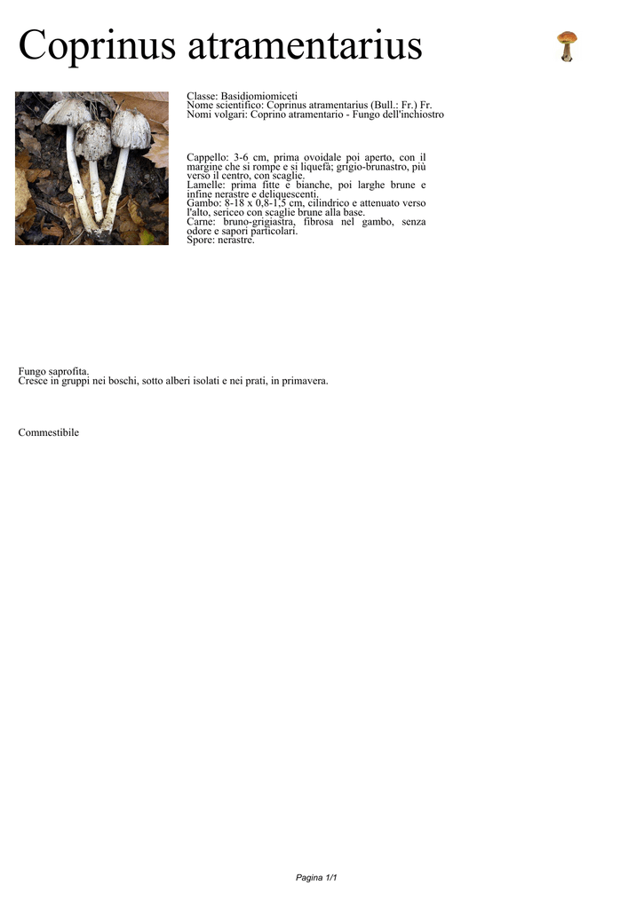 Coprinus atramentarius Classe: Basidiomiomiceti Nome scientifico: Coprinus atramentarius (Bull.: Fr.) Fr. Nomi volgari: Coprino atramentario - Fungo dell'inchiostro Cappello: 3-6 cm, prima ovoidale poi aperto, con il margine che si rompe e si liquefà; grigio-brunastro, più verso il centro, con scaglie. Lamelle: prima fitte e bianche, poi larghe brune e infine nerastre e deliquescenti. Gambo: 8-18 x 0,8-1,5 cm, cilindrico e attenuato verso l'alto, sericeo con scaglie brune alla base. Carne: bruno-grigiastra, fibrosa nel gambo, senza odore e sapori particolari. Spore: nerastre. Fungo saprofita. Cresce in gruppi nei boschi, sotto alberi isolati e nei prati, in primavera. Commestibile Pagina 1/1