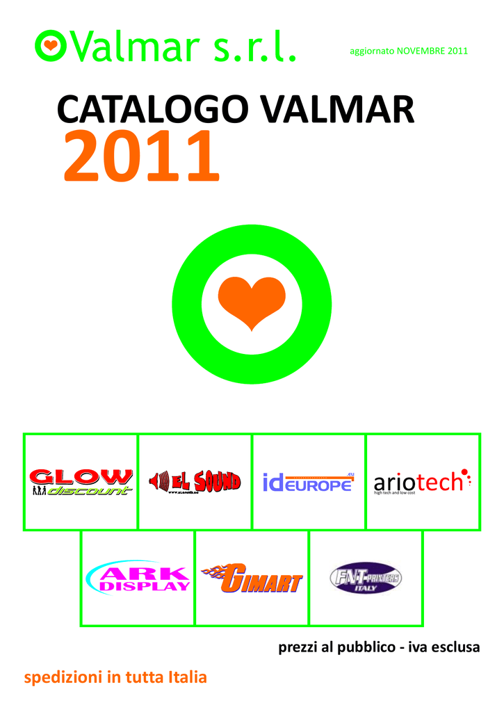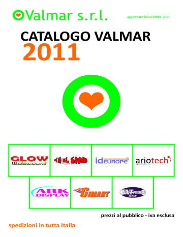 aggiornato NOVEMBRE 2011 CATALOGO VALMAR 2011 high tech and low cost prezzi al pubblico - iva esclusa spedizioni in tutta Italia Braccialetti Luminosi colori assortiti Braccialetti Luminosi UNICO COLORE glow bracelets mixed colours tube 100 pcs. Eur 10.70 iva escl. glow bracelets single colours tube 100 pcs with 100 connectors braccialetti luminosi compreso di connettori tubo da 100 pz. braccialetti luminosi compreso di connettori tubo da 100 pz. disponibile nei colori - colours available: glowbracelets mixed colours and 100 connector code: 30010 Eur 10.70 iva escl. arancione/orange 30002 bianco/white 30003 blu/blue 30004 giallo/yellow 30005 rosa/pink 30006 rosso/red 30007 verde/green 30008 viola/purple 30009 *le confezioni sono marchiate glowdiscount / packing with glowdiscount logo Occhiali Luminosi Braccialetti Luminosi colori assortiti glow eyeglasses completi di connettori e n° 2 stick luminosi n° 2 stick and connector single foil bag glow bracelets mixed colours tube 50 pcs. glowbracelets mixed colours and 50 connector Eur 5.53 iva escl. braccialetti luminosi compreso di connettori tubo da 50 pz. ctn 50 tubi - Y - K Eur 0.88 iva escl. ctn 600 pz. / box 100 pz. - Y - Z -K code: 30011 disponibile nei colori - colours available: Glowstick 15 cm. - conf. Singola arancione/orange 30022 bianco/white 30023 blu/blue 30024 classic 15 cm. glowsticks - single foil bag giallo/yellow 30025 completi di laccio per il collo rosa/pink 30026 rosso/red 30027 viola/purple 30029 verde/green 30028 Eur 1.04 iva escl. *le confezioni sono marchiate glowdiscount / packing with glowdiscount logo ctn 600 pz. / box 50 pz. - Y - Z -K Glowstick 15 cm. - box da 50 pz. disponibile nei colori - colours available: classic 15 cm. glowsticks - bulk packing 50 pcs. arancione/orange bianco/white 30033 30032 completi di laccio per il collo rosa/pink 30036 rosso/red 30037 blu/blue 30034 giallo/yellow 30035 verde/green 30038 viola/purple 30039 *le confezioni sono marchiate glowdiscount / packing with glowdiscount logo Mini Glowstick (fishing starlight) ogni confezione contiene 2 pz. bags 2 pcs. diametro 4.5 mm. - lungh. 40 mm. diam. 4.5 mm. - lenght 40 mm. sfuso - Eur 0.41 disponibile nei colori - colours available: arancione/orange bianco/white 30043 30042 rosso/red 30047 verde/green 30048 blu/blue 30044 viola/purple 30049 giallo/yellow 30045 box - 50 pz. - Eur 0.37 ctn - 900 pz. - Eur 0.33 rosa/pink 30046 disponibile nei colori - colours available: Eur 37.88 iva escl. blu/blue 30081 ctn 10 box - Y - K pag. 2 giallo/yellow 30082 verde/green 30083 box = 50 bag da 2 pz. unico colore ctn = 900 bag da 2 pz. unico colore Fischietto Luminoso - conf. Singola Sfera Luminosa whistle stick - single bag glow ball completi di laccio per il collo Eur 1.51 iva escl. ctn 300 pz. / box 50 pz. - Y - Z -K disponibile nei colori - colours available: arancione/orange bianco/white 30053 30052 rosa/pink 30056 rosso/red 30057 blu/blue 30054 giallo/yellow 30055 verde/green 30058 viola/purple 30059 code: 30061 Eur 2.17 iva escl. ctn 96 pz. / box 12 pz. - Y - Z -K Cappellino Luminoso glow caps *le confezioni sono marchiate glowdiscount / packing with glowdiscount logo Cannucce Luminose - tubo da 50 pz. glow straw - tube 50 pcs. - mixed colours colori assortiti code: 30062 Eur 2.67 iva escl. ctn 300 pz. / box 50 pz. - Y - Z -K *le confezioni sono marchiate glowdiscount / packing with glowdiscount logo Montature per occhiali eyeglasses connector - box 48 pcs. box da 48 pz. Eur 12.58 iva escl. code: 30063 ctn 50 tubi. - Y - K *le confezioni sono marchiate glowdiscount / packing with glowdiscount logo Eur 21.18 iva escl. ctn 24 box - Y - K Montature Orecchie da coniglietta hairpin connector - box 12 pcs. box da 12 pz. code: 30071 *le confezioni sono marchiate glowdiscount / packing with glowdiscount logo Connettori per sfera luminosa glowball connector - box 10 pcs. box da 10 pz. Eur 6.31 iva escl. ctn 12 box - Y - K code: 30072 *le confezioni sono marchiate glowdiscount / packing with glowdiscount logo Connettori tripli per braccialetti luminosi Eur 3.76 iva escl. code: 30073 *le confezioni sono marchiate glowdiscount / packing with glowdiscount logo triple bracelets connector - box 15 pcs. Top Stirrer box da 15 pz. box da 50 pz. top stirrer connector - box 50 pcs. Eur 6.29 iva escl. Eur 1.89 iva escl. code: 30074 code: 30075 *le confezioni sono marchiate glowdiscount / packing with glowdiscount logo *le confezioni sono marchiate glowdiscount / packing with glowdiscount logo pag. 3 Gel Luminoso per Capelli glow hair gel Gel Luminoso per il corpo glow body gel 22 ml. 22 ml. Eur 14.75 iva escl. ctn 288 pz. / box 24 pz. - Y - Z -K disponibile nei colori - colours available: Eur 14.75 iva escl. disponibile nei colori - colours available: arancione/orange bianco/white 30242 30241 blu/blue 30243 giallo/yellow 30244 rosa/pink 30245 ctn 288 pz. / box 24 pz. - Y - Z -K verde/green 30246 arancione/orange 30251 blu/blue 30252 giallo/yellow 30253 verde/green 30254 Collana Hawaii - MAUI hawaiian leis - MAUI Collana Hawaii - MULTICOLOR hawaiian leis - MAUI Braccialetto Hawaii hawaiian bracelets code: 30342 Eur 0.50 iva escl. code: 30343 code: 30341 Eur 1.09 iva escl. ctn 288 pz. / box 12 pz. - Y - Z -K Eur 1.09 iva escl. ctn 288 pz. / box 12 pz. - Y - Z -K ctn 288 pz. / box 12 pz. - Y - Z -K Corona Hawaii hawaiian hair decoration Sombrero Hawaii hawaiian hat code: 30351 Eur 0.63 iva escl. ctn 288 pz. / box 12 pz. - Y - Z -K code: 30344 Eur 4.15 iva escl. ctn 250 pz. - Y - K Candelette da champagne “flambé” flambé Lunghezza 15 cm. lenght 15 mm. Eur 0.61 iva escl. ctn 500 pz. / box 100 pz. - Y - Z -K code: 31050 pag. 4 Bastoncini BUM BUM inflatable cheering stick Eur 1.09 iva escl. ctn 500 pz. - Y - K disponibile nei colori - colours available: bianco/white 32001 blu/blue 32002 giallo/yellow 32003 rosso/red 32004 verde/green 32005 Manona Gonfiabile inflatable hand hogan Eur 1.91 iva escl. ctn 500 pz. - Y - K disponibile nei colori - colours available: Manina