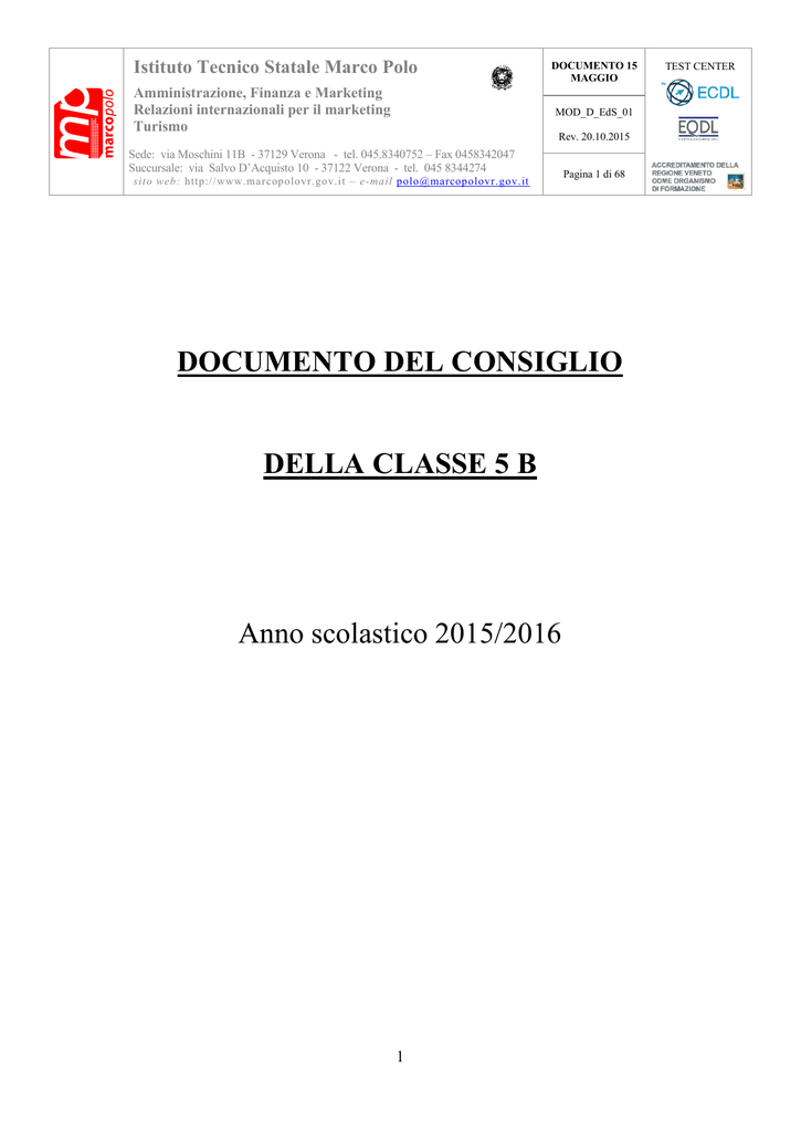 Istituto Tecnico Statale Marco Polo Amministrazione, Finanza e Marketing Relazioni internazionali per il marketing Turismo DOCUMENTO 15 MAGGIO MOD_D_EdS_01 Rev. 20.10.2015 Sede: via Moschini 11B - 37129 Verona - tel. 045.8340752 – Fax 0458342047 Succursale: via Salvo D’Acquisto 10 - 37122 Verona - tel. 045 8344274 sito web: http://www.marcopolovr.gov.it – e-mail [email protected] Pagina 1 di 68 DOCUMENTO DEL CONSIGLIO DELLA CLASSE 5 B Anno scolastico 2015/2016 1 TEST CENTER 2 Anno scolastico 2015/2016 Documento del Consiglio della classe 5 ^ sez. B STORIA DELLA CLASSE Terza Quarta Quinta 14 21 21 9 0 Promossi 22 20 Alunni con giudizio sospeso Promossi a settembre 1 1 1 1 Respinti Non reiscritti Classe Iscritti Iscritti da stessa classe altra classe Ritirati 1.1 STORIA DEL TRIENNIO DELLA CLASSE 1 1 Totale studenti frequentanti la cl.5^: 21 Totale studenti regolari (Hanno frequentato lo stesso corso senza ripetenze, spostamenti, dalla terza alla quinta classe): 21 1.2 CONTINUITÀ DIDATTICA NEL TRIENNIO CORPO DOCENTE Discipline Lingua e Letteratura Italiana Storia Cittadinanza e Costituzione Inglese 1^ Tedesco 2^ Spagnolo 3^ Matematica Discipline Turistiche Aziendali Diritto e Legislazione Turistica Arte e Territorio Geografia Turistica Scienze Motorie Religione A.s. 2013/14 cl terza SBARDELARO SBARDELARO BIANCHINI N. SALVI CAPELLI COSTALUNGA SINIGALIA GROSSI TOSI BAGATTINI MANGO CAPUZZI 3 A.s. 2014/15 cl quarta SBARDELARO SBARDELARO BIANCHINI N. SALVI CAPELLI COSTALUNGA SINIGALIA MODINA PASETTO L. BAGATTINI MANGO CAPUZZI A.s. 2015/16 cl quinta SBARDELARO SBARDELARO BIANCHINI N./CURRAO SALVI PALACIOS BLANCO COSTALUNGA SINIGALIA BONOMINI PASETTO L. BAGATTINI MANGO ------------------------- 1.3 ANDAMENTO DELLA CLASSE Composta di ventuno alunne, la classe ha saputo raggiungere e consolidare un discreto livello di convivenza e di collaborazione, pur in presenza di sottogruppi ben definiti, che, in talune circostanze, si sono mostrati meno interattivi di quanto sarebbe stato auspicabile. Nell'ultimo anno, le studentesse hanno frequentato le lezioni con regolarità. Si sono relazionate con i docenti in modo corretto e costruttivo, instaurando un buon rapporto con l'istituzione scolastica nel suo complesso. Il clima delle lezioni è stato, quindi, sereno e funzionale all’ordinario svolgimento delle attività. Va registrata una discreta omogeneità per quanto riguarda l'interesse manifestato e l'impegno quantitativamente e qualitativamente profuso. La classe ha palesato un discreto grado di coinvolgimento e di intraprendenza nell’ambito del confronto educativo. La quasi totalità delle alunne, grazie al lavoro assiduo nel corso del triennio, ha rafforzato le conoscenze e le competenze. Alcune studentesse, che si sono distinte per una più spiccata propensione allo studio, hanno saputo fungere da stimolo per l'impegno altrui. In tale contesto, occorre rilevare che il diffuso spirito di emulazione, in particolare nell'ultimo anno, pur avendo avuto riflessi positivi sul versante complessivo del profitto, ha determinato, come talvolta accade, momenti di tensione e qualche contraccolpo in alcune ragazze più fragili, che hanno patito il confronto con il nutrito gruppo delle più brillanti. Per quanto concerne i risultati, undici alunne si attestano su un livello ottimo o buono; cinque su un livello discreto; quattro su un livello più che sufficiente. Solo una situazione presenta un quadro che si colloca in prossimità della sufficienza complessiva. La maggioranza degli studentesse ha, dunque, messo a punto un metodo di studio sicuro, evidenziando discrete - in qualche caso, ottime - capacità di analisi e di sintesi. Per alcune, rimangono basilari le indicazioni e il supporto del docente, segno del permanere di incertezze in fase di rielaborazione. In queste circostanze si palesa, come è ovvio, un approccio ai contenuti di stampo prevalentemente mnemonico. L'impiego dei mezzi linguistico - espressivi risulta per lo più sicuro e corretto. L’esposizione orale e scritta è, nel complesso, in grado di fronteggiare complessità tematiche e argomentative. Le doti necessarie all’indagine autonoma sono state alimentate e rafforzate tramite consegne finalizzate ad approfondimenti individualizzati e di gruppo. Lo stage lavorativo obbligatorio al termine della classe quarta e lo stage linguistico all'estero hanno avuto un generalizzato esito positivo. 2. OBIETTIVI CONSEGUITI Si ribadisce che la classe ha raggiunto un livello medio di conoscenze buono, con punte che raggiungono o sfiorano l'eccellenza in più ambiti disciplinari. Nell’ambito delle competenze, sono stati approfonditi i linguaggi specifici ed è stato consolidato l'uso delle lingue straniere. Va segnalato che, grazie ai progressi nell’organizzazione e nella stesura di testi articolati rispondenti alle diverse tipologie, l'esposizione scritta risulta mediamente fluida e lineare. Anche l'esposizione orale, che può essere compromessa da fattori legati all'ansia da prestazione, è in genere più che accettabile. Un discreto numero di studentesse sa padroneggiare un'impostazione critica. Le capacità acquisite vanno considerate in linea con il raggiungimento degli obiettivi cognitivi globalmente previsti. La classe, nel suo insieme, ha saputo procedere in modo progressivo e sicuro nel corso dell'intero triennio. 4 2.1 OBIETTIVI FORMATIVI/COMPORTAMENTALI Le studentesse hanno dimostrato di saper rispettare le regole fondamentali della civile convivenza, di sapersi assumere delle responsabilità, facendo fronte agli impegni assunti. Hanno acquisito una considerevole autonomia nel lavoro e dato prova di un atteggiamento interculturale privo di pregiudizi. 2.1 OBIETTIVI FORMATIVI/COMPORTAMENTALI La maggioranza delle studentesse sa relazionare con accuratezza e precisione su lavori assegnati ed è in grado di raccogliere, ordinare e analizzare dati e informazioni, avvalendosi di percorsi trasversali con collegamenti tra le diverse aree dis